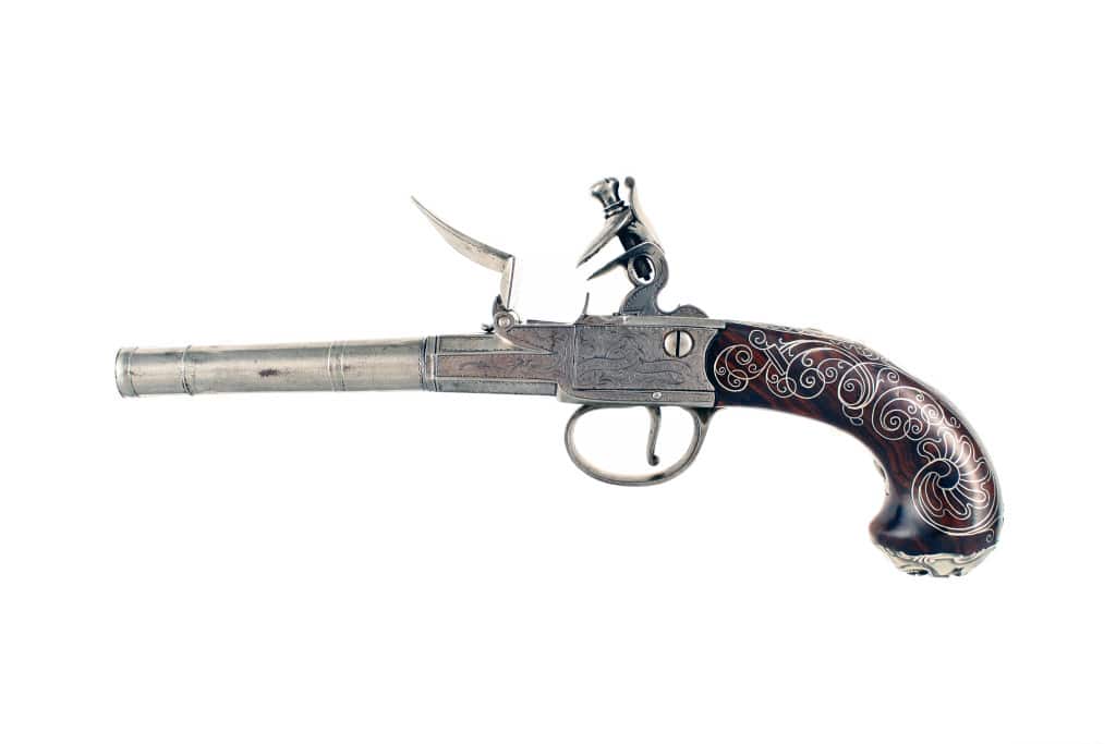 A Pair of Double Barrel Box-Lock Pistols by Barbar of London. With round turn-off cannon barrels numbered ‘1’, ‘2’ and ‘3’ and struck beneath with Tower of London private proof marks, border engraved box-lock actions, profusely engraved with foliage on both sides, signed ‘BARBAR LONDON’ on foliate scrolls, engraved sliding pan covers, border engraved cocks and steels, sliding trigger guard safety catches, the trigger guards engraved with a flower head within a diamond on the bow, swelling figured rounded butts, profusely inlaid with silver scrollwork, oval escutcheons both engraved with a skull and crossbones, silver grotesque masks stamped with silver hallmarks, in good crisp condition overall.
