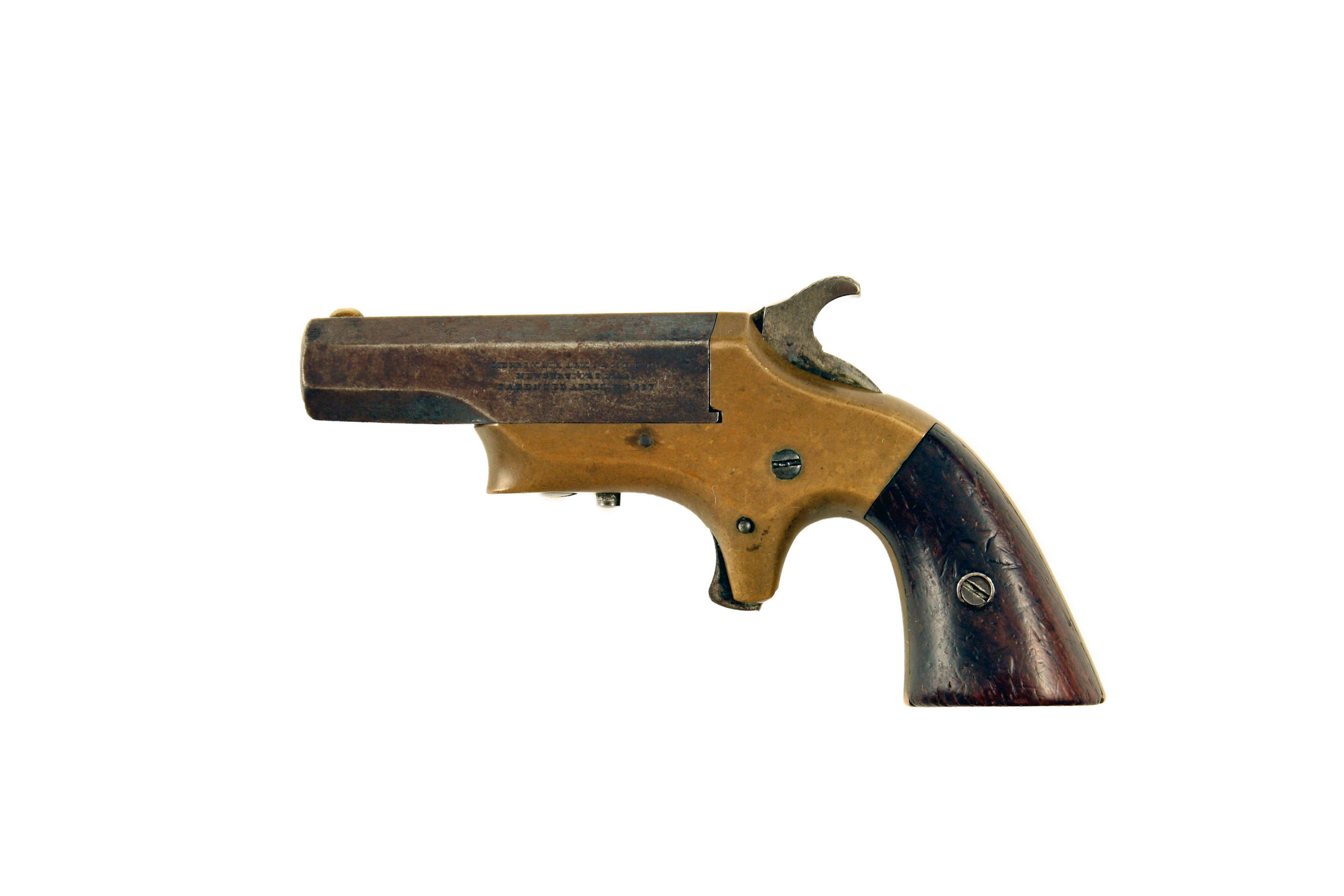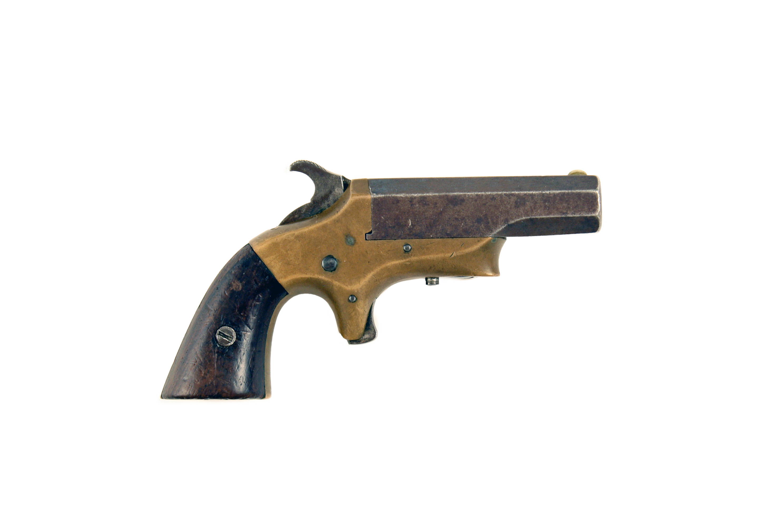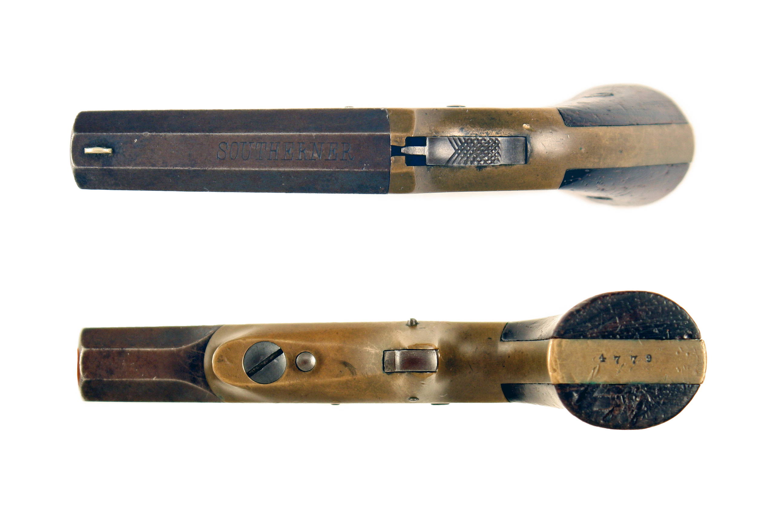 A Brass Frame Southerner Derringer by Merrimack Arms Company. Serial No. 4779. With octagonal sighted barrel, stamped ‘SOUTHERNER’ along the top flat, the side stamped ‘MERRIMACK ARMS & MANUFACTURING CO. / NEWBURYPORT MASS / PATENTED APRIL 9 1867’ brass frame, spur trigger and slab sided rosewood grips.