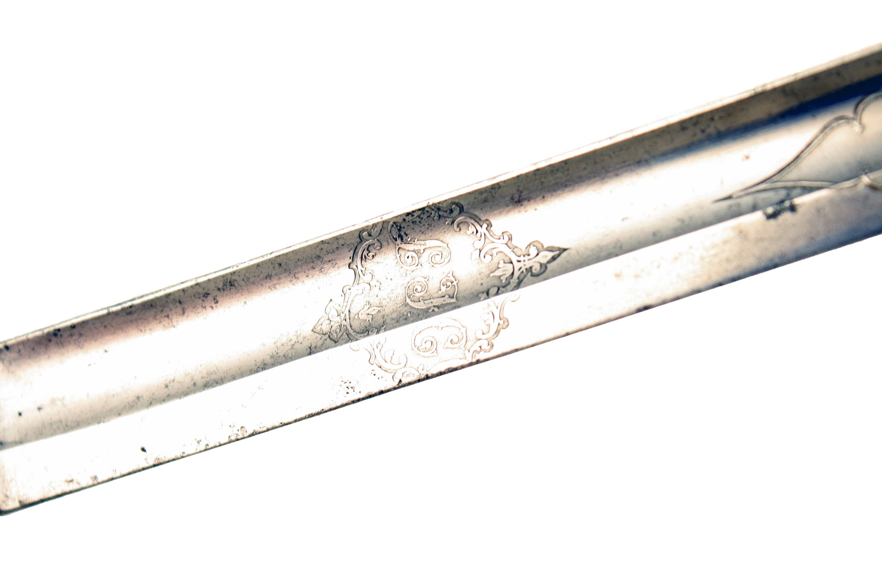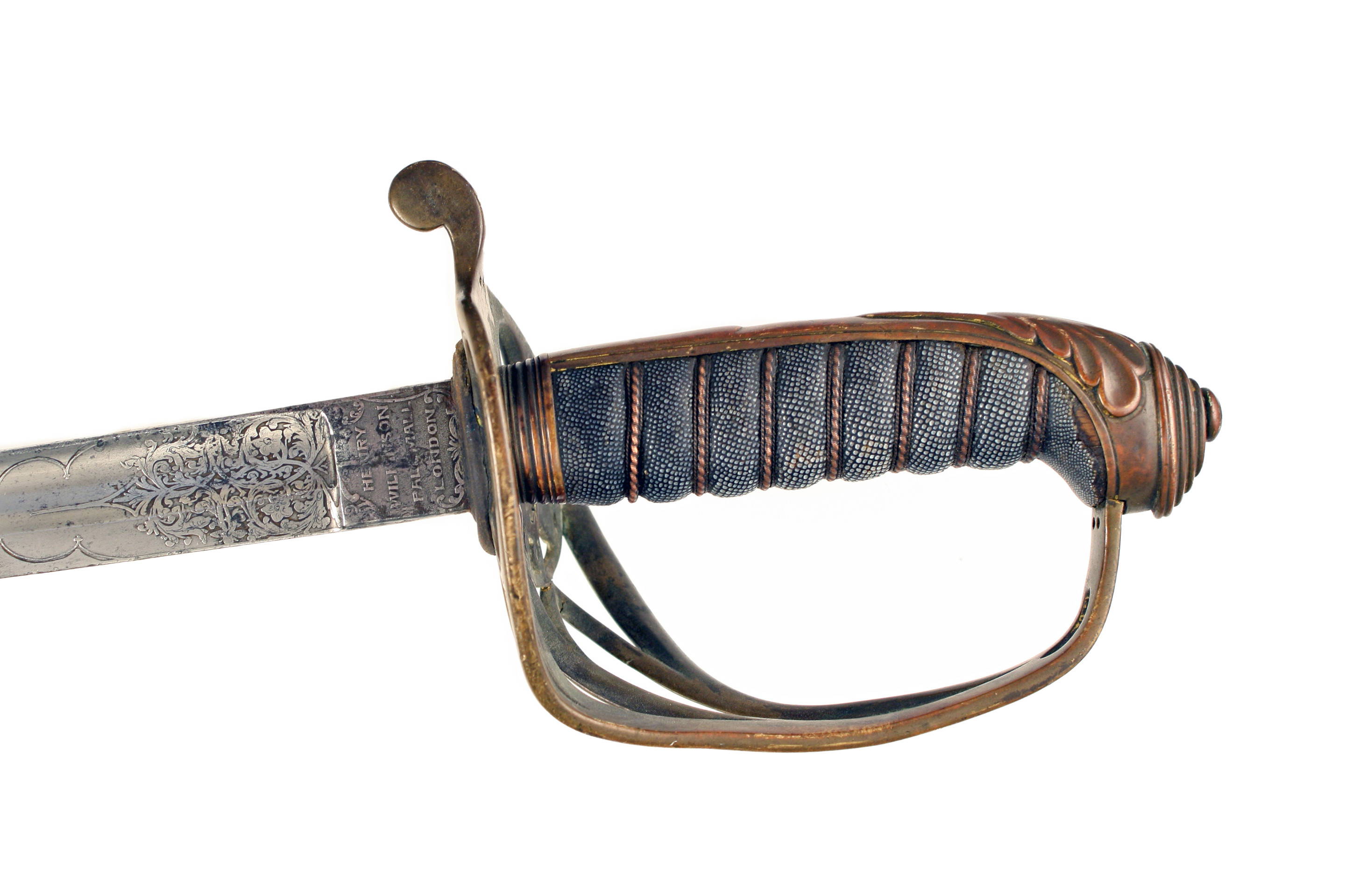 The blade is numbered 10488 which indicates a probable date of manufacture of early to mid 1860. The owners initials LFC are also etched onto the blade, the owner is not definitely known but a possible candidate of the period is Colonel Loudon Francis Campbell who was first commissioned in 1859 and went to serve in the British Indian Army with the Madras Native Infantry and served throughout the Third Anglo-Burma War of 1886-87.