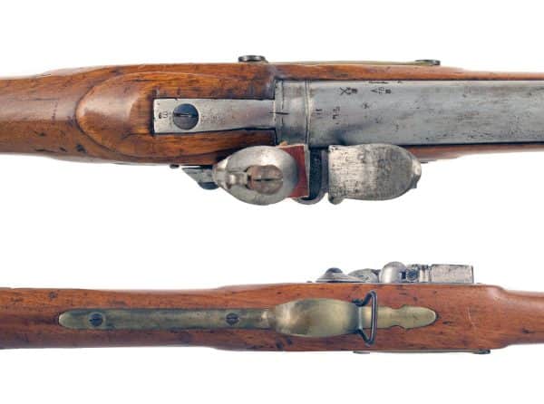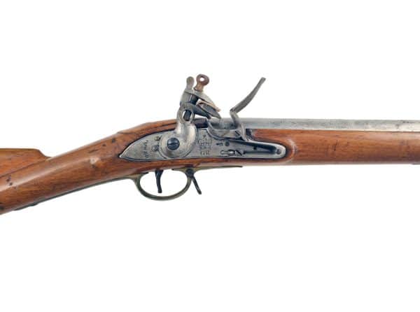 A 10-Bore India Pattern Flintlock Service Musket. With bright barrel and fore-sight also forming the lug for the bayonet, plain tang, border engraved rounded lock with ‘GR’ crowned and ‘Tower’ across the tail, border engraved ring-neck cock, figured three-quarter stock (minor old bruising), regulation brass mounts including butt-plate, sling mounts, original steel ramrod and socket bayonet with blade of hollow triangular section.