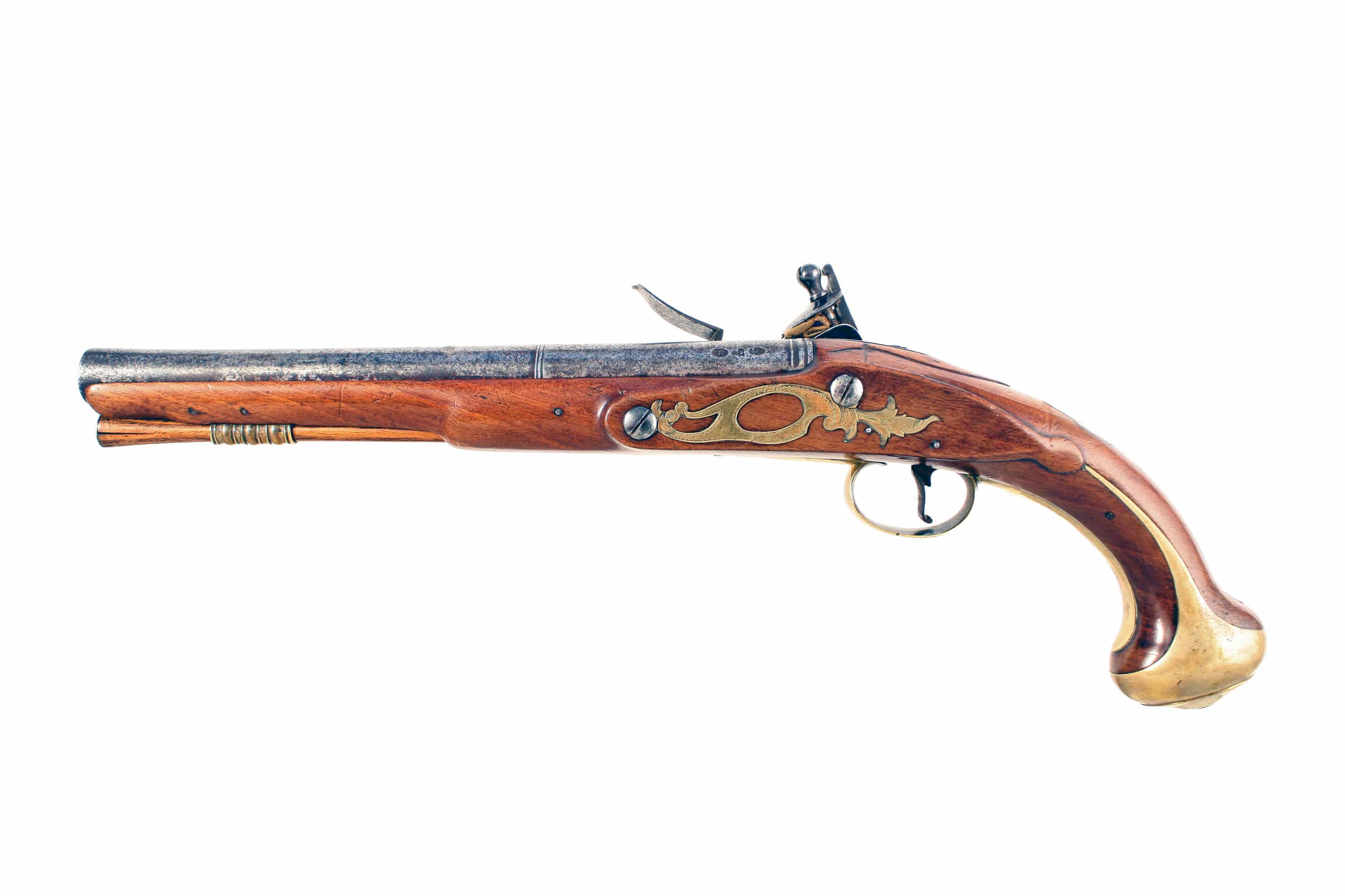 A 16 Bore Flintlock Holster or Livery Pistol by Barber of London. With round two-stage barrel slightly flared towards the muzzle, the breech struck with London proof marks and barrel smith’s mark of Barbar, plain tang, rounded lock signed in capitals, figured full-stock carved in low relief brass mounts comprising border engraved flat scroll side-plate, vacant border engraved escutcheon, pommel with long eared butt cap, and plain trigger guard, baluster ramrod-pipes and what appears to be original wooden ramrod with brass tip.