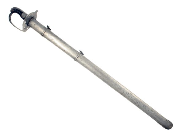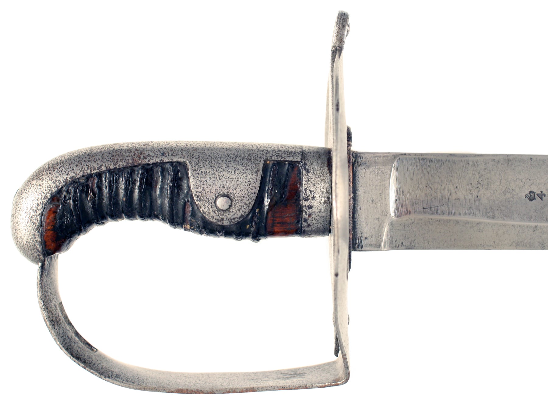 A 1796 Pattern Heavy Cavalry Troopers Sword by Bate, Marked to the 7th Dragoon Guards. With straight single edged blade with original ‘hatchet point’, stamped with Military inspection marks and stamped with the makers name along the back edge, steel hilt with pierced circular guard adapted in the field, wooden grip overlaid with leather (wire binding now missing) complete with an original steel scabbard with two hanging rings. The knuckle guard is cut with the regimental markings A22 D7G and the scabbard is cut with A28 D7G. A fine example of a scarce sword.