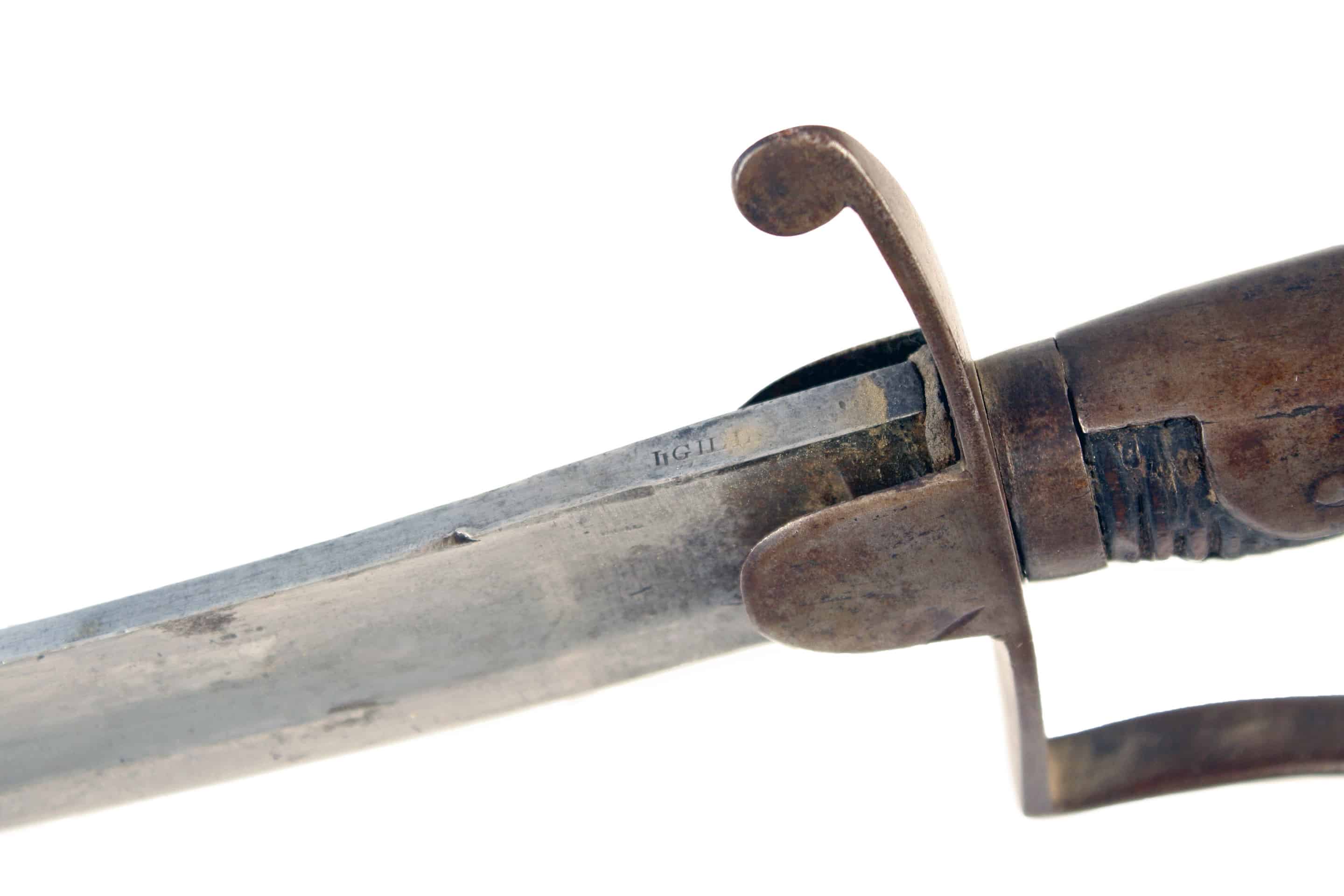 A 1796 Light Cavalry Troopers Sword. With plain curved blade, cut with a large fuller running along the back of the blade, the point unusually cut with a clipped end and stamped along the back-edge’ GILL’ and stamped with a Crowned ‘4’, steel stirrup hilt with leather covered wooden grip (wire missing) contained in an original steel scabbard stamped, ‘OSBORN & GUNBY BIRMM’ with two suspension rings. No visible makers name or inspection marks.