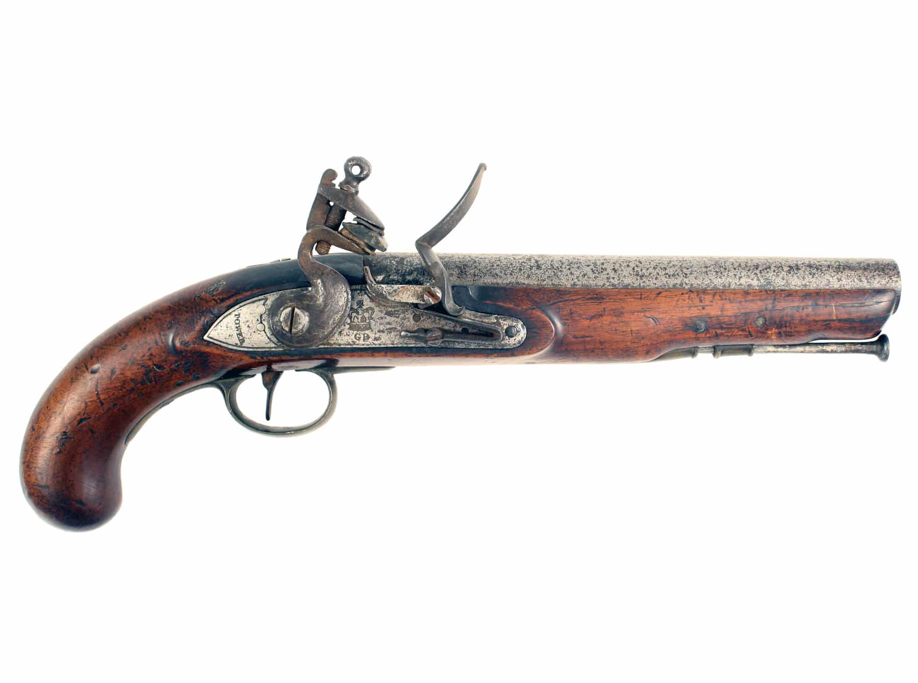 Of regulation specification, with round barrel stamped with two ordnance marks, plain tang stamped with crown, rounded lock with single line border engraving with crowned ‘GR’ ordnance mark under pan and ’TOWER’ across the tail, full stocked in walnut, stamped with numerous ordnance marks, brass furniture comprising side-plate, ram-rod pipes and trigger guard, marked ‘6D H/3’. In completely uncleaned condition.