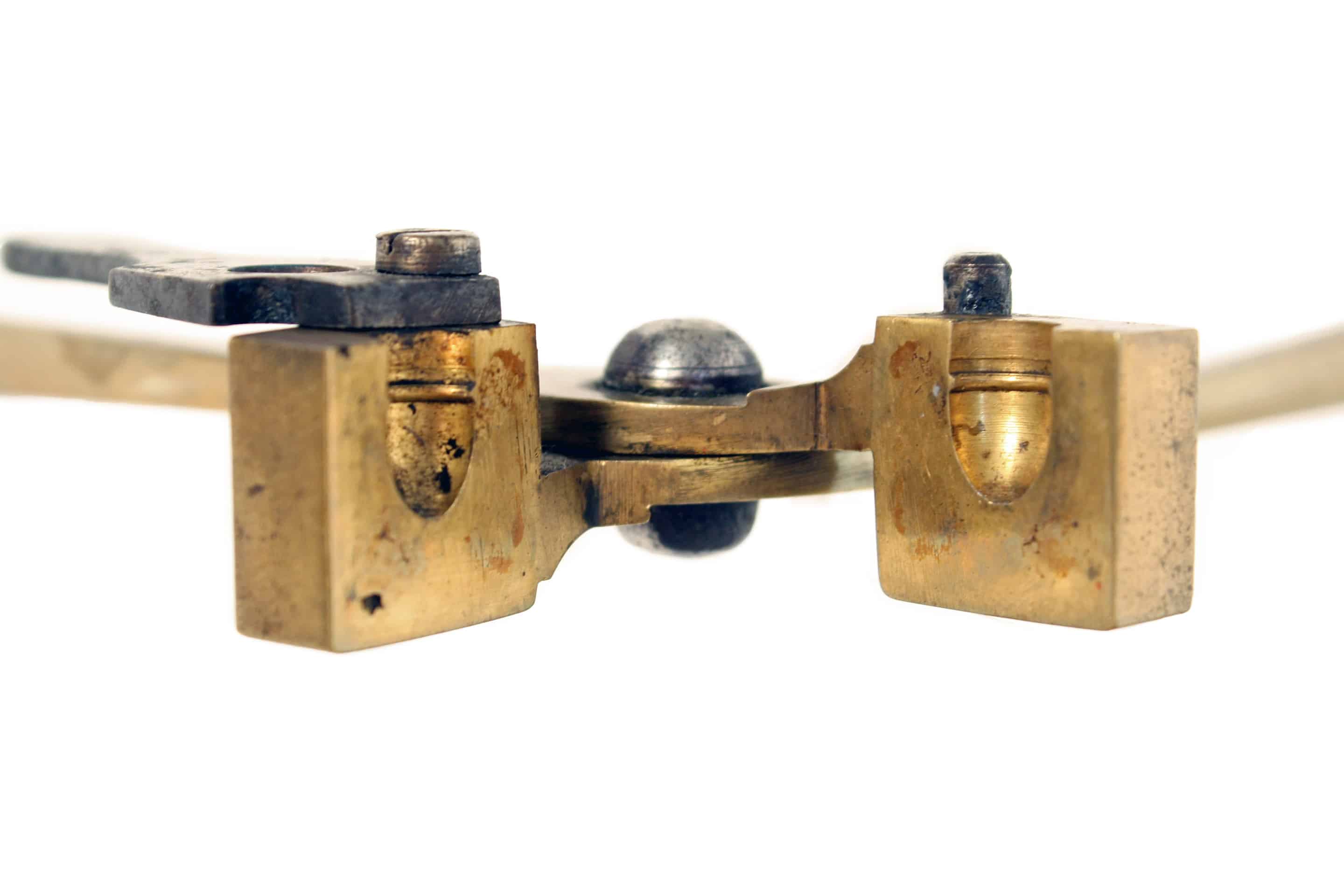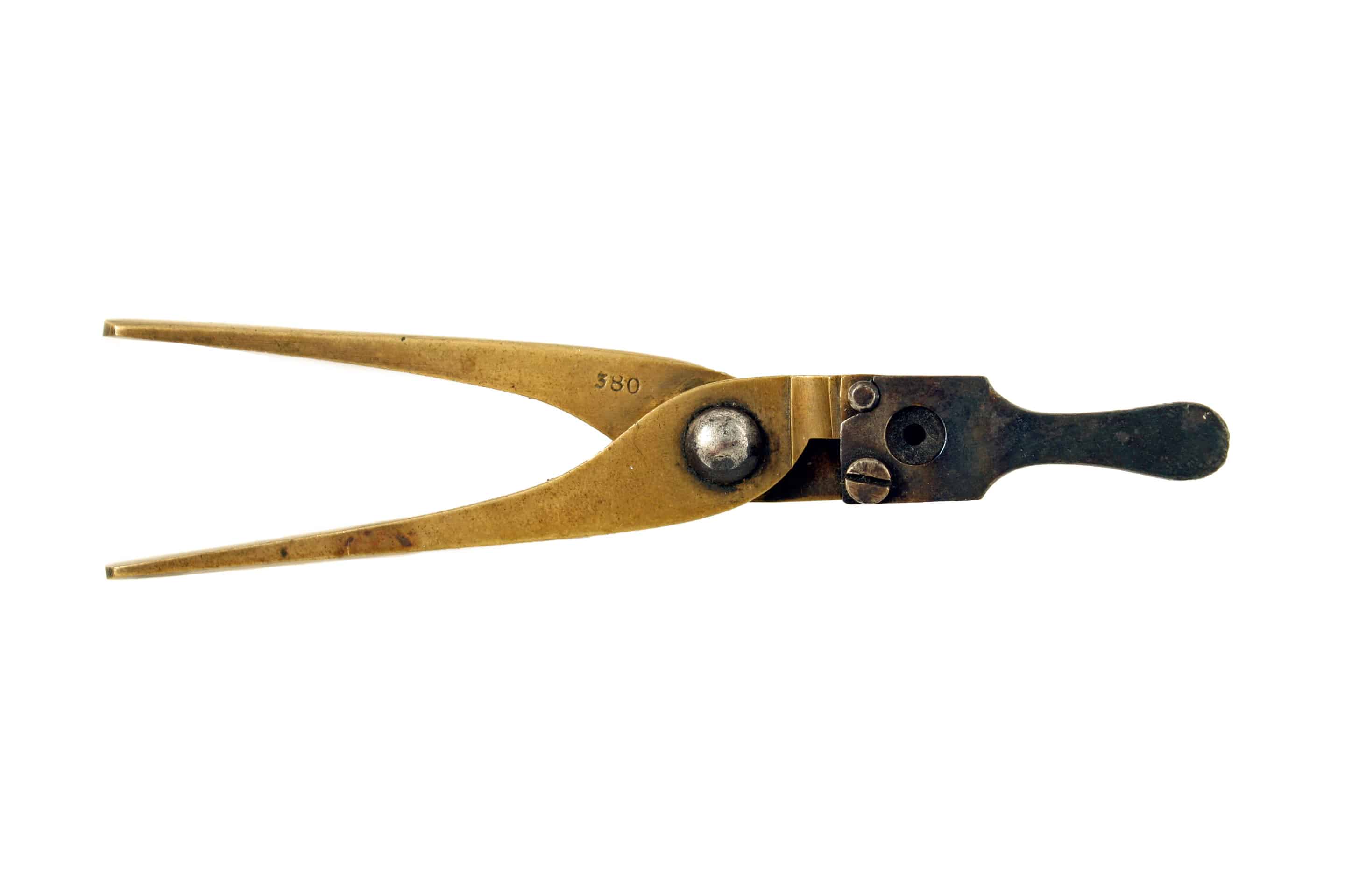 A .380 brass bullet mould, stamped ‘380’ on one of the arms, with spru cutter. In nice clean condition.