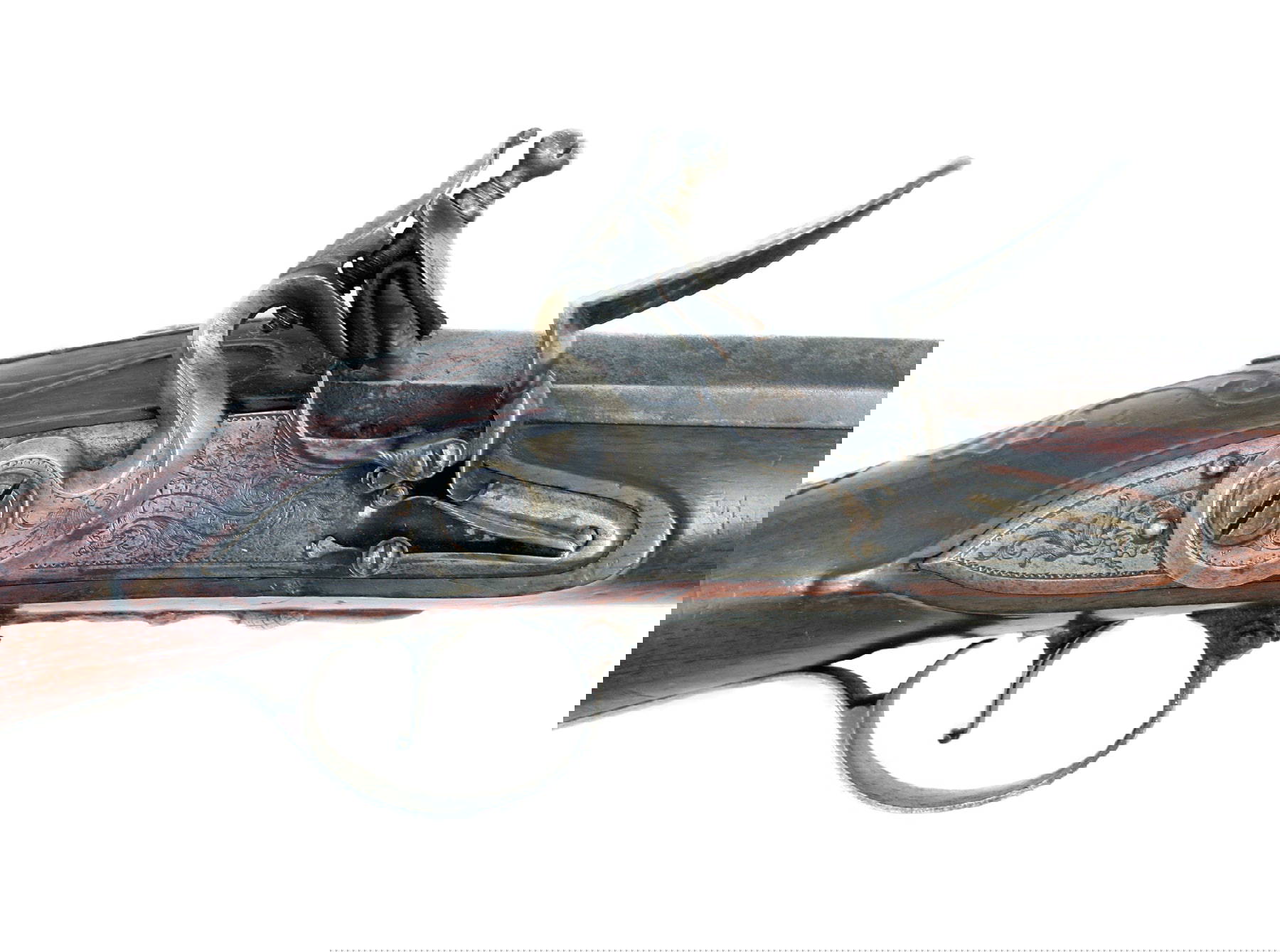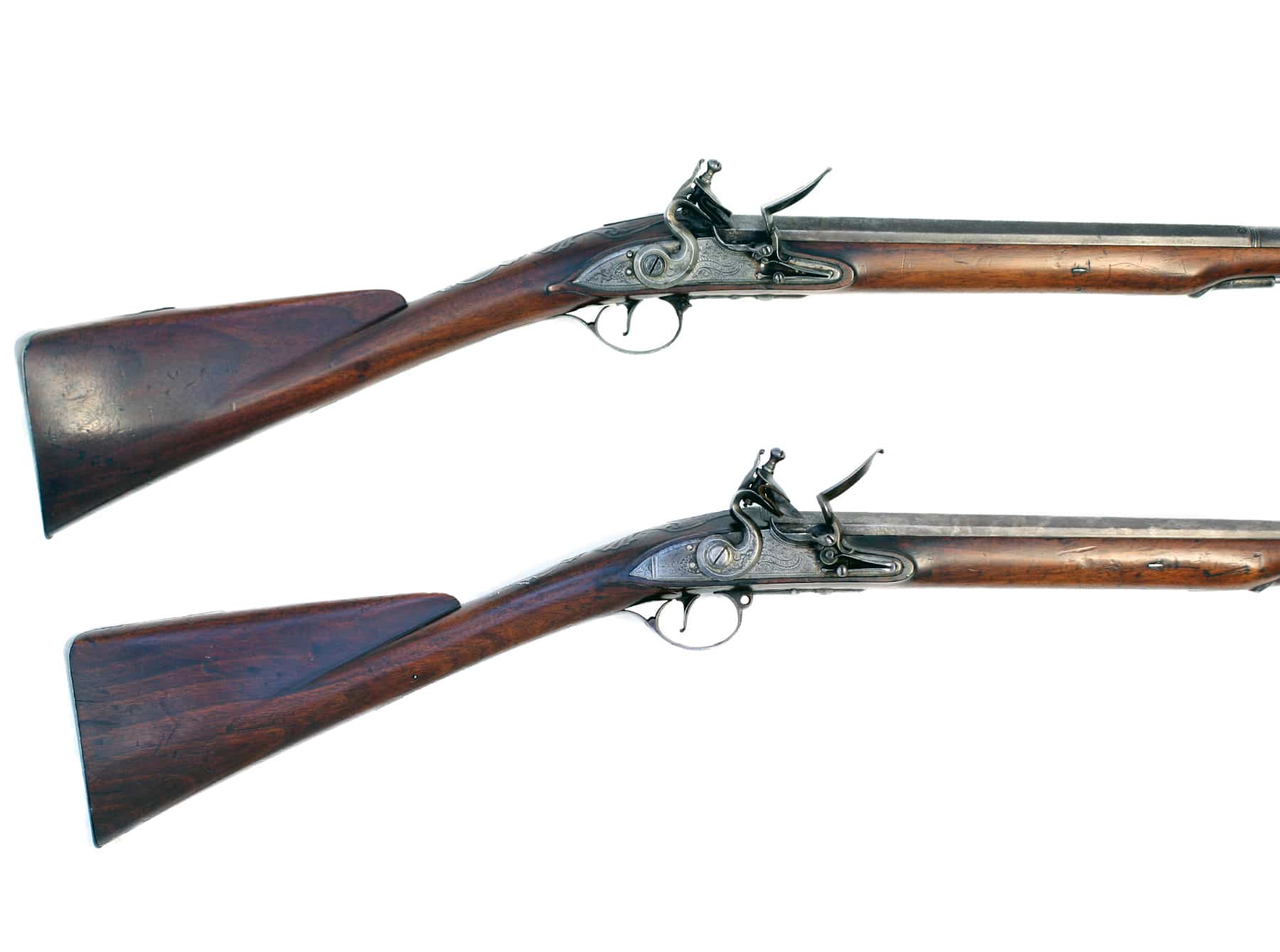 A Brace of 18-Bore Flintlock Sporting Guns by Capper of London, Circa 1780. With octagonal to round sighted barrels with bayonet lugs below, signed London on the top flats and decorated with a band of flowers at the transition from round to octagonal and decorated with sprays of foliage at the breeches, London proofs, elaborately engraved tangs incorporating back-sight, one flat. one stepped bevelled locks profusely engraved with foliage and signed CAPPER on foliate scrolls, the cocks decorated en suite, full-stocked in walnut (some old repairs to woodwork) with raised apron around the tangs and steel escutcheons numbered 1 and 2, engraved steel furniture incorporating side-plates with martial trophies, butt plates decorated with a stand of arms on the tails, foliate engraved trigger guards with acorn finials and decorated with a flower head on the bows, turned steel ramrod pipes and original steel ramrods.