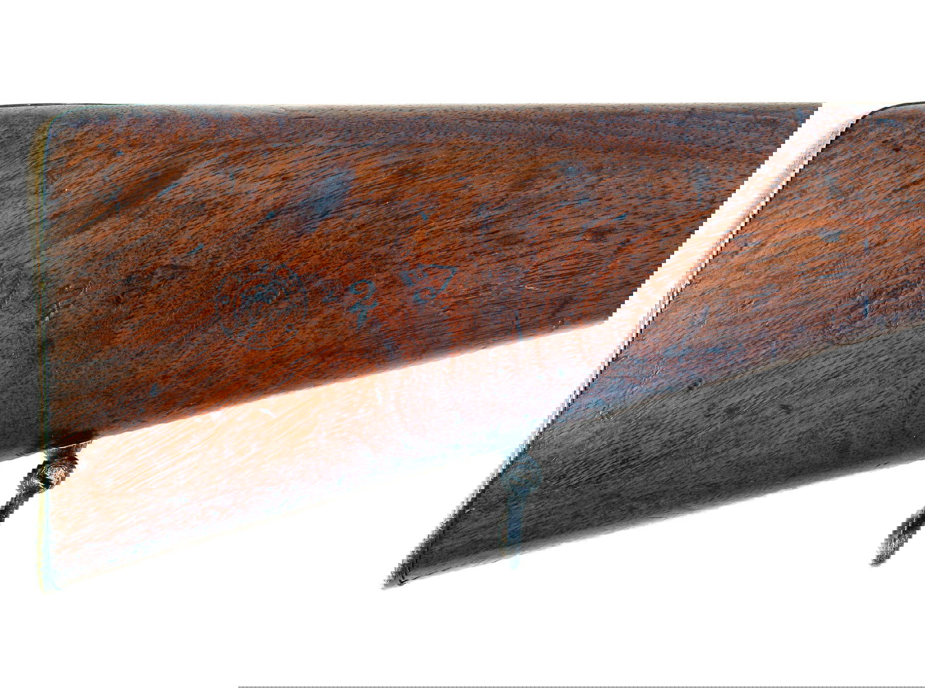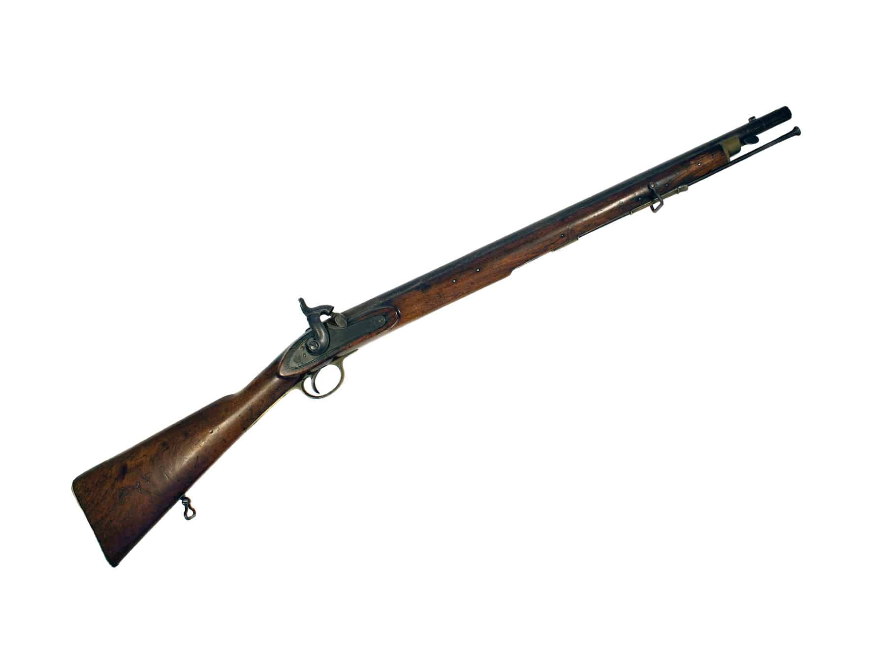 An 18 Bore Percussion Constabulary Carbine, Dated 1856. Of regulation pattern with dated border engraved flat lock, with ‘V.R.’ crowned at the tail and ’1856 TOWER’, figured walnut full stock, stamped with ordnance marks, regulation brass mounts including butt plate stamped ’30 BPS’ on the, Hanoverian bayonet-catch, sling loops and steel ramrod.