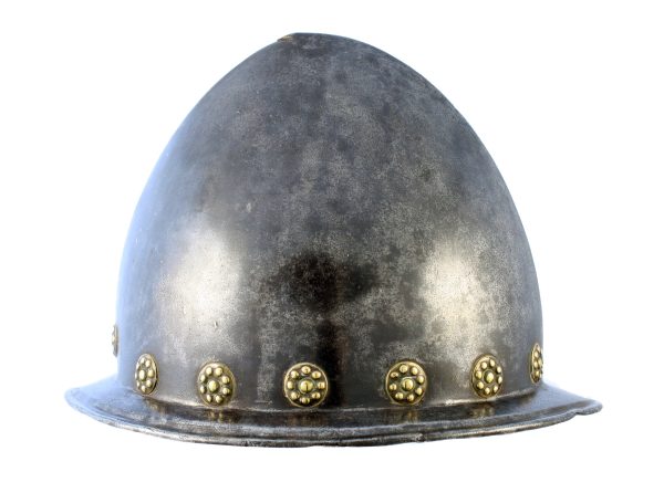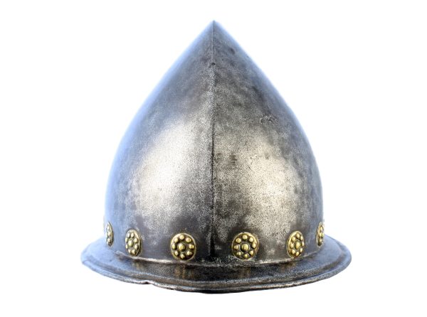 A ‘Spanish’ Cabaset, Circa 1590. Formed in one piece with an almond shaped crown rising to a shirt stalk at its apex, downturned narrow brim with inward turn accompanied by a narrow recessed border, the base of the crown encircled by fourteen large round headed lining rivets (replacements) with a lovely blued patina overall.