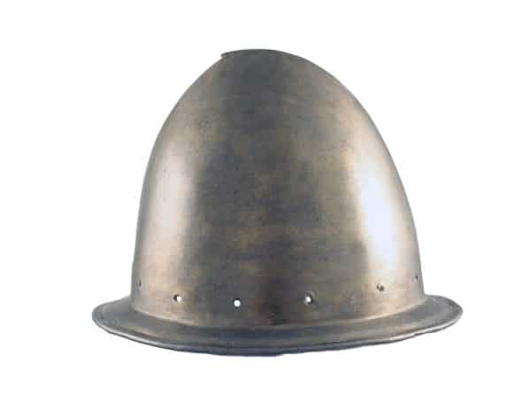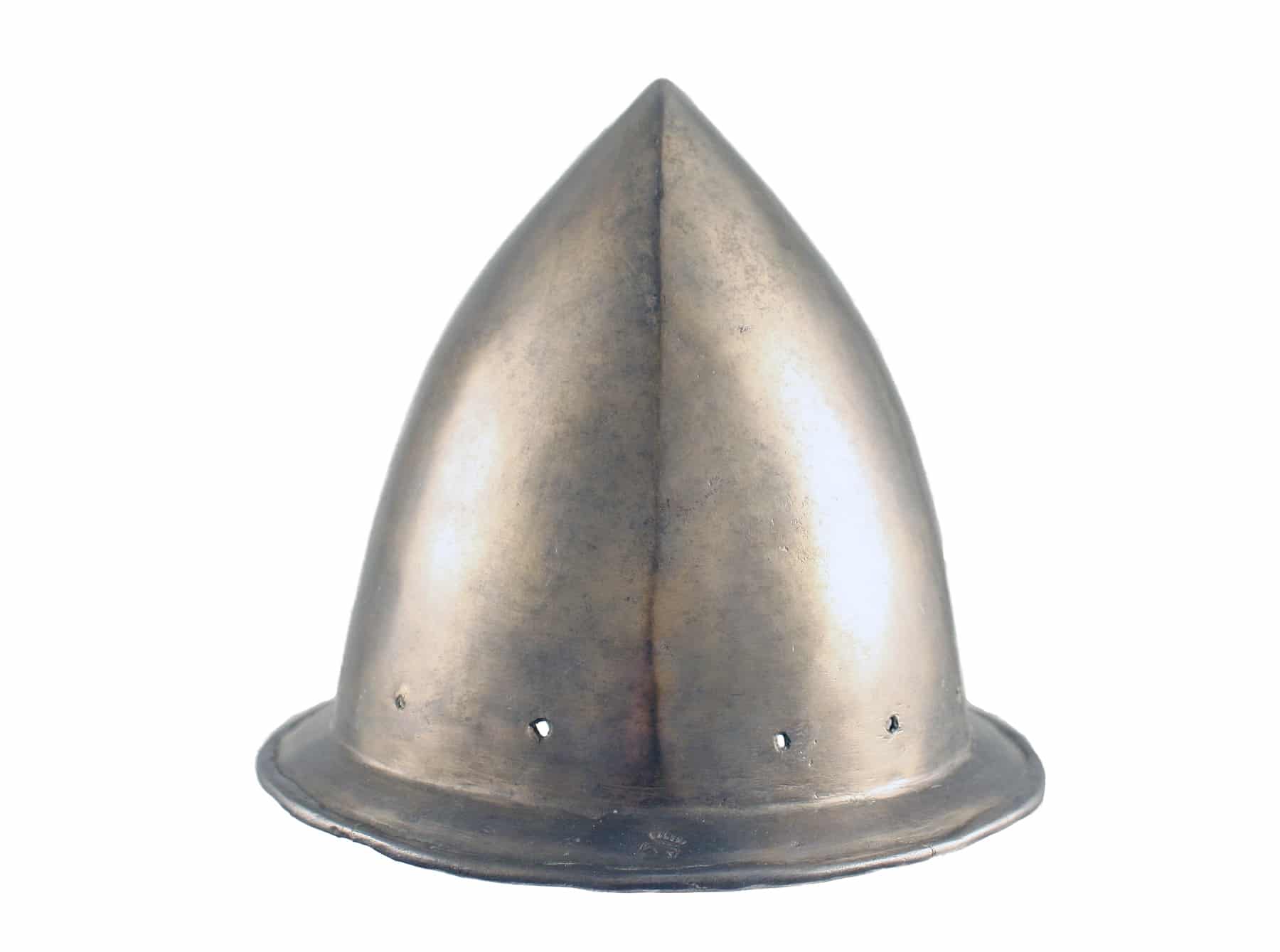A Cabaset, Circa 1590. With one-piece almond-shaped skull with characteristic stalk; the base fitted with lining rivets on punched brass washers, downturned brim with guttered and rolled rim. Armourers mark – appears to be a crown.