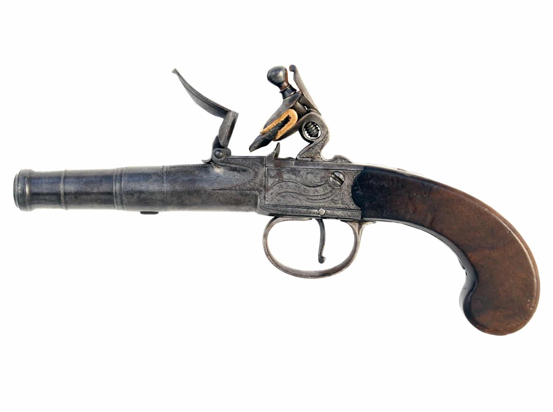A Flintlock Cannon-Barrelled Pistol by Barbar of London. With three-stage turn-off cannon barrel, stamped to the side with Tower of London private proofs, border engraved frame signed London on a foliate scroll to the right and Barbar on a foliate scroll to the left, sliding trigger safety catch, slab-sided walnut butt, a lovely example.