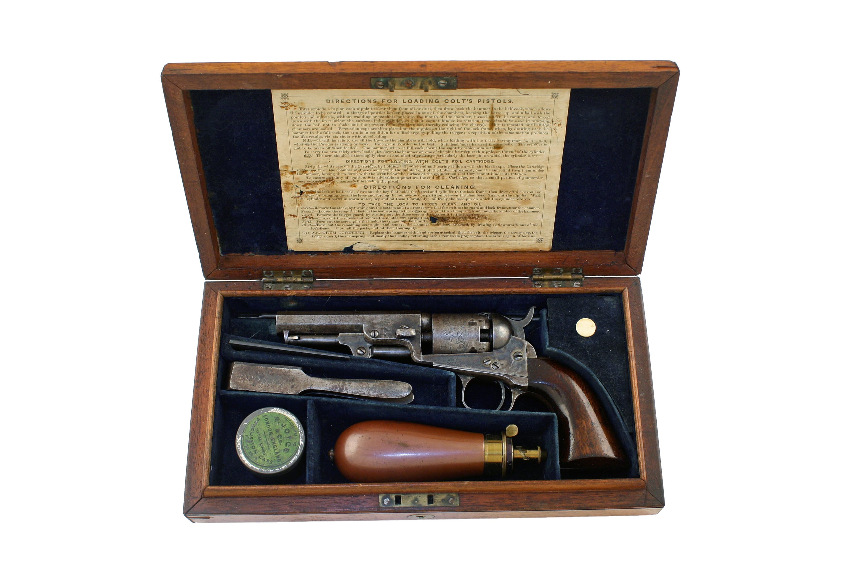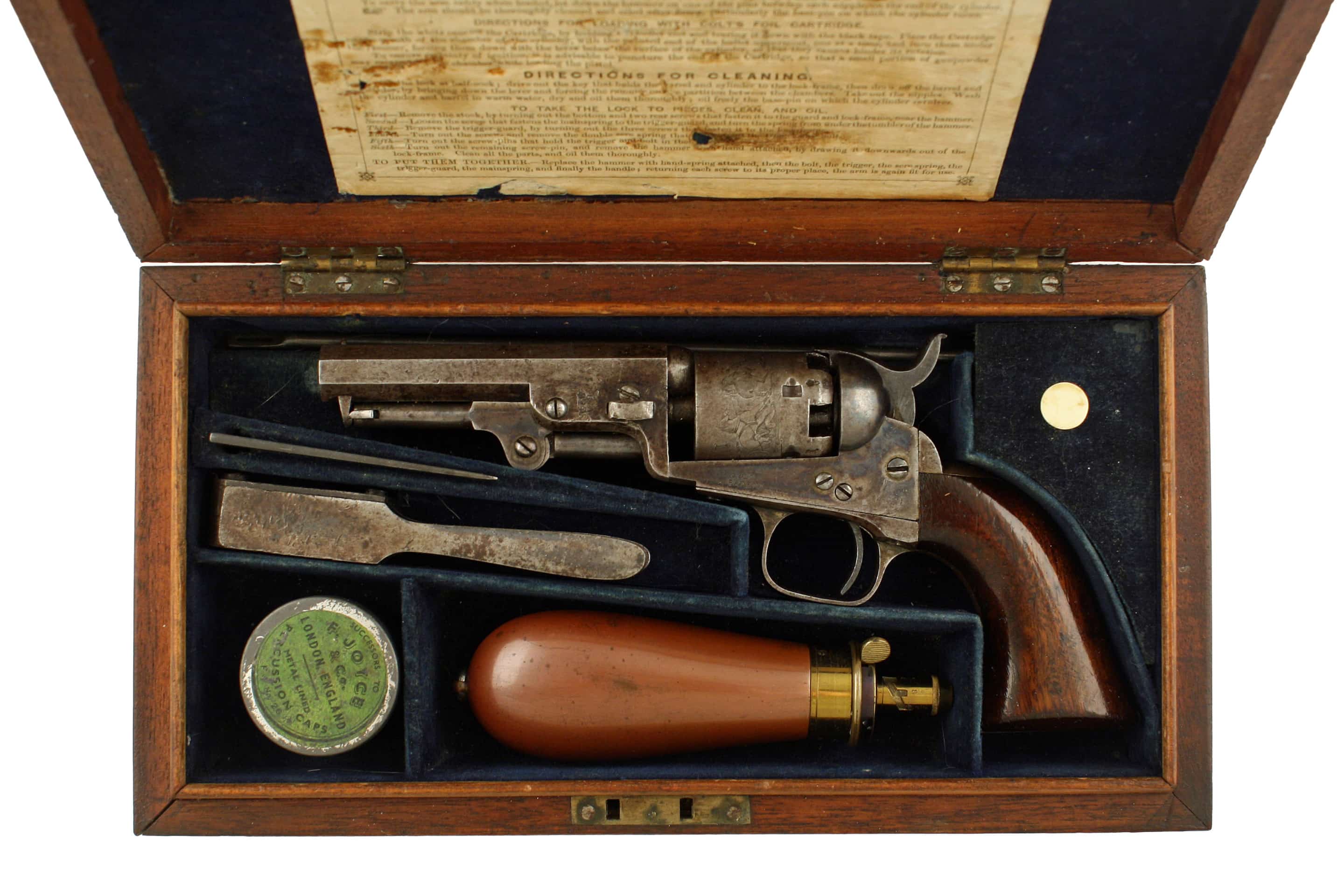 A Cased Colt 1849 Model Pocket Revolver, No. 7440. With octagonal sighted barrel with two-line London address, with five-shot roll-engraved cylinder, frame stamped ‘Col’s Patent’ on the left, rammer, scarce steel trigger guard and back-strap, matching numbers throughout; in original mahogany case lined and fitted in blue velvet, with accessories including fine James Dixon & Sons powder flask, steel bullet mould stamped, ‘COLTS PATENT’ percussion cap tin, cleaning rod and turn-screw, the exterior of the lid with vacant brass escutcheon.