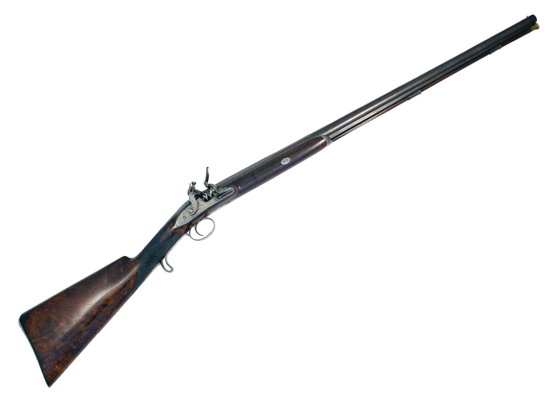 A Cased Flintlock Sporting Gun by H. Bailes of Ipswich. With sighted octagonal to round barrel signed in gold along the top-flat, ‘H. Bailes Ipswich’ with patent breech with four platinum lines and a gold touch hole, profusely engraved lock decorated with scrolling foliage and game, waterproof pan, half-stocked in walnut, cut with a band of chequering at the grip, profusely engraved mounts comprising butt plate, trigger guard and ramrod pipes: in relined mahogany case with accessories including powder flask and turn-screw, the exterior with flush fitting brass carrying handle.