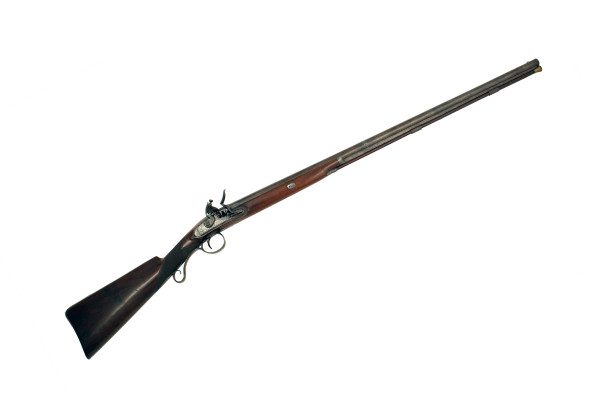 A Superb Cased 16 Bore Flintlock Sporting Gun by T. Mortimer. With round sighted tapering barrel, signed ‘LONDON’ in gold gothic script and decorated with a spray of foliage, octagonal breech signed within a gold poincon ’T. MORTIMER LONDON’ and deeply engraved with stands of arms either side, single gold line and platinum breech plug, stepped bevelled lock, border engraved and decorated with sprays of foliage at the tail, cock decorated en suite, rainproof pan and roller, figured half-stock with chequered grip, border engraved iron mounts comprising butt-plate with a shield and foliage, trigger guard decorated with foliage on the bow and pineapple finial, silver fore-end cap, barrel bolt escutcheons and vacant oval escutcheon, original brass tipped ramrod with worm: in its original lined and fitted mahogany case with accessories including powder flask, cleaning rods, leather shot flask and belt, the interior of the lid with the trade label of Thomas Mortimer, Ludgate Hill, the exterior of the lid with circular brass escutcheon, London proof marks.