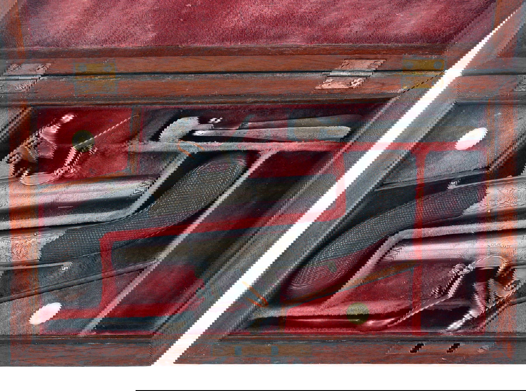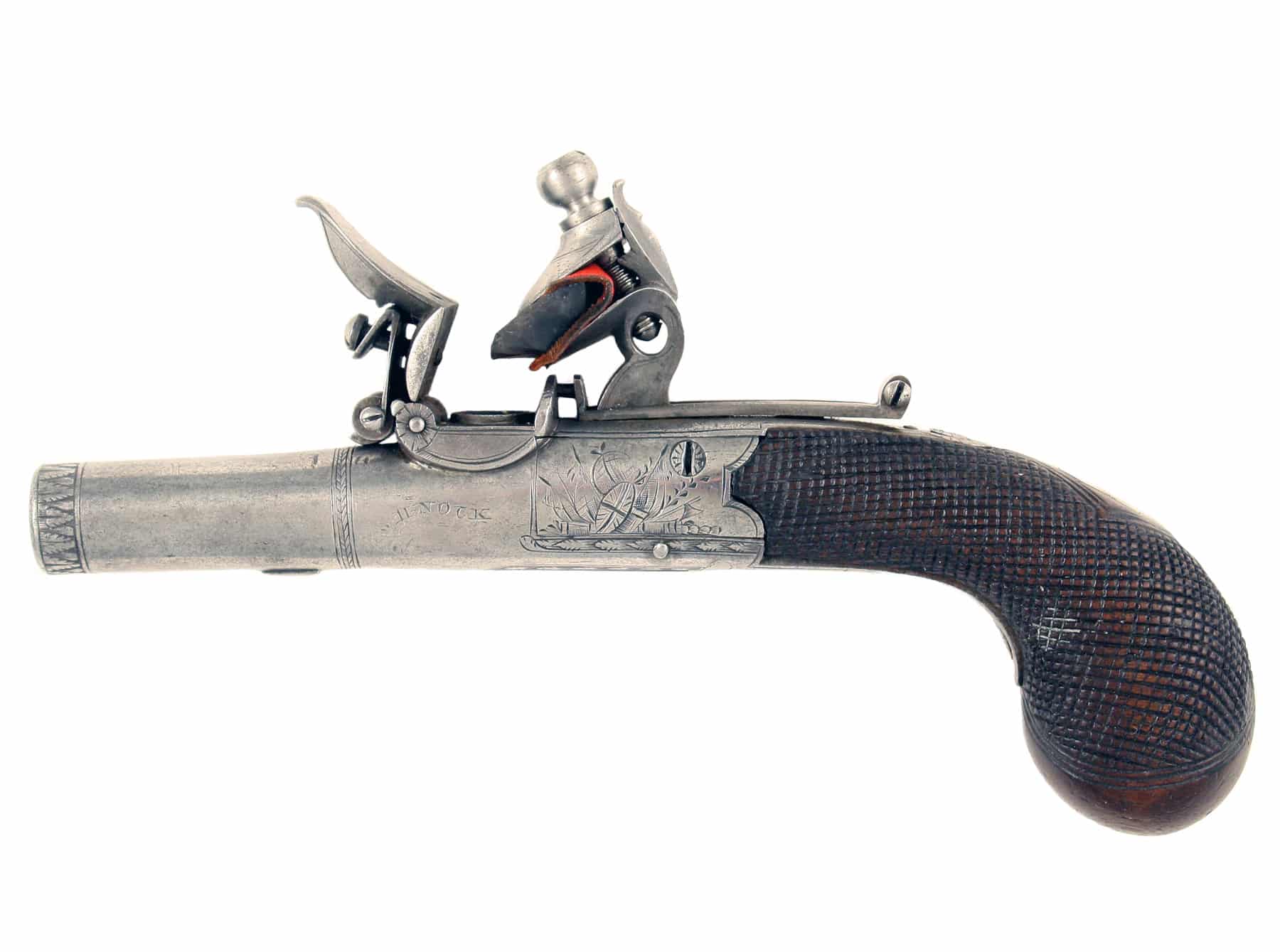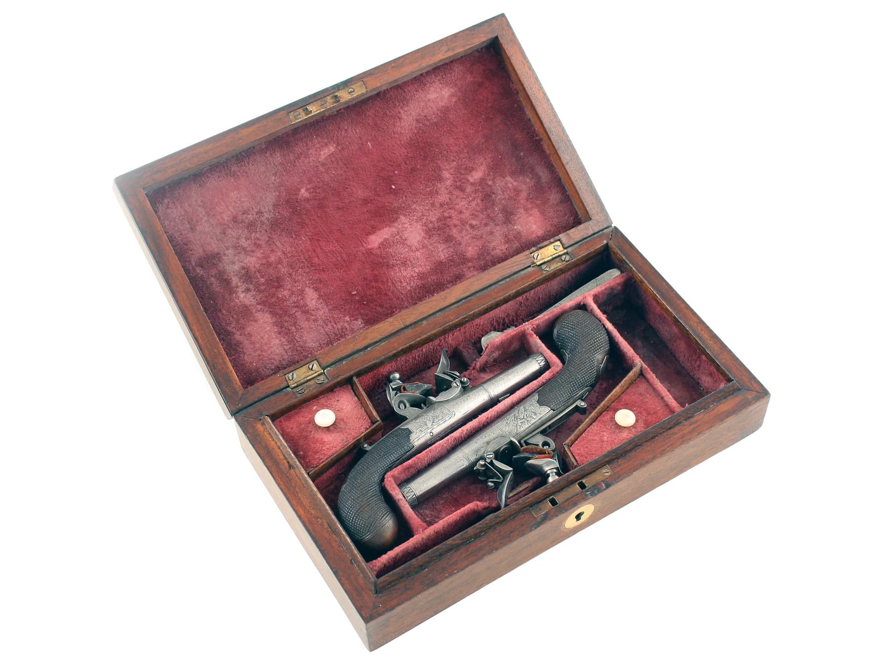A Cased Pair of 80-Bore Flintlock Pocket Pistols by H. Nock. With round turn-off barrels (frozen) decorated with a band of foliate engraving at the muzzles, struck with Birmingham proofs. Border engraved box-lock actions, the panels decorated with shields surrounded by stands of arms, signed H. Nock and LONDON on apposing sides of the pans, sliding thumb-piece safety catches, swelling chequered walnut butts, engraved silver escutcheons ‘G.R.’ in associated fitted case lined in red velvet (faded) with some accessories.
