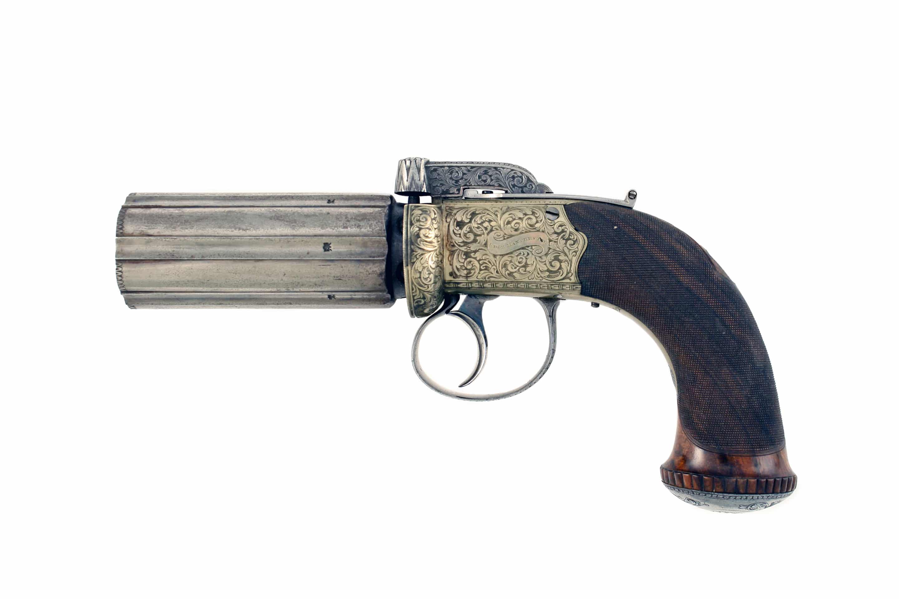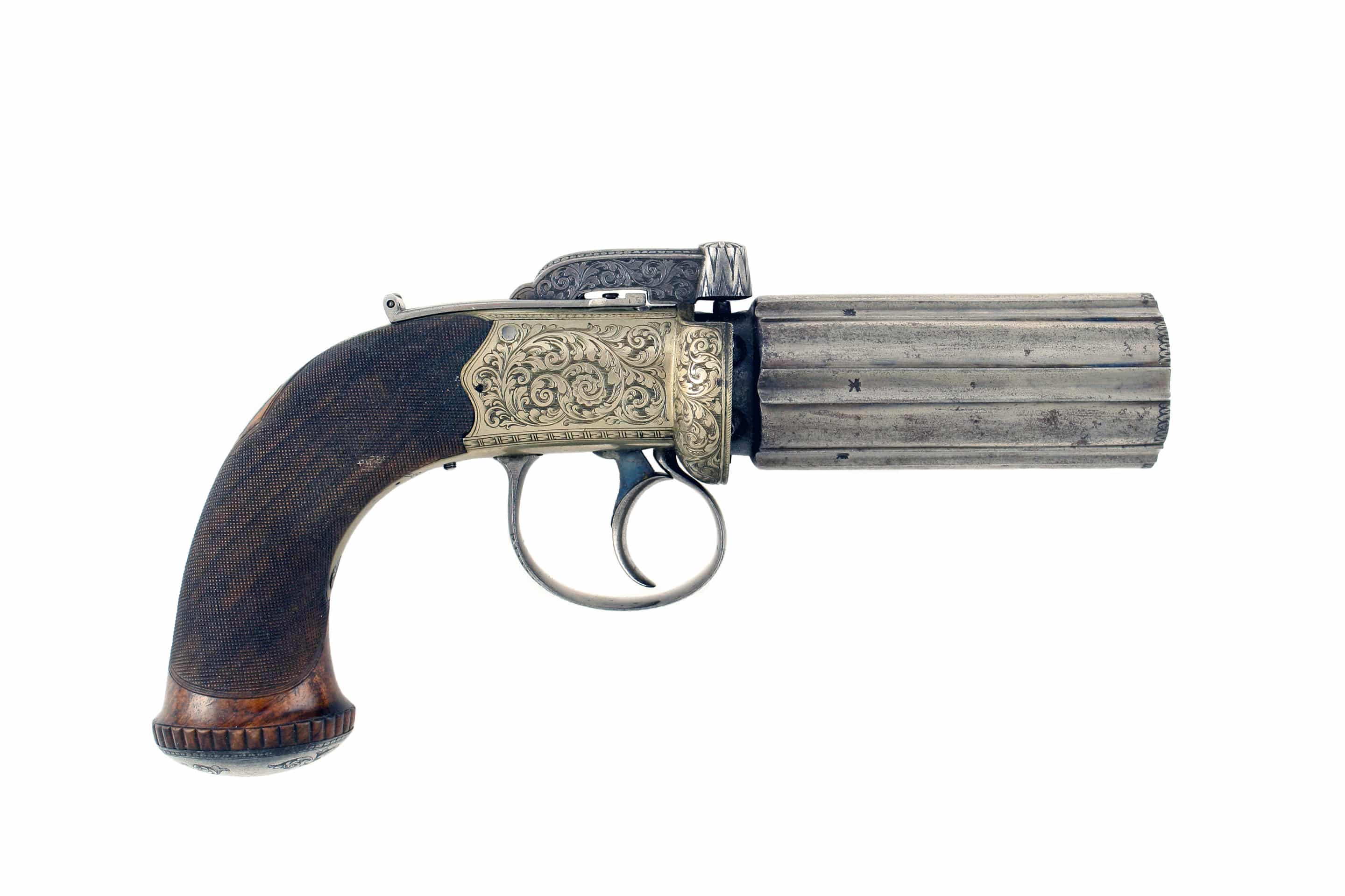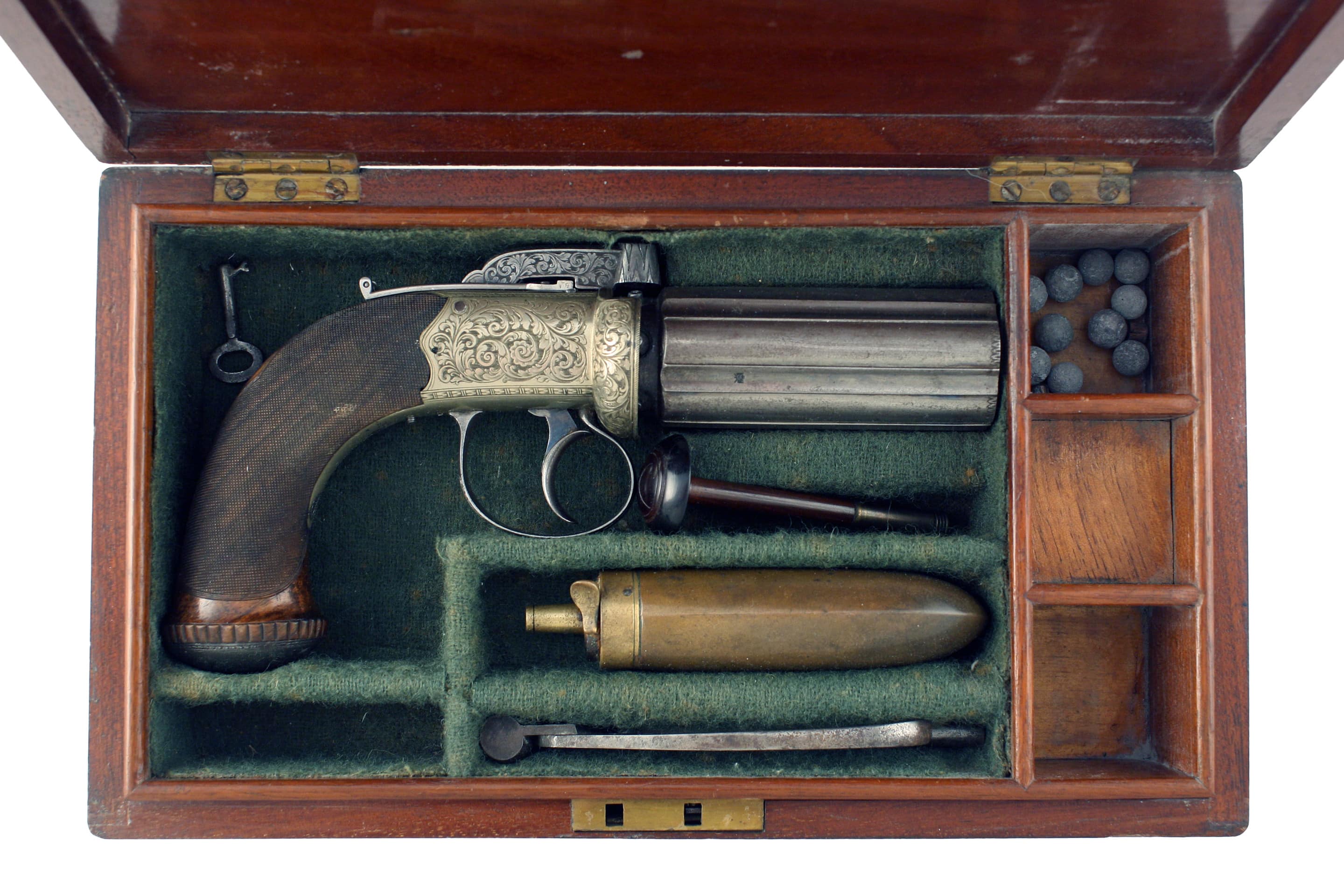 A Cased Pepperbox Revolver by Edge of Manchester. With rounded barrels, border engraved white metal action with nipple-shield, decorated with scrolling foliage and signed on one side, EDGE MANCHESTER, bar-hammer and trigger guard decorated en suite, the former with thumb-piece safety catch, ovoidal pommel-cap with hinged circular butt-trap cover engraved with flower hear, finely chequered rounded butt with vacant silver escutcheon, Birmingham proofs: in an associated pistol box lined in green baize with some accessories including bullet mould, powder flask etc, the lid with cartouche engraved, ‘Mr Henry Samson’.
