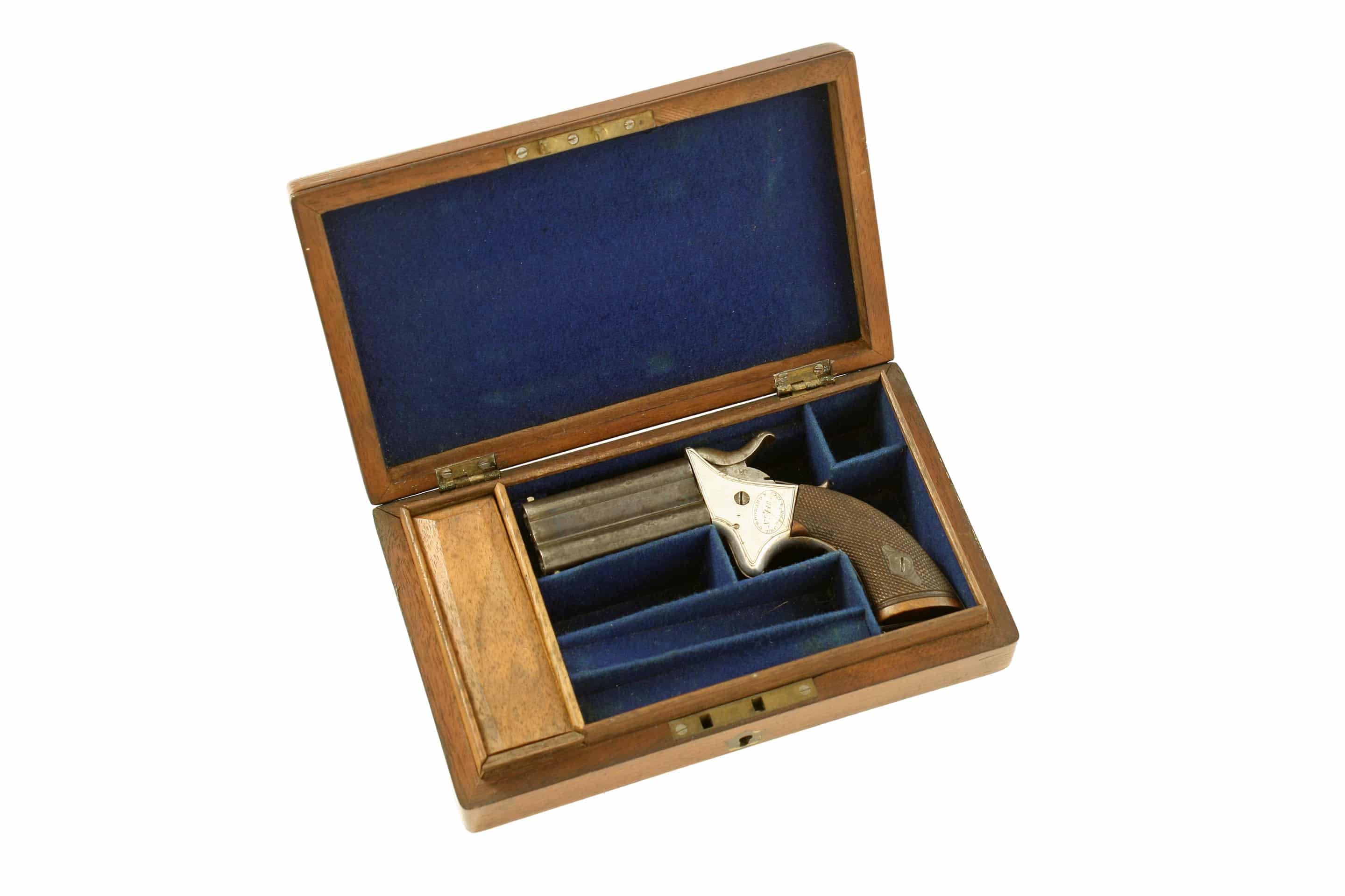 A Cased Woodward Patent Pistol, No. 448. With sighted barrels, stamped with Birmingham proofs and ‘448’, border engraved action with spur trigger guard and engraved ‘WOODWARD’s No. 567. REGD FEBY 1863’ in an oval on one side, with required rounded grips and thumb piece safety catch, in its original wooden case lined and fitted in blue baise.