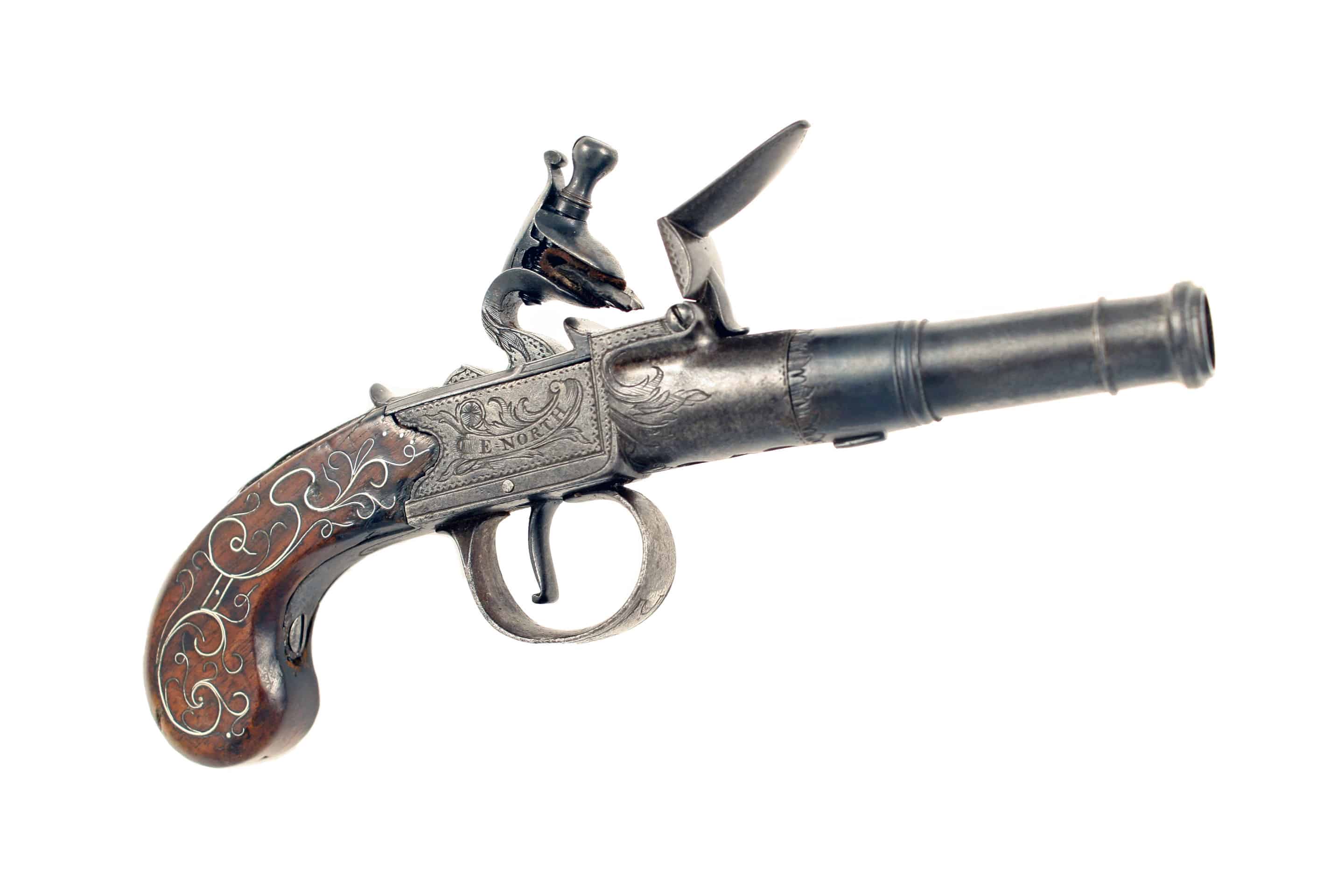 A Crisp Flintlock Canon Barrel Pistol by E. North, London. With round, three-stage, turn-off cannon barrel, decorated with a band of foliage at the breech, deeply stamped London proofs and barrel smiths mark, border engraved box-lock action decorated with foliage and signed in full on foliate scrolls on either side, fitted with sliding thumb-piece safety catch, engraved to match, steel trigger guard engraved with foliage on the bow, slab sided walnut butt, inlaid with scrolling silver wire and with raised shell engraving around the tang. A very crisp example.