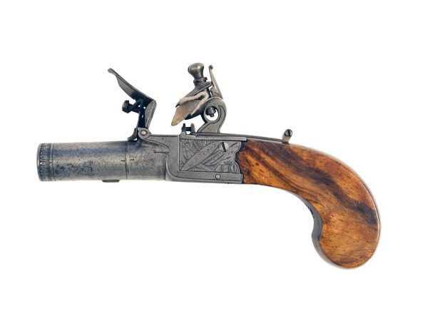 A Crisp Flintlock Pocket Pistol by Wilkinson of London. With round turn-off barrel engraved with a geometric band at the muzzle and a single line towards the breech, border engraved box-lock action decorated with stands of arms and signed ‘WILKINSON’ within an oval to the left and ‘London’ to the right, fitted with a sliding safety catch that also locks the pan, slab sided walnut grip with vacant rectangular escutcheon, in nice clean order.