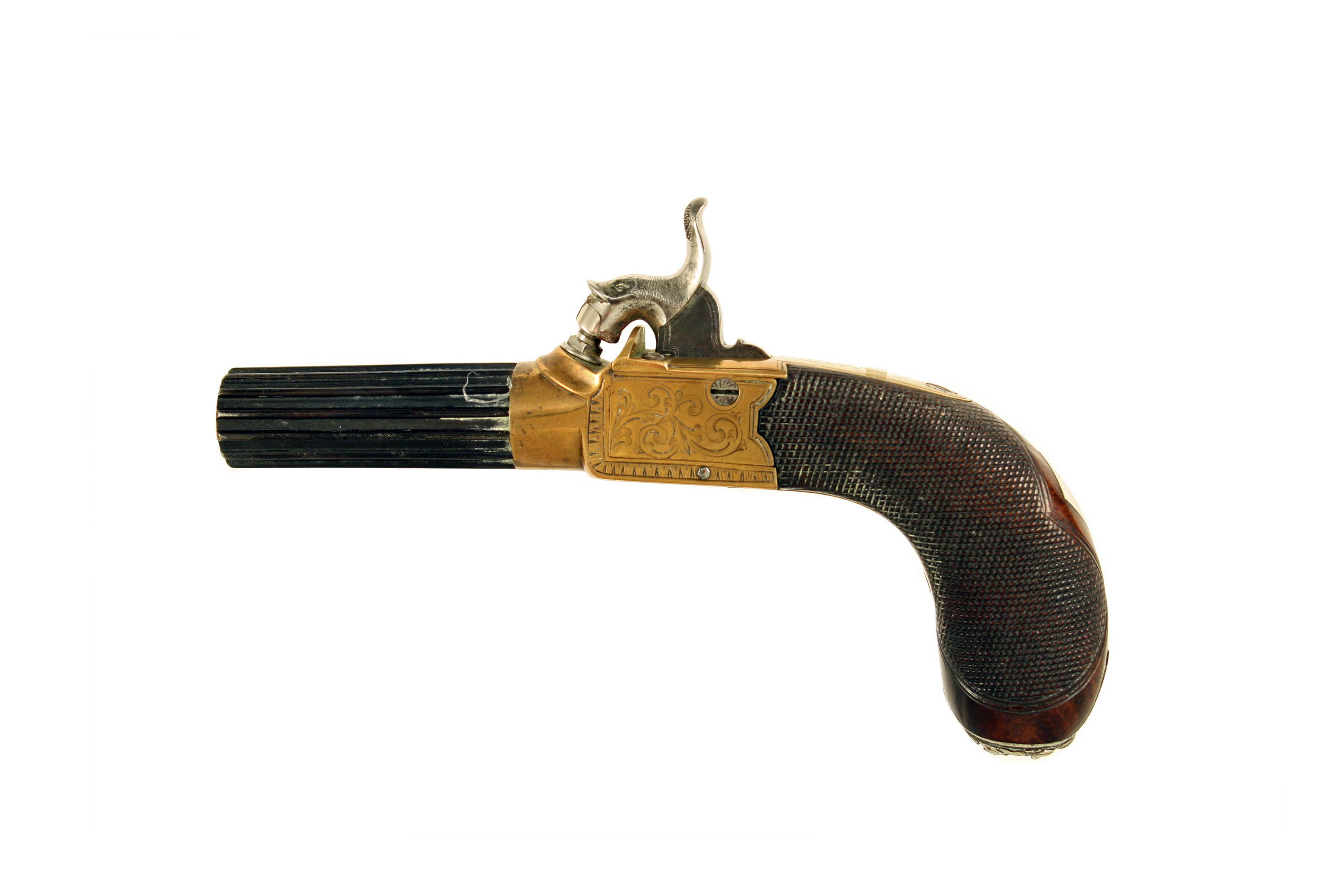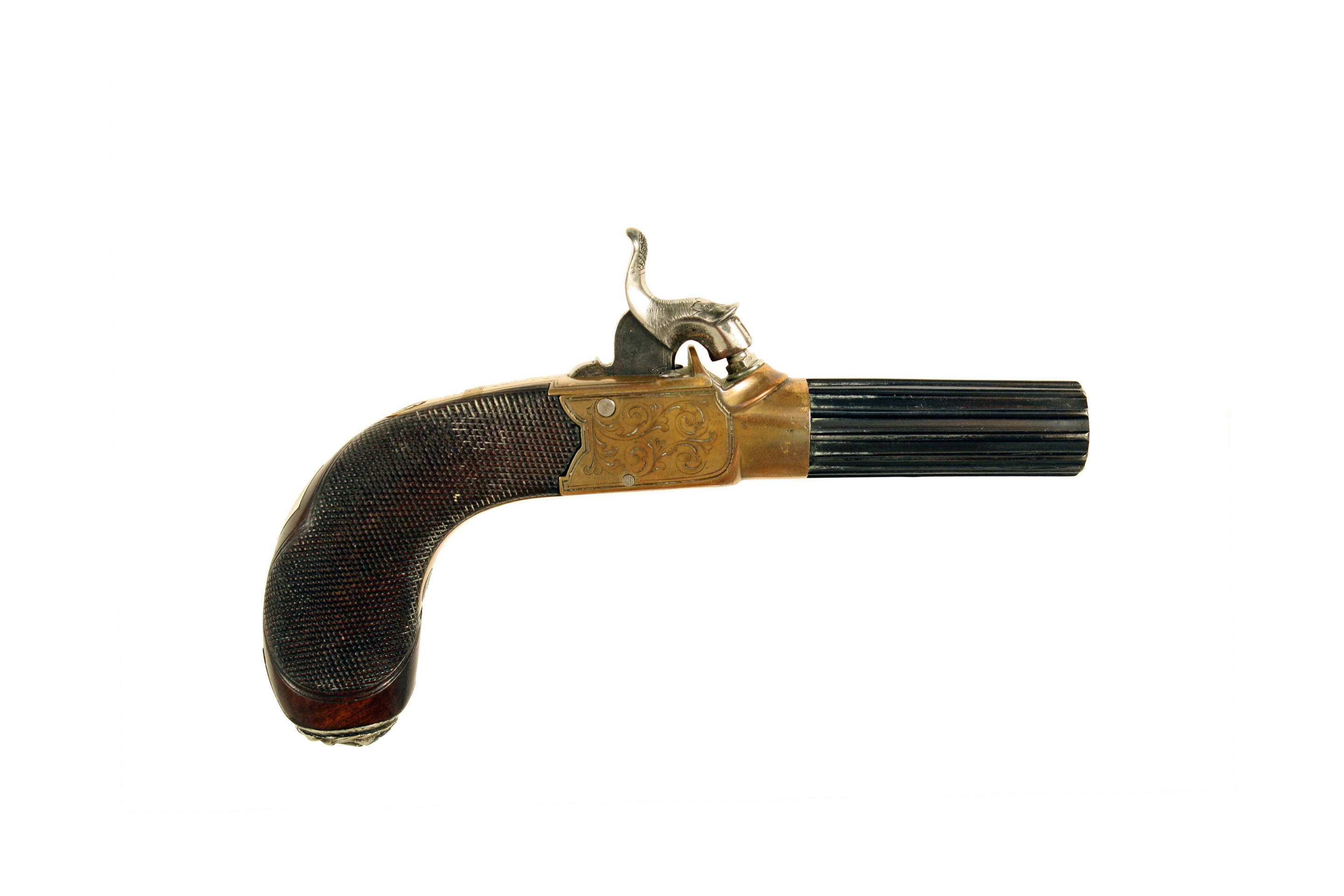 A Crisp Little Percussion Pocket Pistol by Braithwaite of Leeds. With fluted turn-off barrel stamped with Birmingham proofs, brass border engraved box-lock action, decorated on both panels with scrolling foliage and signed along the tang, dolphin headed hammer, finely chequered walnut grip with silver lions head butt mask.