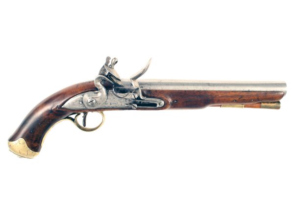 A Flintlock Officers Pistol by D.Egg of London. With round barrel engraved, ‘D.EGG LONDON’ along the top flat and stamped with Tower of London private proofs, double line engraved lock signed ‘D.EGG’ full stocked in walnut with brass mounts in the military style.