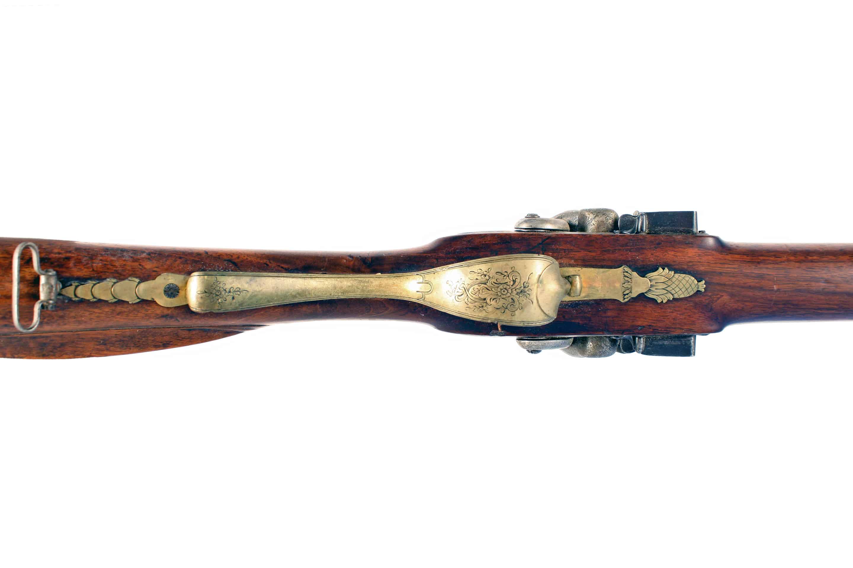 A Double Barrel Flintlock Sporting Gun. With sighted double barrel, foliate engraved breech block, reconverted from percussion, plain locks, replacement cocks and pans, pain frizens (one with broken frize) half-stocked in walnut with raised foliate moulding around the tang and cheek-piece decorated with scrolling foliage, foliate engraved brass furniture comprising butt plate, decorated with scrolling foliage and acorn finial, trigger guard profusely decorated with foliage on the bow and pineapple finial, turned brass ramrod pipes, with hardwood ramrod.