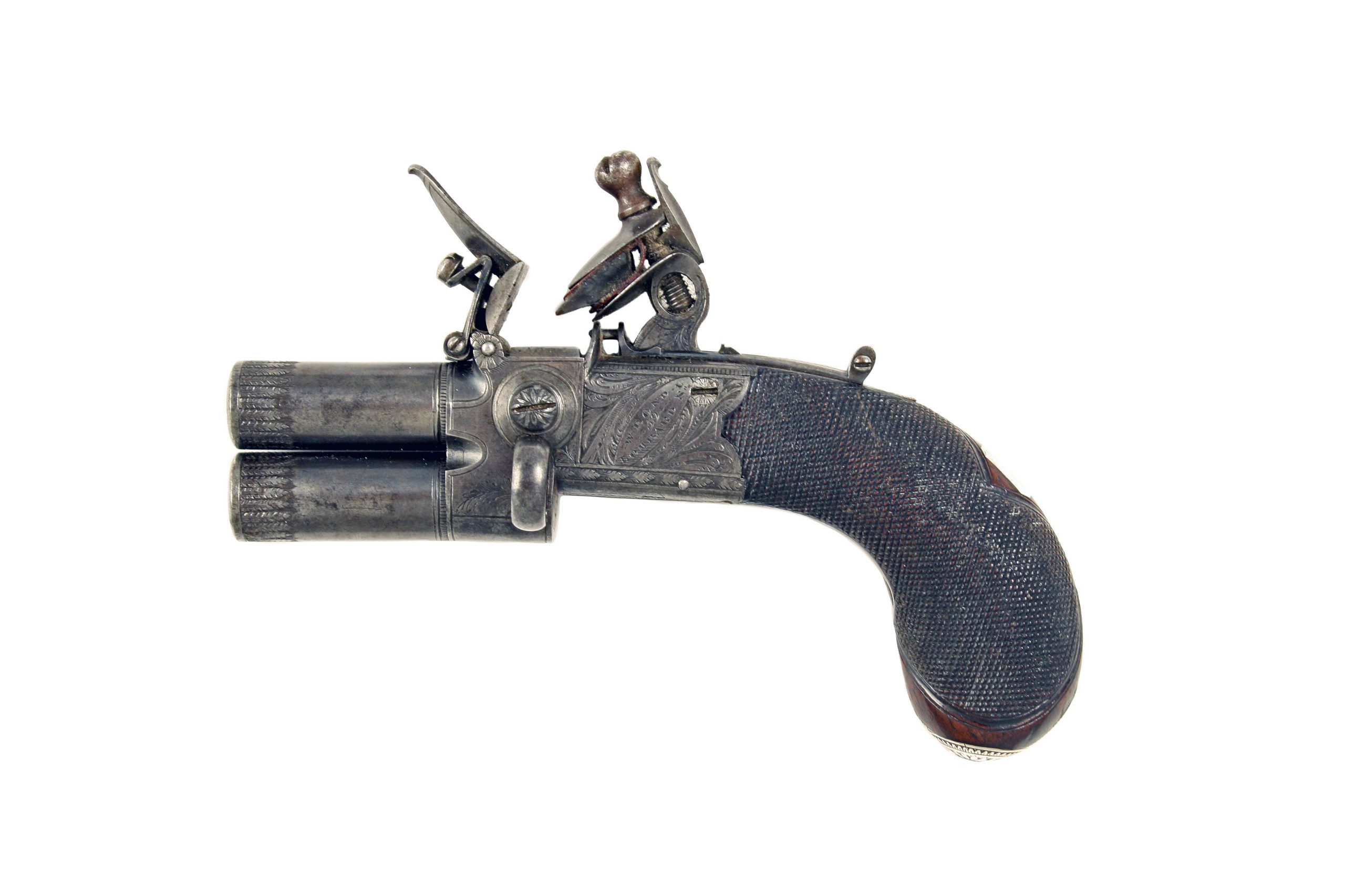 A Fine 120 Bore Flintlock Tap Action Pistol by W. Bond. With round turn-off barrels, decorated with geometric bands towards the muzzles, simple line engraving towards the breech, struck with London proofs, border engraved box-lock action, signed within an oval to the left, profusely engraved with foliage and ‘LONDON’ to the right, fitted with sliding safety catch that also locks the steel, swelling chequered walnut butt with engraved silver butt cap. A lovely pistol.