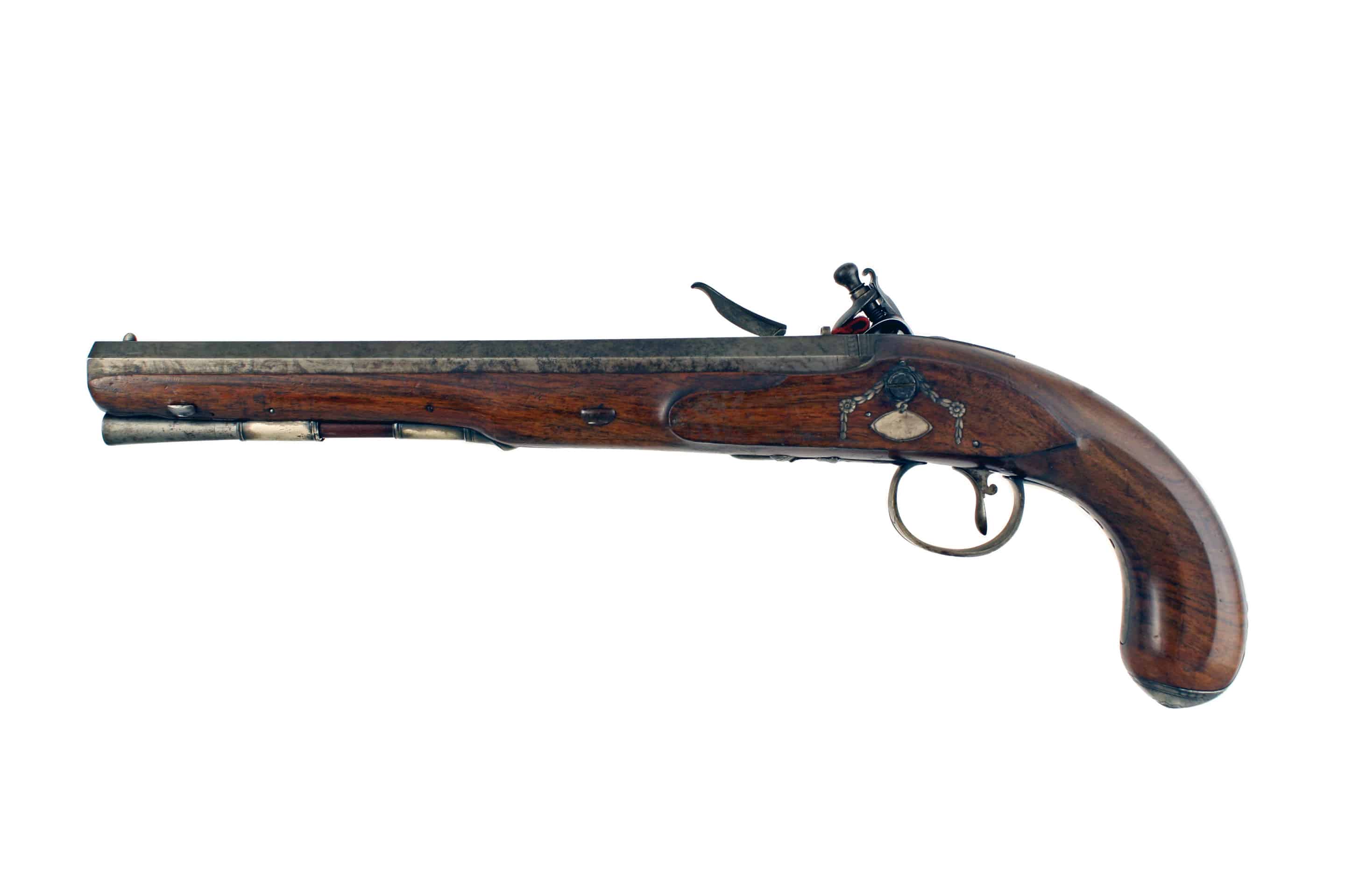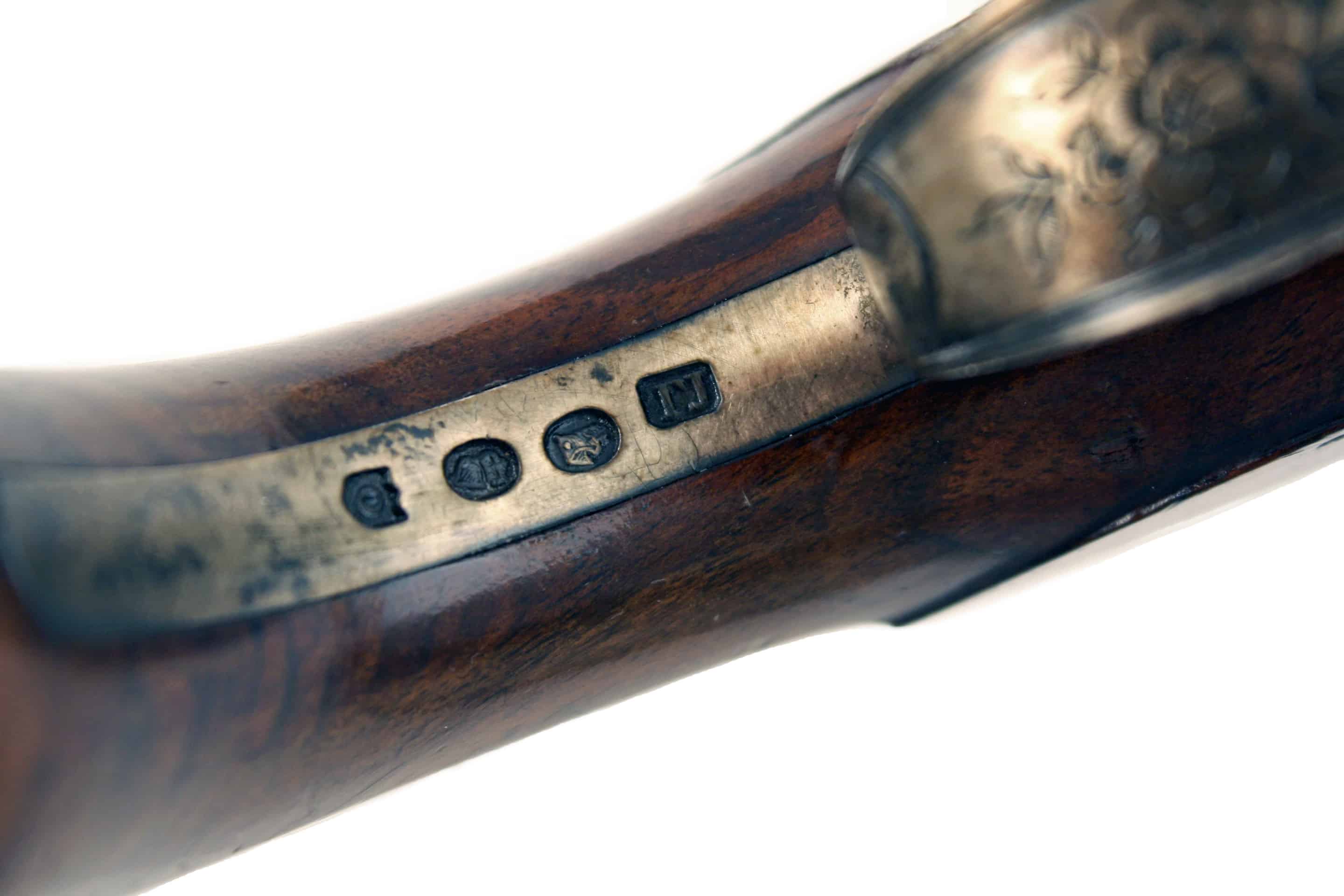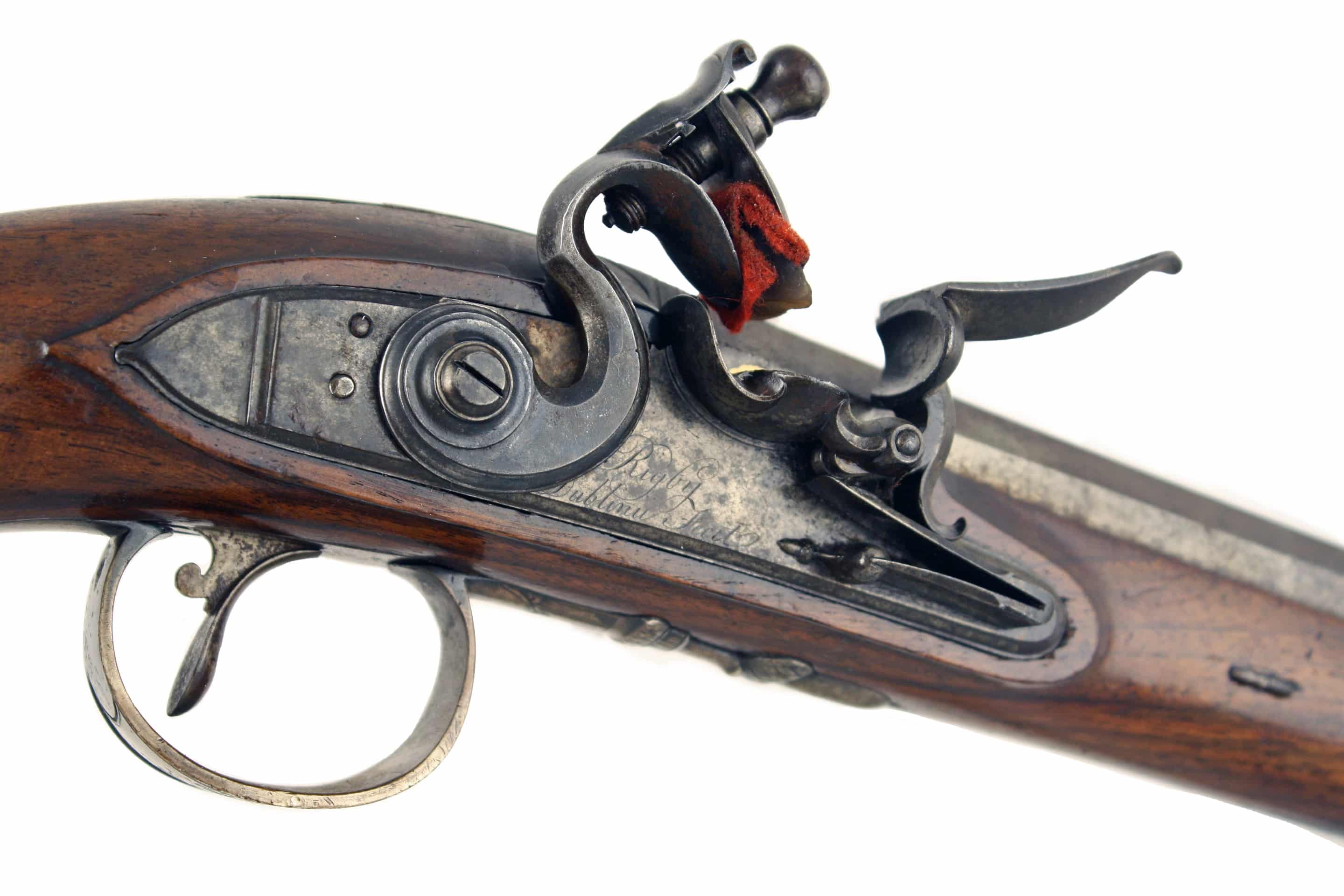 A Fine 22-Bore Flintlock Duelling Pistol by Rigby of Dublin. With sighted, slightly swamped barrel, stamped with Rigby’s gold poincon, ‘RIGBY over a crowned harp and DUBLIN’ fitted with standing rear-sight, decorated with a geometric band at the breech and fitted with a gold touch-hole, beautifully engraved barrel tang and screw, stepped bevelled lock signed in script, ‘Rigby Dublinu Fecit’ fitted with gold-lined rainproof pan, full-stocked in walnut with slab sided butt, completed with soldi silver mounts comprising a small oval side-plate under the cup for the lock screw, with chains of flowers and foliage on either side, border engraved foliate butt cap, hallmarked for 1788 and makers mark TJ for Thomas Jones, crisp silver trigger guard again stamped with hallmarks and TJ makers mark, decorated with a flowers head on the bow and acorn finial, turned silver ramrod pipes, with original wooden ramrod with worm and powder-loading tip. A fine and incredibly scarce pistol.