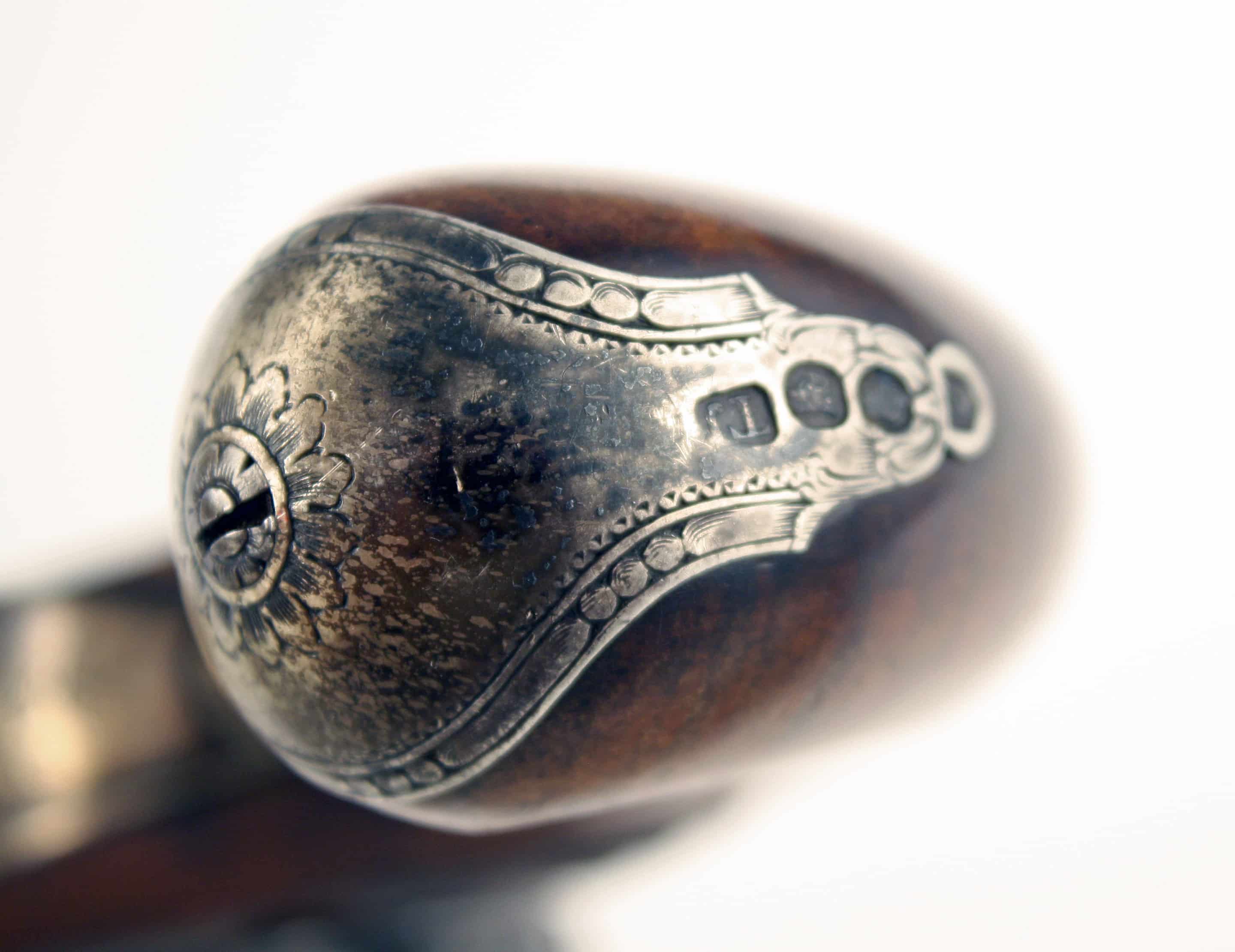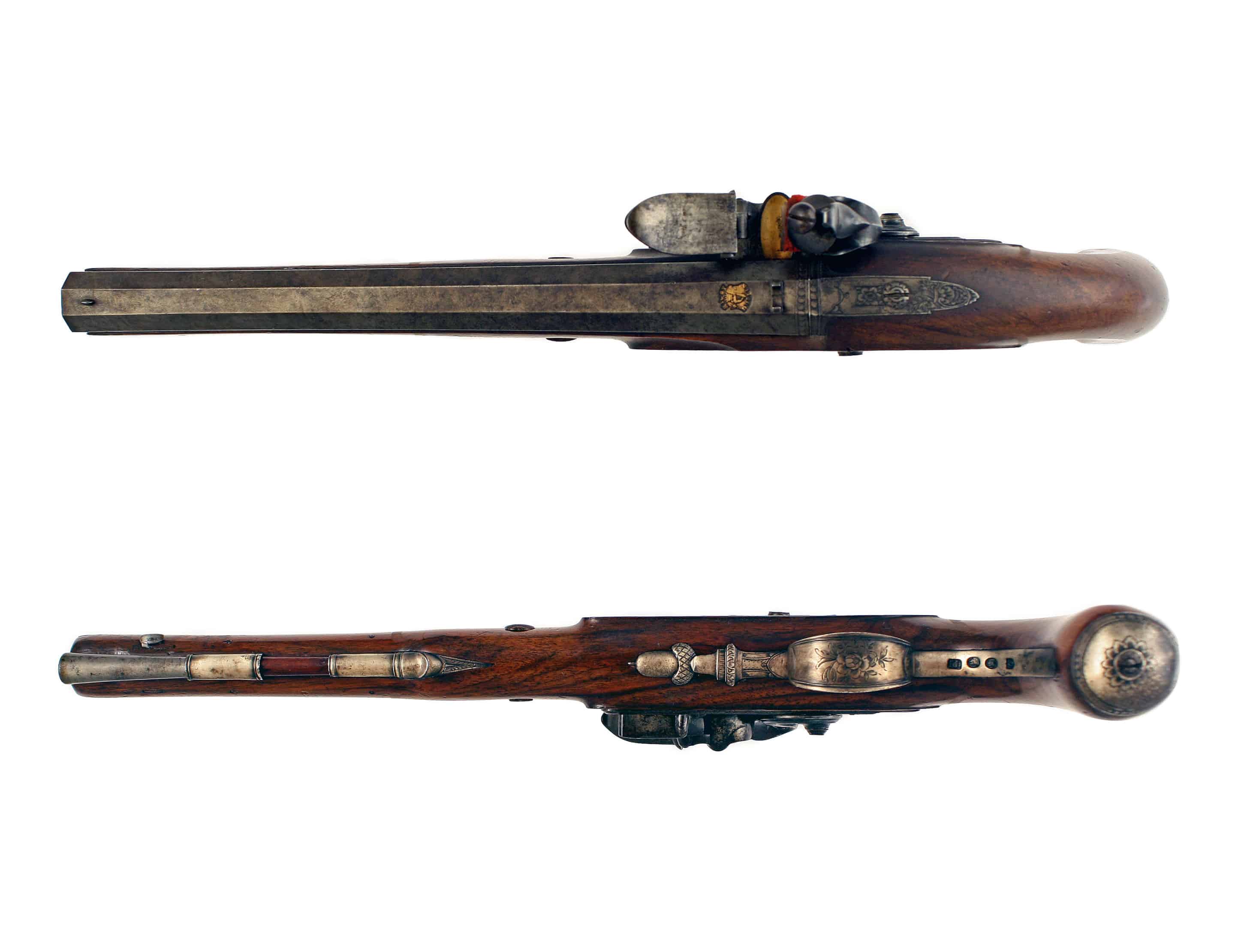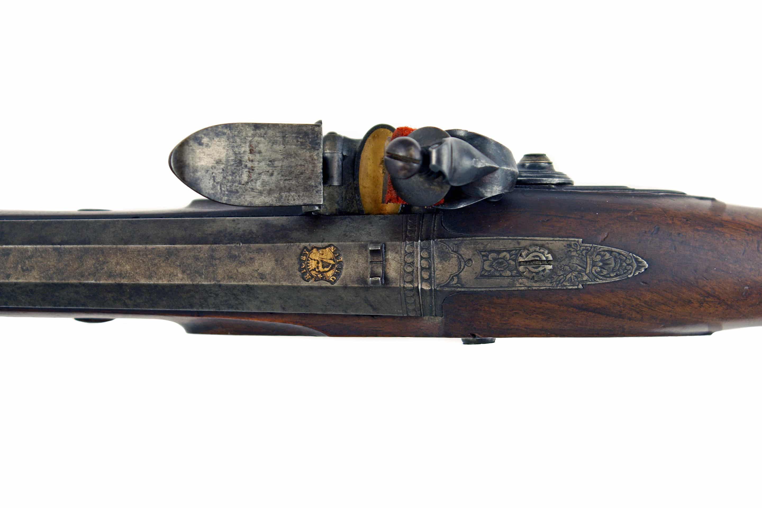 A Fine 22-Bore Flintlock Duelling Pistol by Rigby of Dublin. With sighted, slightly swamped barrel, stamped with Rigby’s gold poincon, ‘RIGBY over a crowned harp and DUBLIN’ fitted with standing rear-sight, decorated with a geometric band at the breech and fitted with a gold touch-hole, beautifully engraved barrel tang and screw, stepped bevelled lock signed in script, ‘Rigby Dublinu Fecit’ fitted with gold-lined rainproof pan, full-stocked in walnut with slab sided butt, completed with soldi silver mounts comprising a small oval side-plate under the cup for the lock screw, with chains of flowers and foliage on either side, border engraved foliate butt cap, hallmarked for 1788 and makers mark TJ for Thomas Jones, crisp silver trigger guard again stamped with hallmarks and TJ makers mark, decorated with a flowers head on the bow and acorn finial, turned silver ramrod pipes, with original wooden ramrod with worm and powder-loading tip. A fine and incredibly scarce pistol.