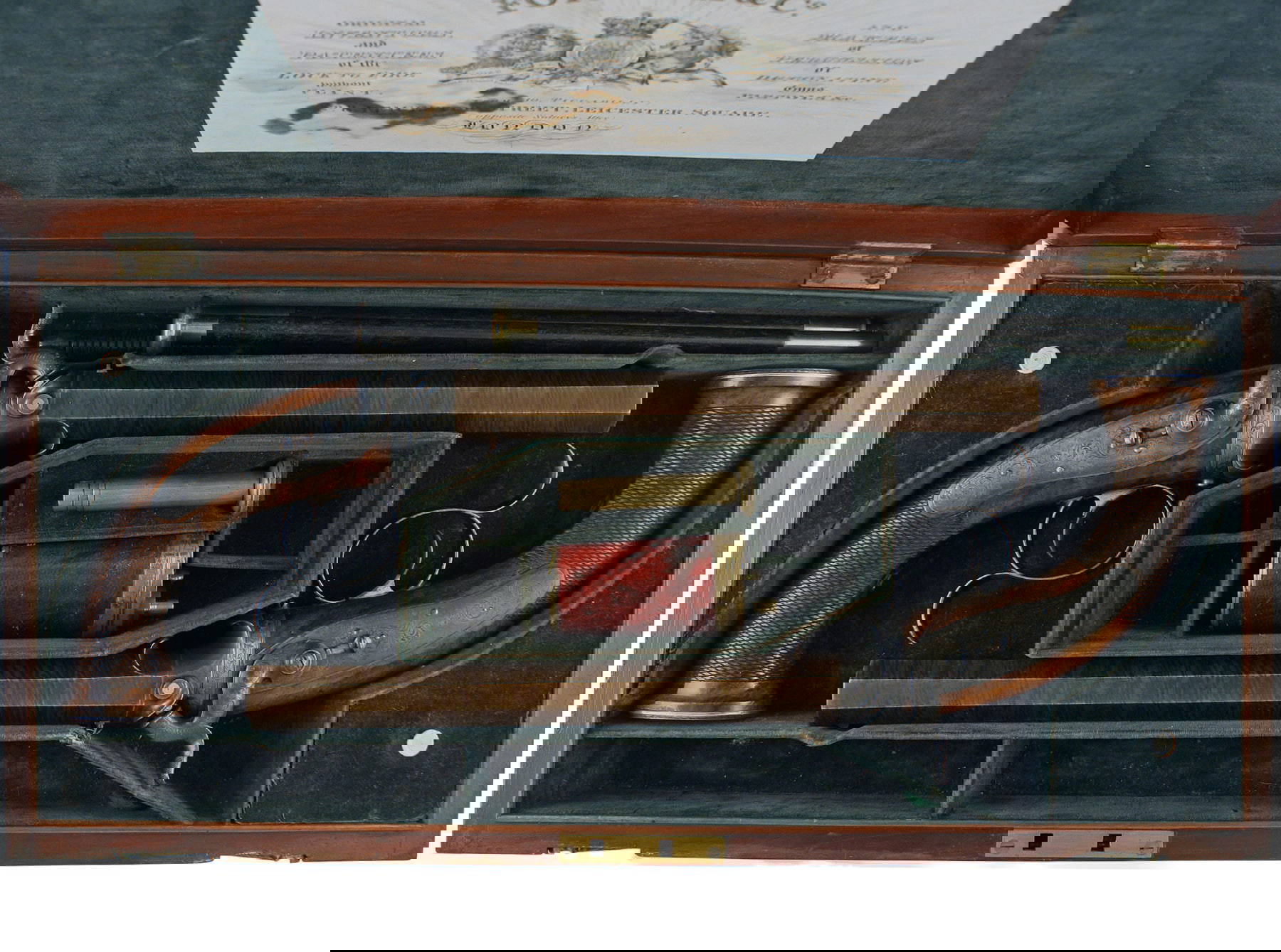 A Fine Cased Pair of 32 Bore Percussion Duelling/Target Pistols by Forsyth & Co, London Nos. 4227 and 4228. With heavy swamped browned twist octagonal sighted barrels signed on the top flat, case-hardened patent breeches each with pierced platinum plug and two platinum lines, shaped finely engraved case-hardened tangs, signed serial numbered detented back-action locks finely engraved with scrollwork and each with blued safety-catch, chequered figured walnut butts, scroll engraved blued spur trigger-guards, silver escutcheons, flat oval pommels each inlaid with a silver plaque engraved with radiating lines, and much original finish: in original lined and fitted mahogany case with accessories, the lid with trade label for circa 1827-52, London proof marks