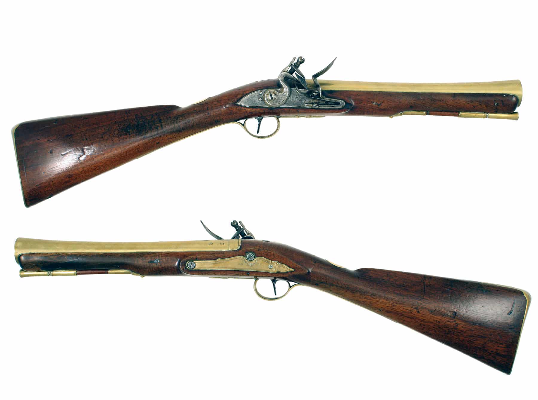 With belled brass muzzle, stamped with London proofs at the breech and decorated with a spray of foliage, foliate engraved steel tang, border engraved lock decorated with scrolling foliage, full-stocked in walnut with vacant oval escutcheon (chip to front of lock and replacement towards muzzle – see photographs) brass furniture comprising foliate engraved side-plate and butt-plate and foliate engraved trigger guard with acorn finial.