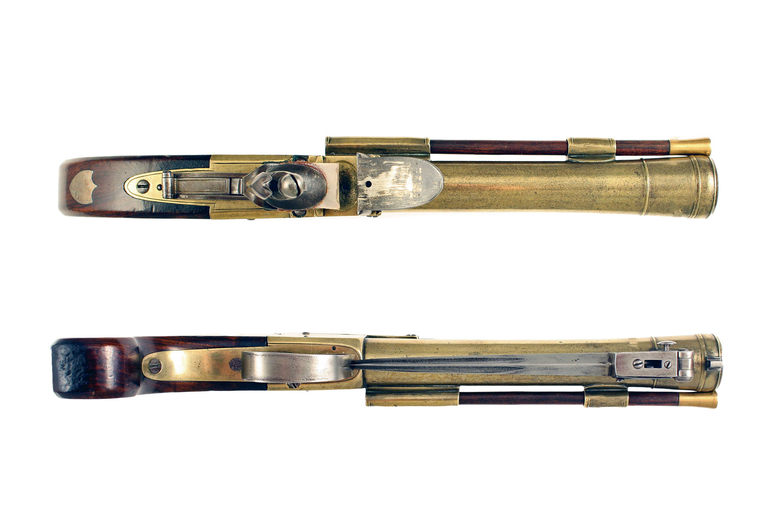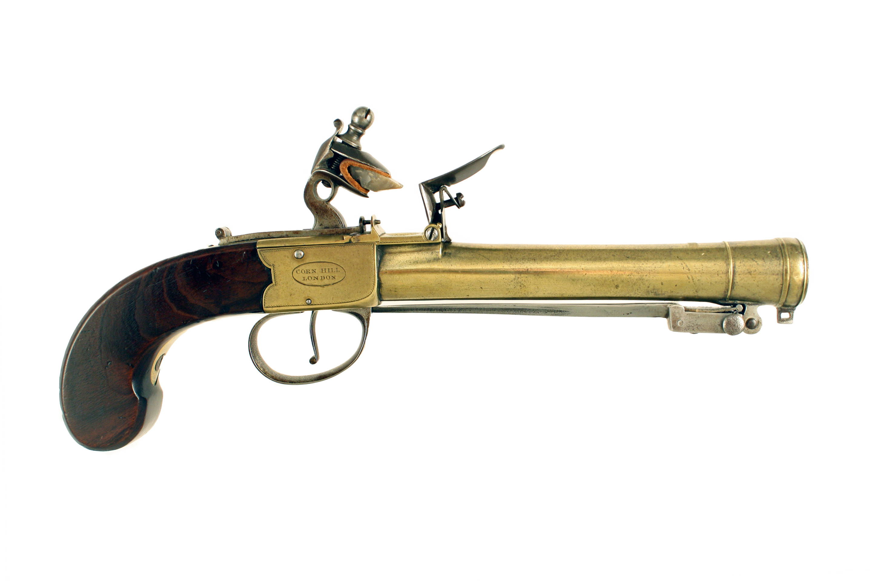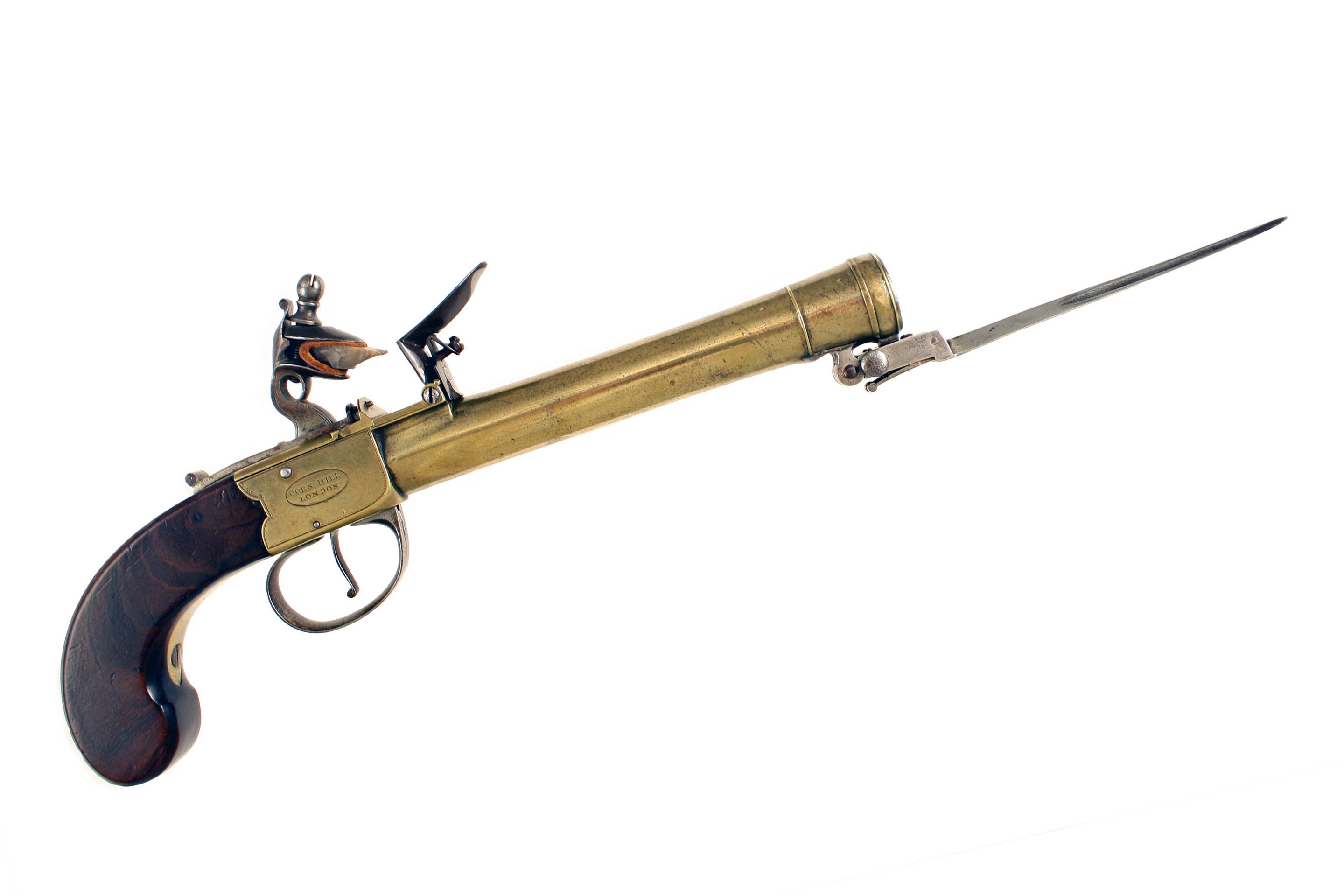 A Flintlock Blunderbuss Pistol by P. Bond, London. With belled brass barrel and action in one piece, the former formed with two mouldings at the muzzle, border engraved box-lock action, simply engraved, ‘P.BOND’ within an oval to the left and, ‘CORN HILL LONDON’ to the right, fitted with sliding safety catch and under-slung bayonet, slab sided walnut butt, engraved trigger guard that also acts as the bayonet release catch. A nice honest example.