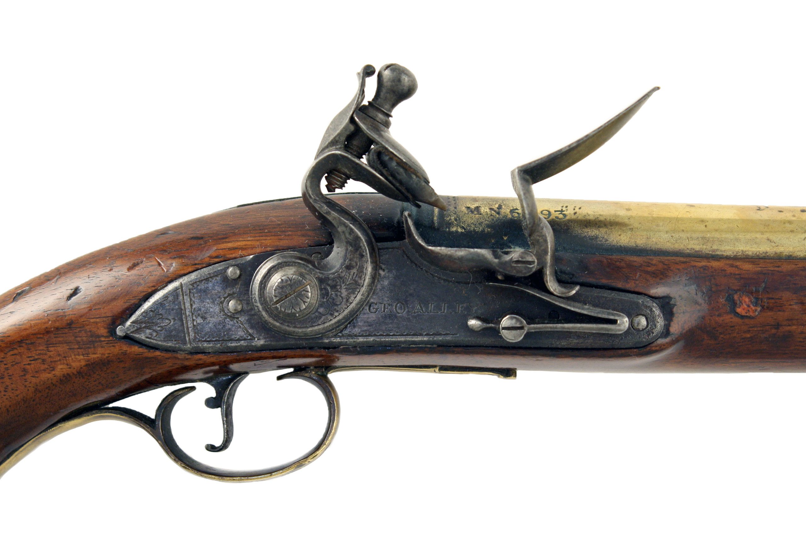 A Flintlock Blunderbuss Pistols by Geo Alley. With two stage brass barrel, belled at the muzzle, decorated with scrolling foliage and signed ‘LONDON’ within a border on the top flat, stamped with London proofs and a barrel smiths mark, the barrel is also stamped with Irish registration marks, ‘MN 693’ (for County Monaghan). stepped border engraved lock, cock decorated en suite, full-stocked in walnut (some old repairs) with slab sided grip, brass side-plate (repaired) vacant escutcheon and foliate engraved trigger guard, unusually long ram-rod pipe (possibly a replacement) with iron ramrod.