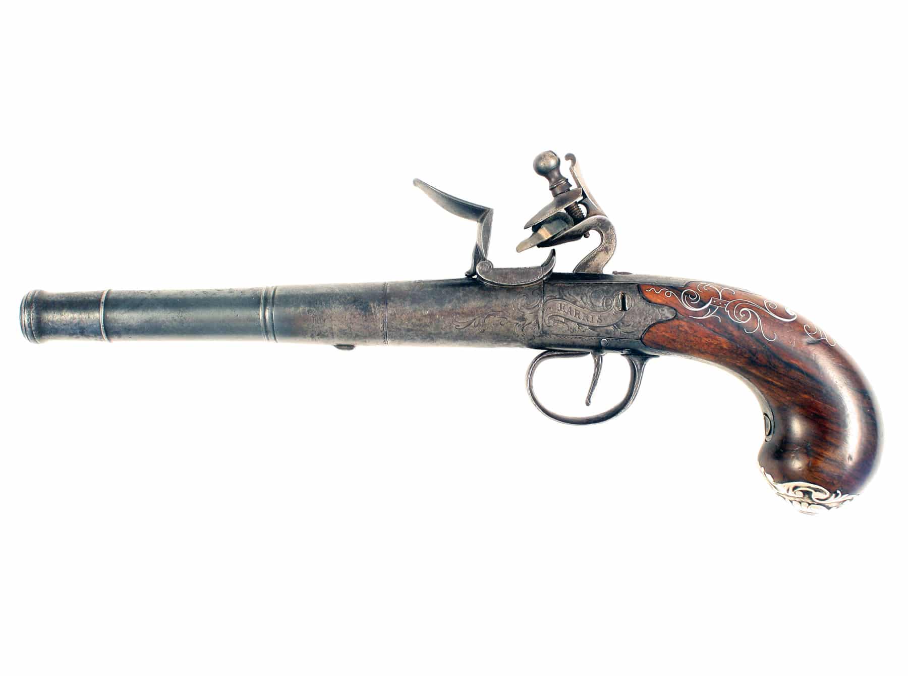 A Large 22-Bore Flintlock Box-Lock Pistol by Harris, Mid 18th Century. With turn-off cannon barrels, the breech engraved with dog-toothing, border engraved raised ovoidal pan, border engraved rounded action signed beneath a foliate spray and a cannon on ones side and a spray of foliage on the other, sliding trigger guard safety engraved on the bow with a engraved oval, swelling figured rounded butt (small split to one side) inlaid with silver wire scrollwork, and highly unusual foliate butt cap. London proof marks and barrel smiths mark.