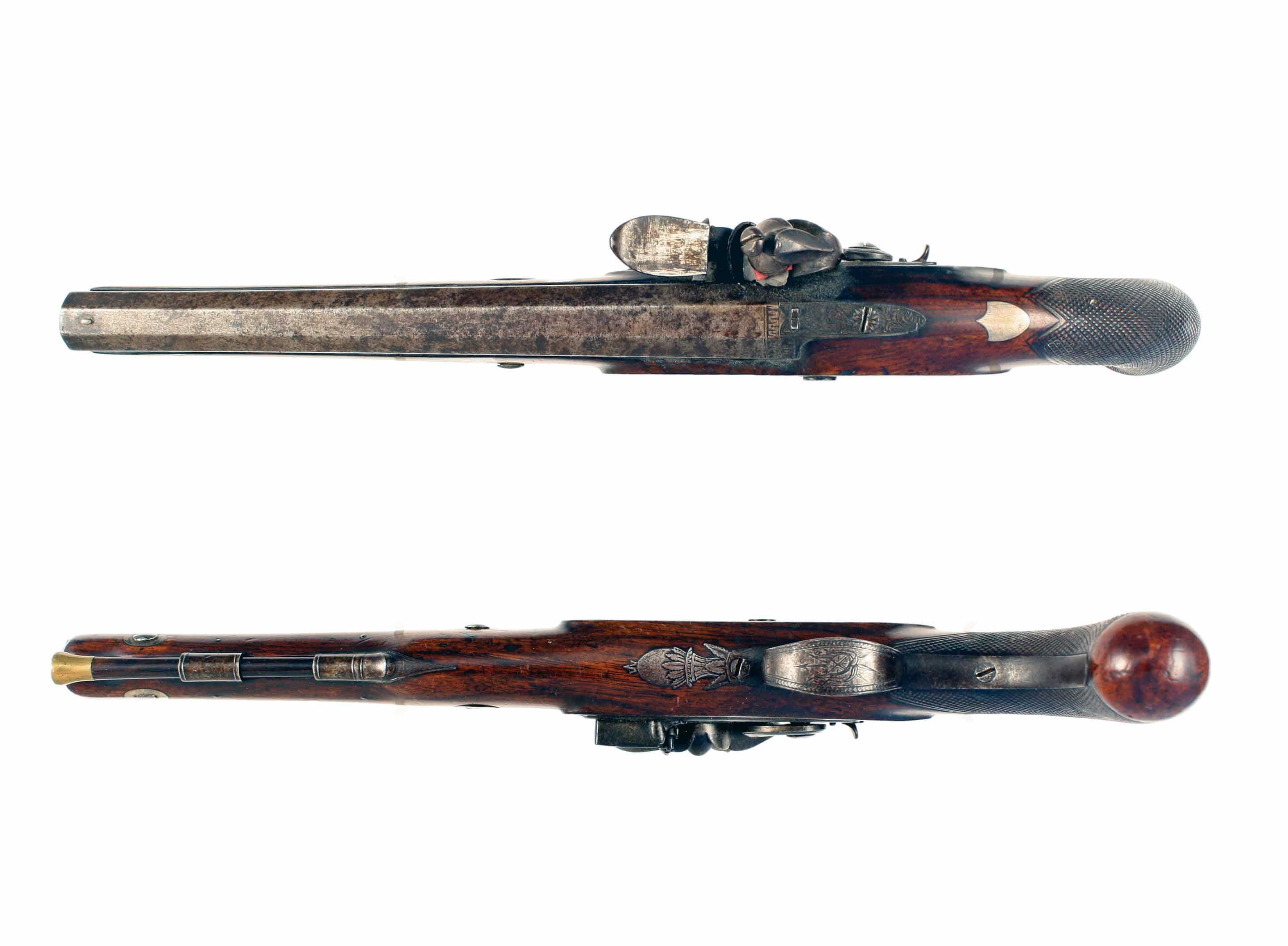 A Flintlock Duelling Pistol by Sharman. With octagonal sighted barrel decorated with a geometric band at the breech, profusely engraved tang, fitted with standing rear-sight, stepped bevelled lock, signed beneath he pan, fitted with a sliding safety catch, set-trigger, full-stocked in walnut cut with chequering at the grip, with white metal mounts comprising; vacant shiedl shaped escutcheon and barrel bolt escutcheons, steel trigger guard engraved with Britannia shield on the bow and pineapple finail, turned ramrod pipes with what appears to be original brass mounted ramrod with concealed worm.