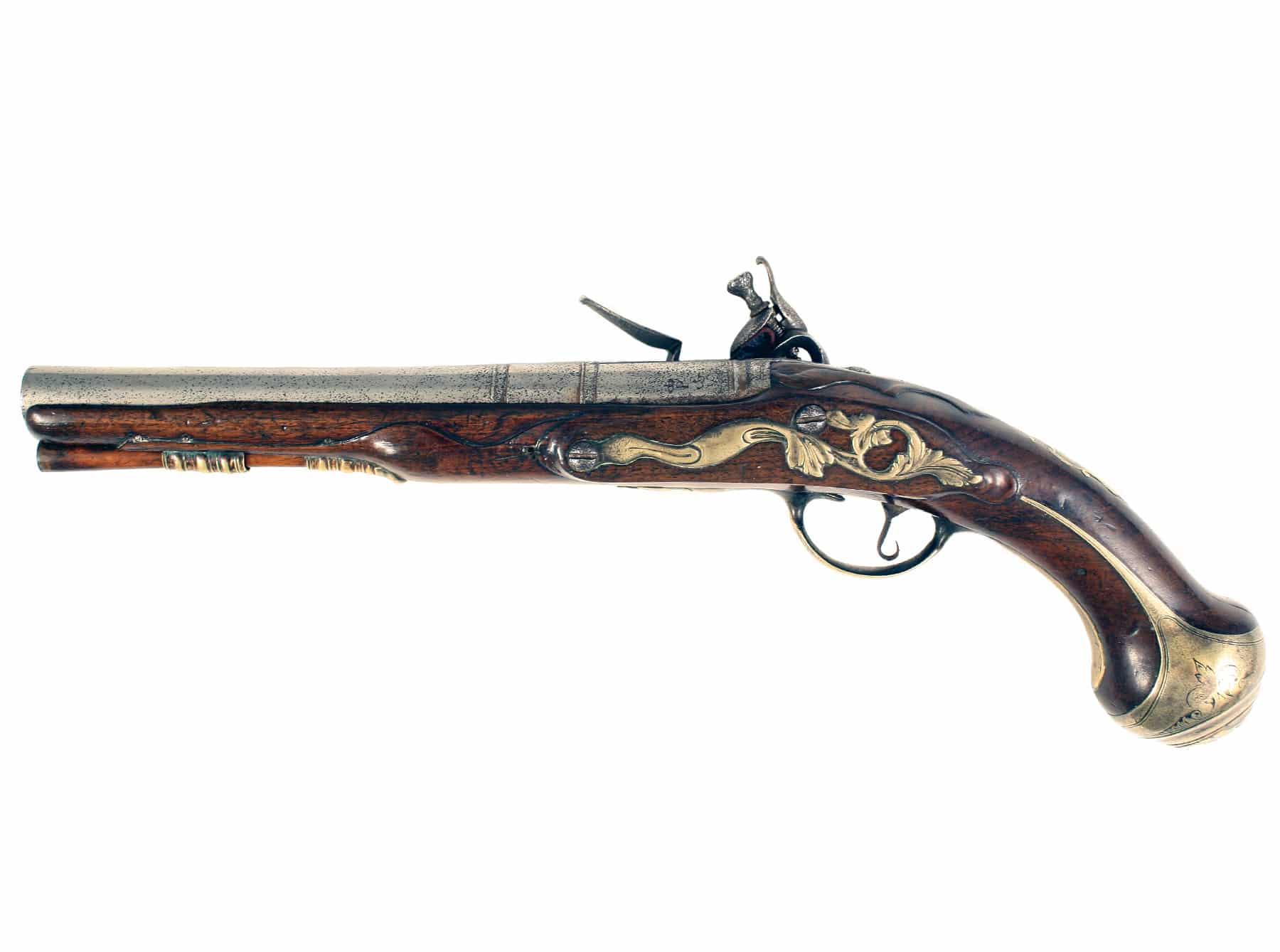 An Early Flintlock Holster Pistol by Goodridge of London. With three stage steel barrel, slightly swamped towards the muzzle, struck with London proofs and traces of barrel smiths mark, plain tang cut with sighting groove, border engraved banana lock, signed along the bottom, full-stocked in walnut with raised mouldings around the lock, ramrod channel and barrel tang, engraved brass furniture including long eared butt cap with grotesque mask, line engraved trigger guard with stylised acanthus leaf finial, turned ramrod pipes, with brass capped wooden ramrod.