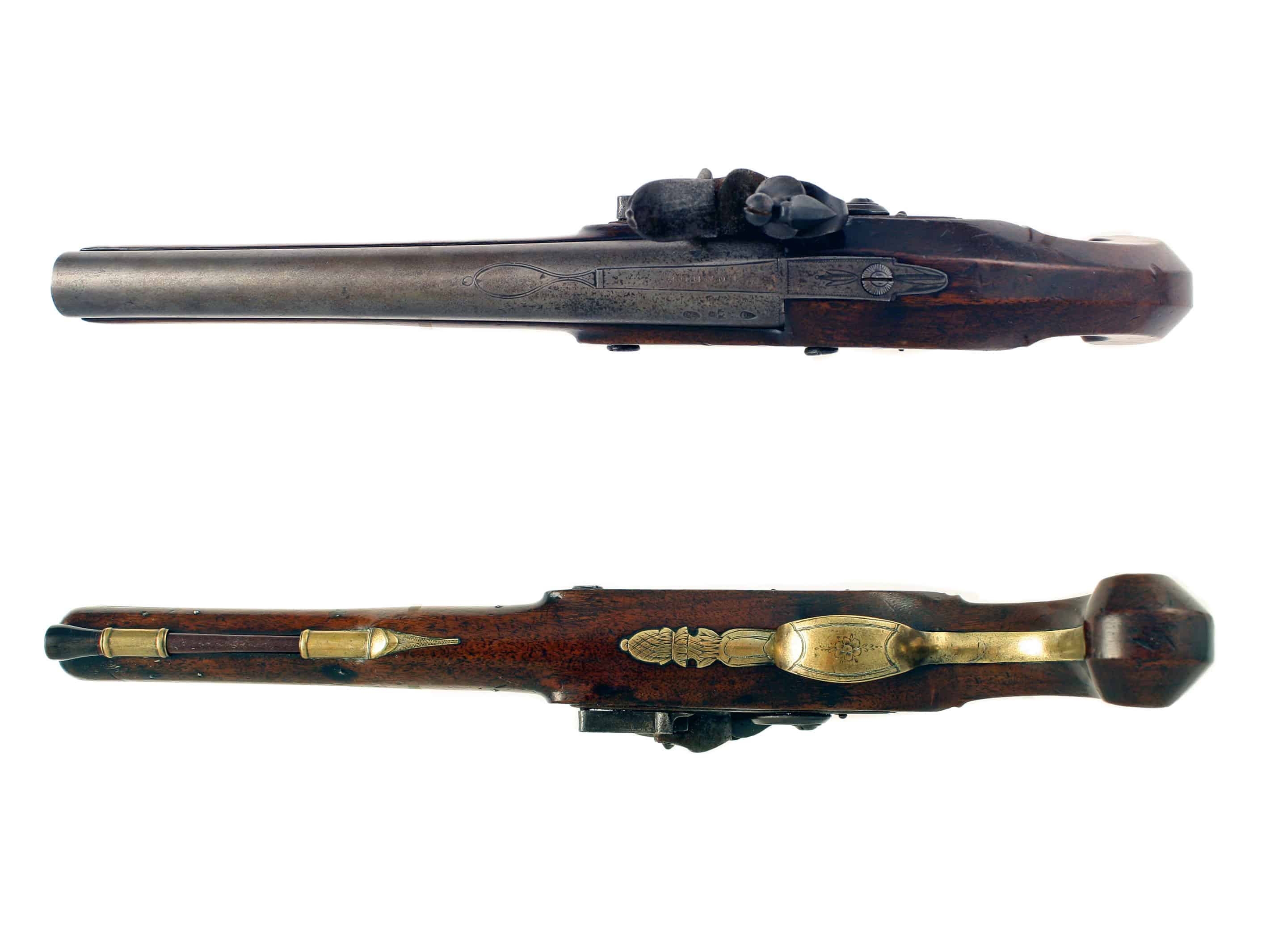 A Flintlock Officers Pistol by Wogdon. With round tapering barrel, signed ‘LONDON’ within an elongate teardrop, stamped with London proofs and Wogdons own barrel smith mark, border engraved tang and screw, stepped bevelled lock, signed within an oval wreath beneath the pan, full-stocked in walnut with slab-sided grip, brass furniture comprising trigger guard, decorated with a flower head on the bow and pineapple finial, turned brass ramrod pipes and horn tipped ramrod.
