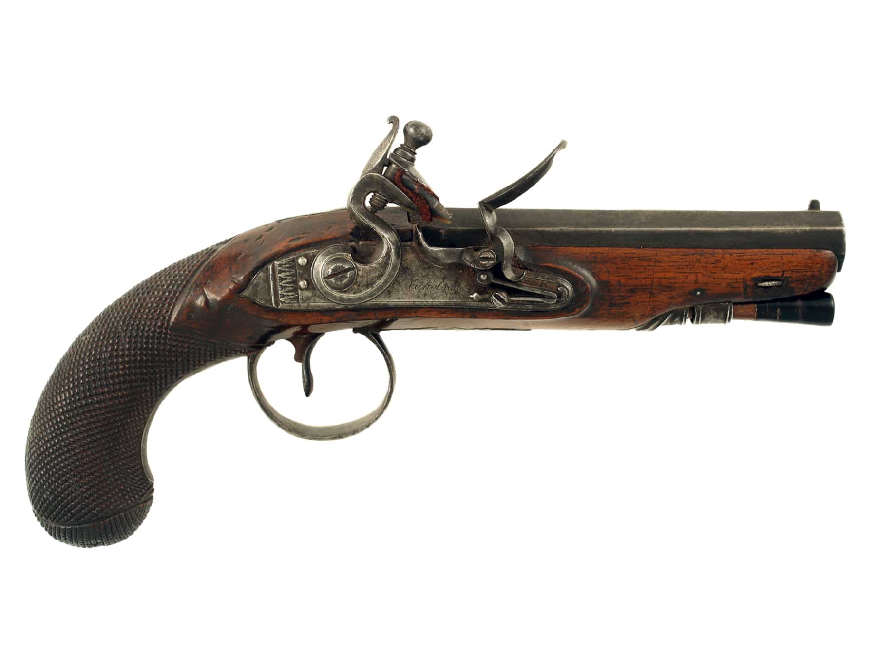A 25 Bore Flintlock Overcoat Pistol by Nicholson of London, Circa 1800. With sighted octagonal barrel engraved ‘London’ along the top flat and struck with Tower private proofs, decorated with a band of foliage at the muzzle, the tang decorated en suite with raised rear sight, stepped, signed, bevelled lock, full-stocked in walnut cut with deep chequering at the butt, steel mounts comprising trigger guard decorated with foliage on the bow and with pineapple finial, turned ramrod pipes with horn tipped ramrod.