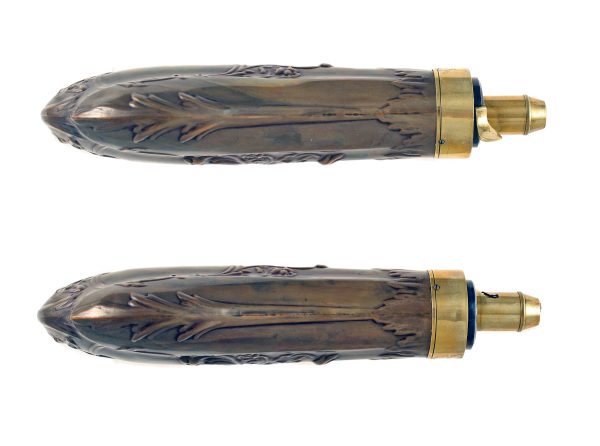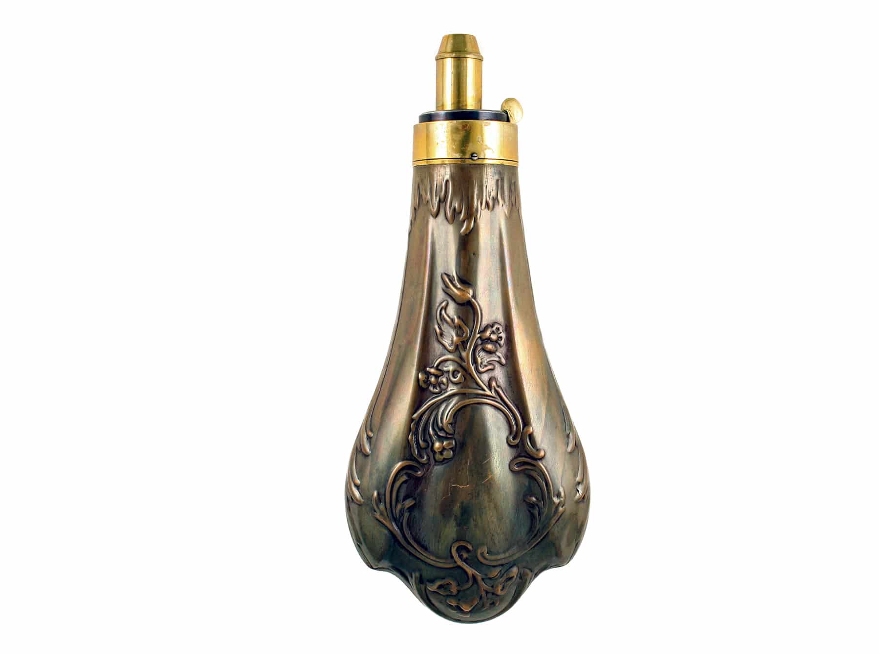 A Foliate Decorated Fluted Powder Flask. Retaining much original finish, blued spring.