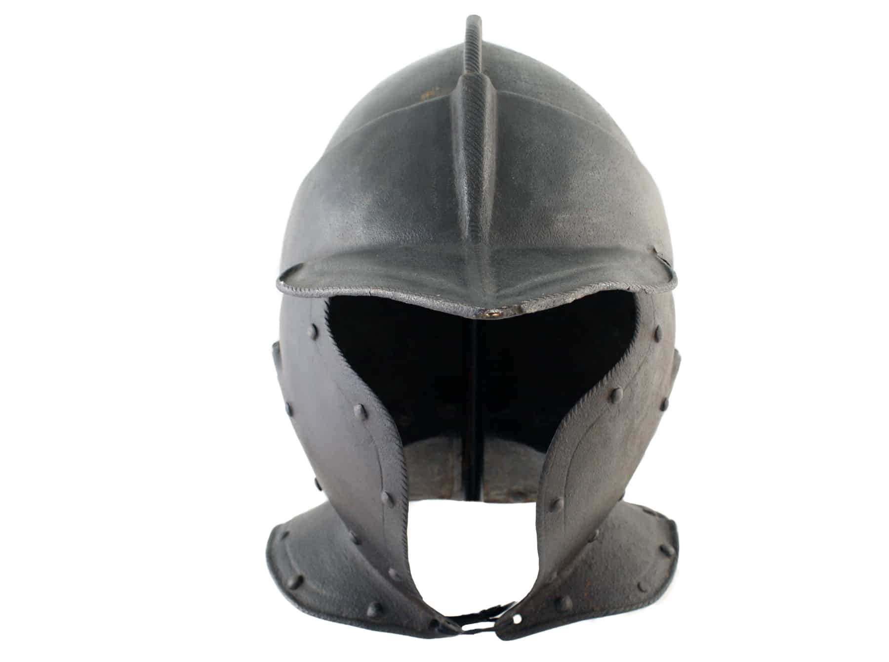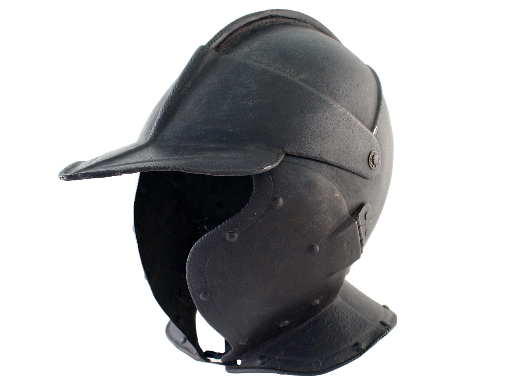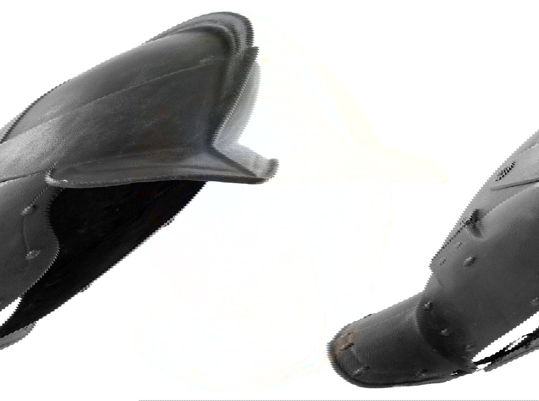 Decoration: The skull is boldly embossed with two lateral ribs rising up from beneath the arms of the peak, and meeting the comb at an angle of 90 degrees, forming a cruciform design. Both the ribs and the comb are boldly file-roped, as are all turned edges on the peak, cheek pieces and neckguard. The roping of the comb is carried down onto the peak, where it is embossed to accommodate it. The turned edges of the peak, neckguard and lower edges of the cheek pieces have sunken bands, while these bands are simply suggested on the leading edges of the cheek pieces by a single engraved line.