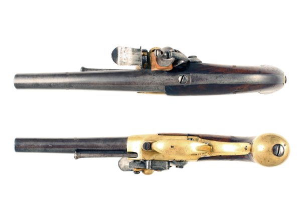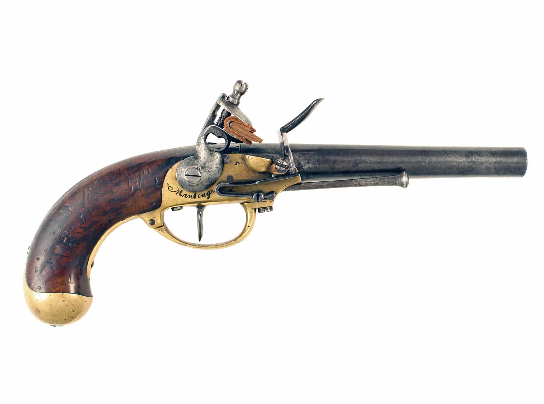A French Model 1777 Flintlock Cavalry Pistol. With round tapering barrel struck ’82’ at the breech, steel tang, brass action signed, Maubeuge beneath the cock, and stamped with inspection mark near the pan, belt hook has been removed, swelling walnut butt with brass butt cap, brass trigger guard and original steel ramrod. A nice example.