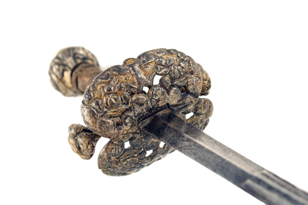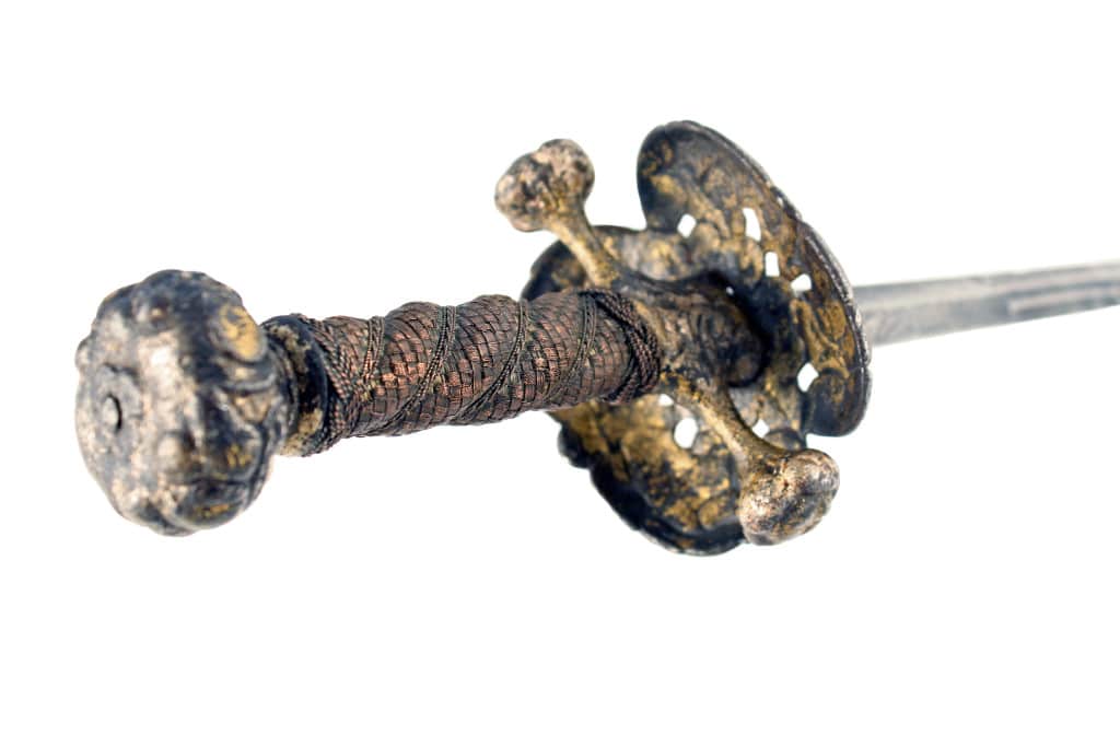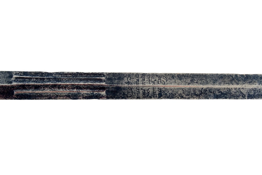 A French Transitional Rapier of Pillow-Sword Type, third quarter of the 17th Century. With tapering double edged blade of flattened diamond section, engraved on both sides at the forte with an angel holding a sword and the blade smiths details, cut with four small flutes and then engraved again with what appears to be a motto on both sides, iron hilt comprising double shell-guard, short quills with large lobed terminals, compressed globular pommel, and grip with beautifully plated iron wire between Turk’s heads, the surfaces throughout retaining traces of original gilding.