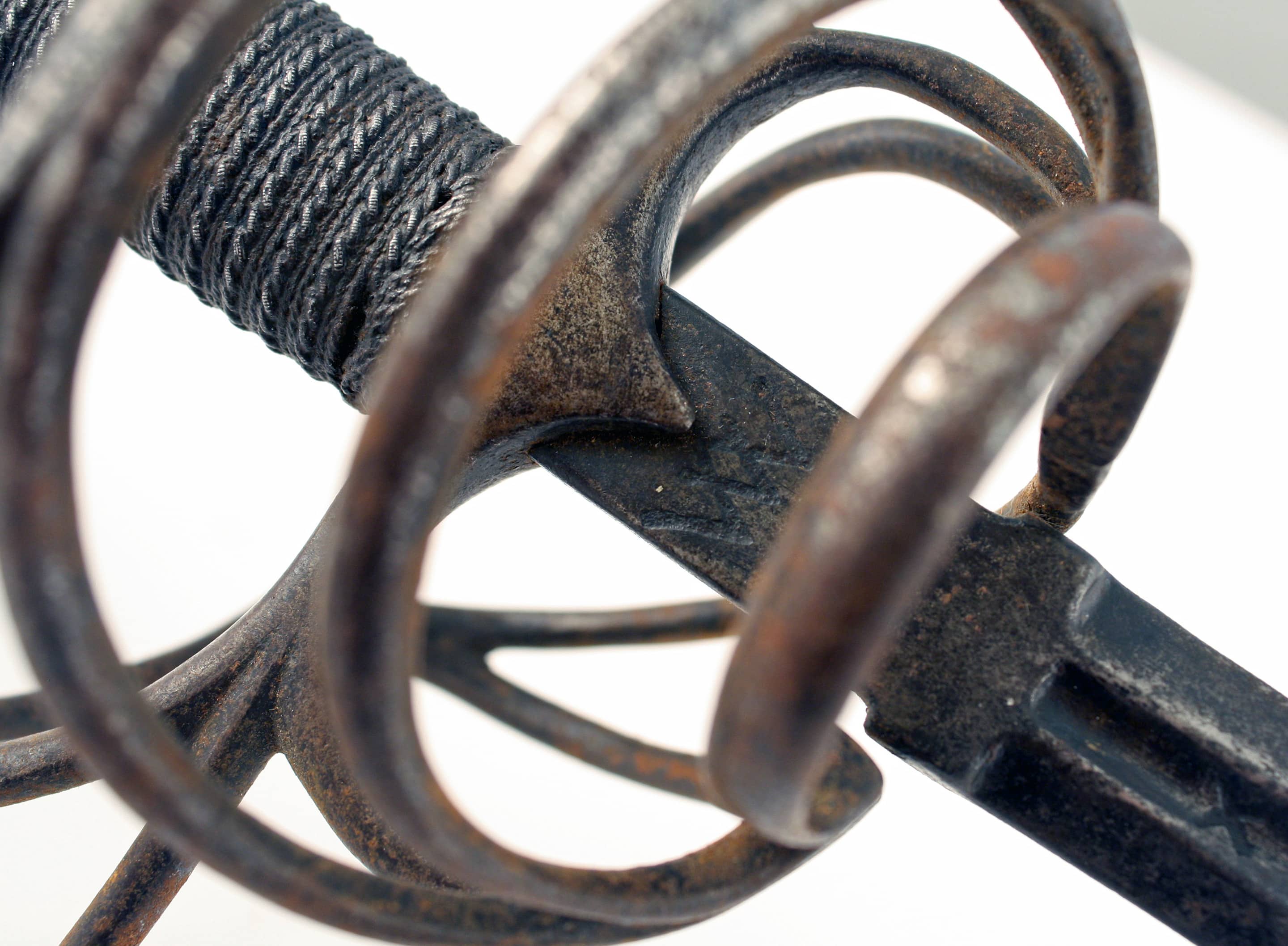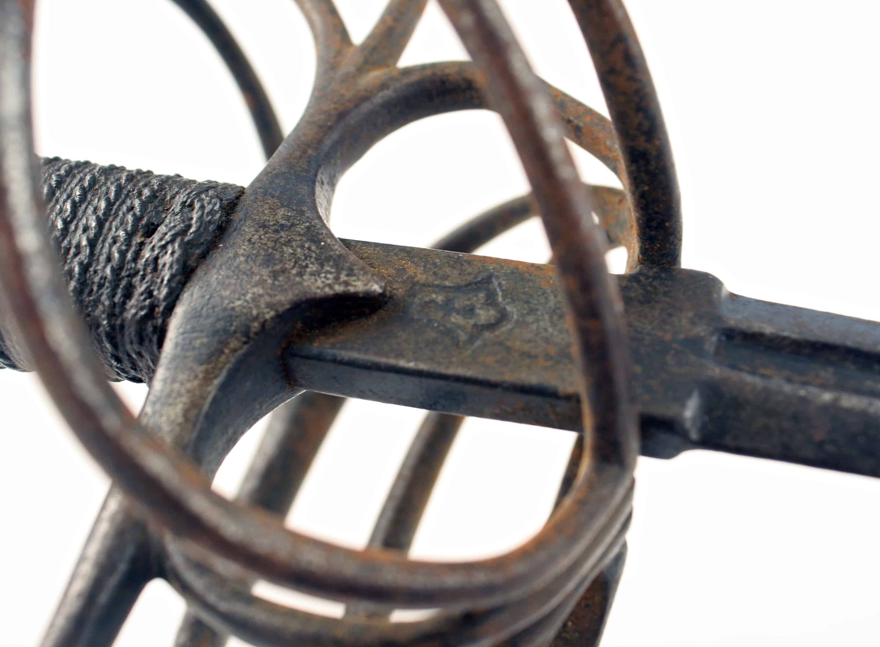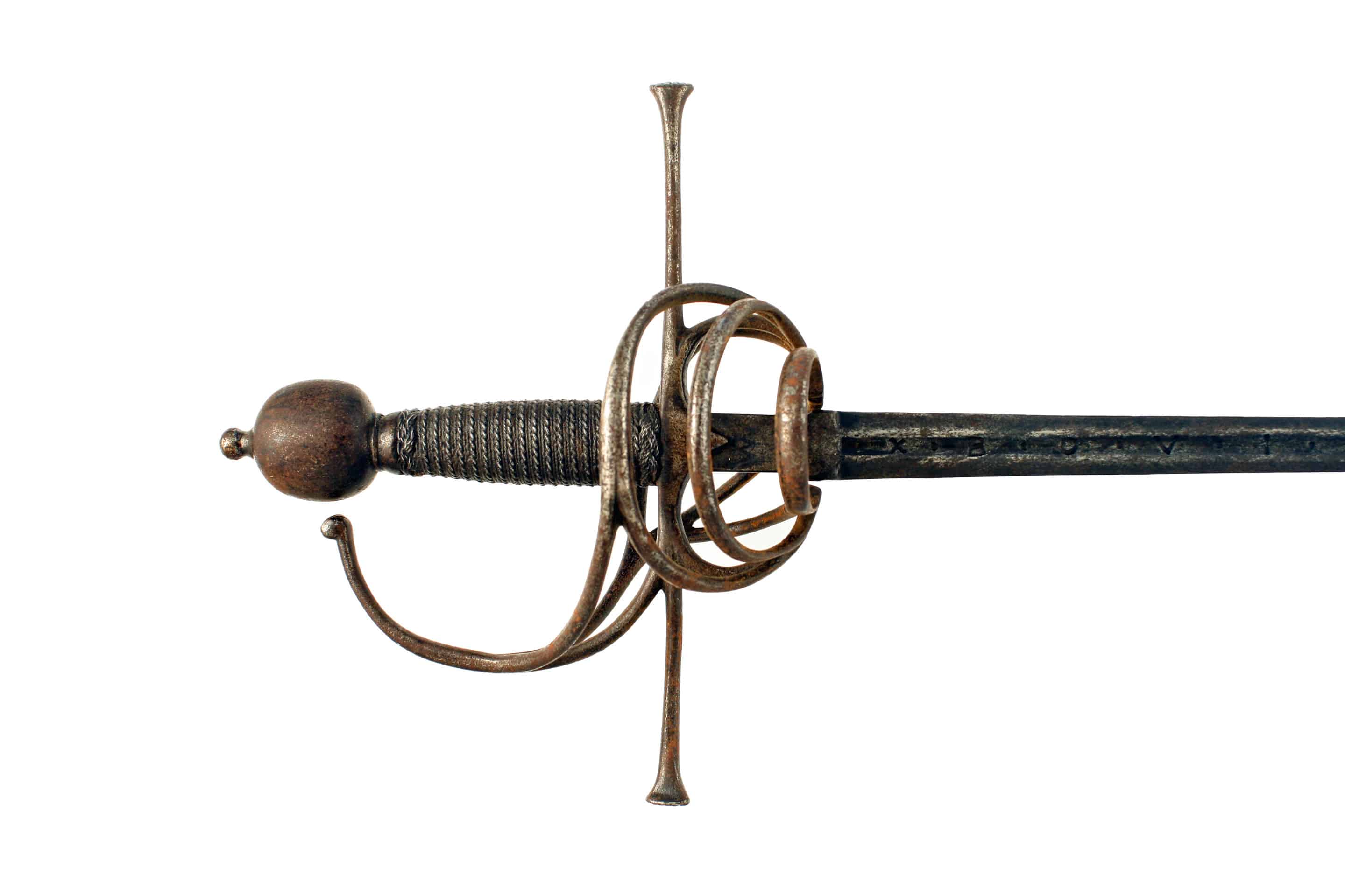 A German Munitions Grade Rapier, early 17th Century. With sharply tapering double-edged blade of slightly hollowed flattened diamond section, the fuller on each side stamped, ‘X.B.O.V.I.N.A.X-‘ and the ricasso stamped with a blade smiths mark and what appears to be two overlapping ‘M’ marks, hilt of rounded bars comprising straight quills swelling towards the tips, three outer rings, the upper one with a bar rising to join the knuckle-guard, and inner trifurcated bar swept to join yhr knuckle guard, blackened ovoidal pommel with button, grip bound with twisted wire between Turk’s heads, the guard retaining some of its blackened finish.