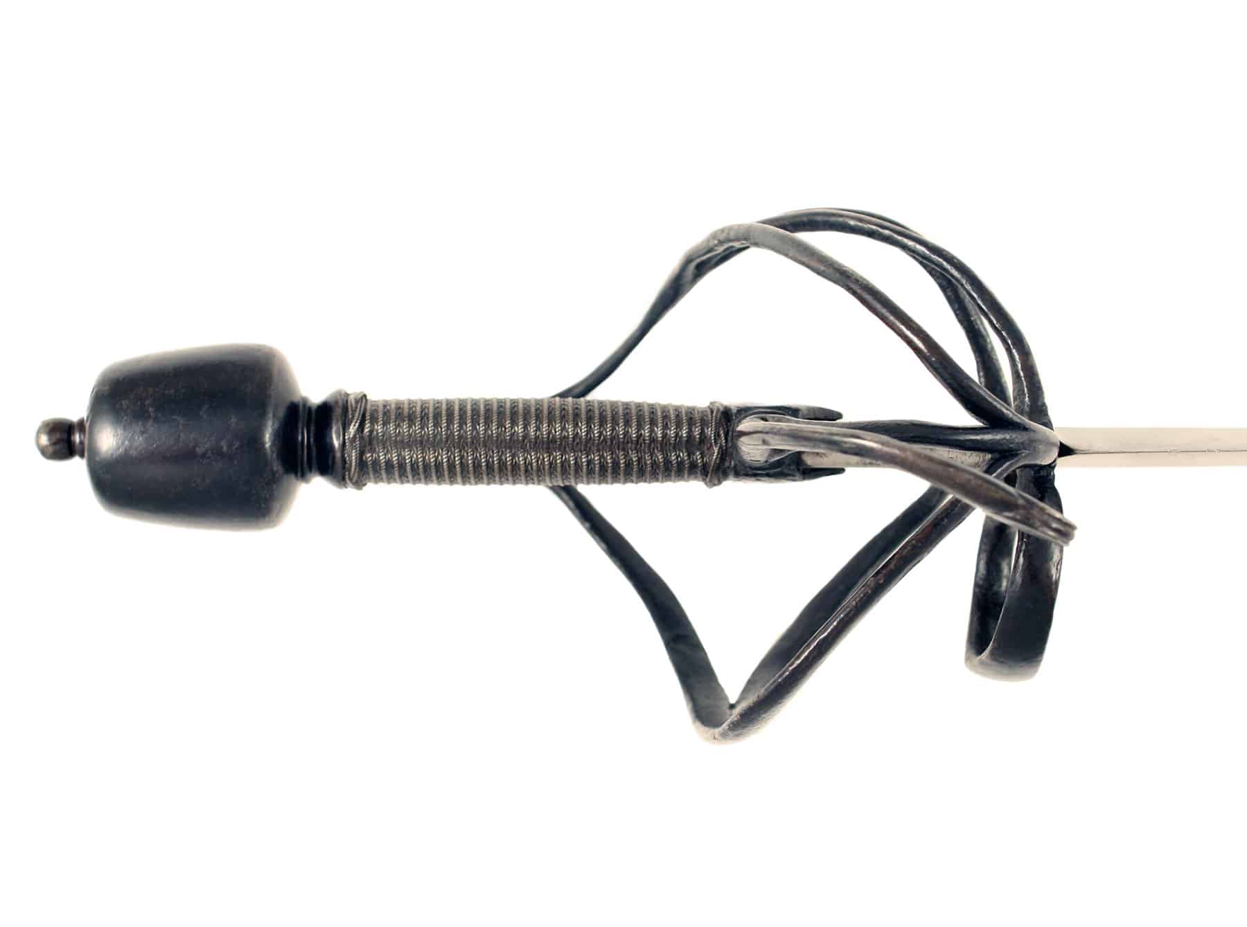 With broad sharply tapering double-edged blade of flattened diamond section, recessed ricasso struck on each face with a bladesmith’s mark with incised line borders, iron hilt retaining a large amount of original blueing and comprising asymmetrical guard of flattened bars comprising two other side-rings linked to the knuckle-guard by a curved bar above, inner-guard of three slender bars of rounded section swept-up to join the knuckle-guard, downcurved rear quillon with lobed terminal, flattened barrel-shaped pommel with button finial, and original wooden grip fluted along each side and bound with twisted iron wire
