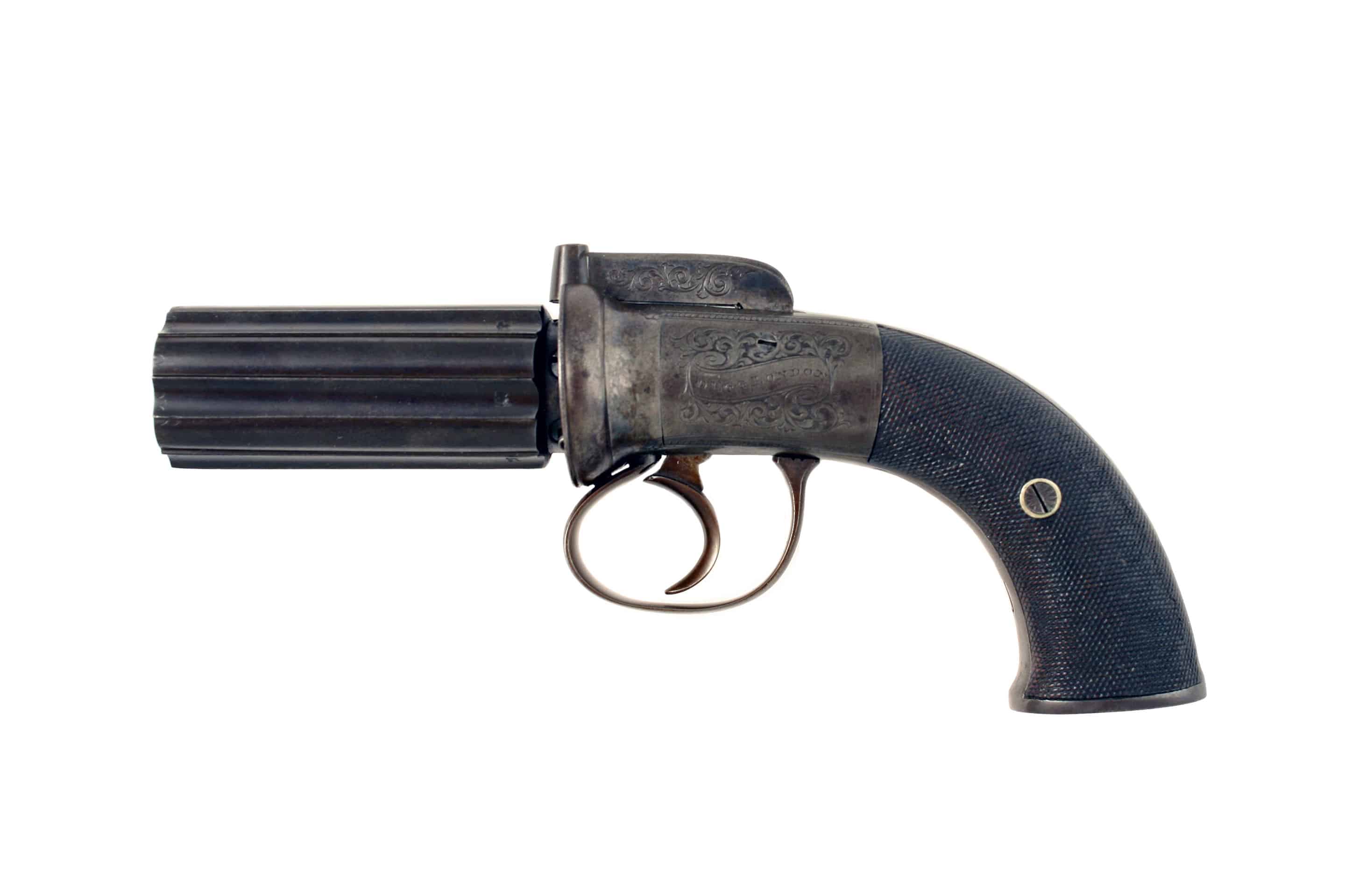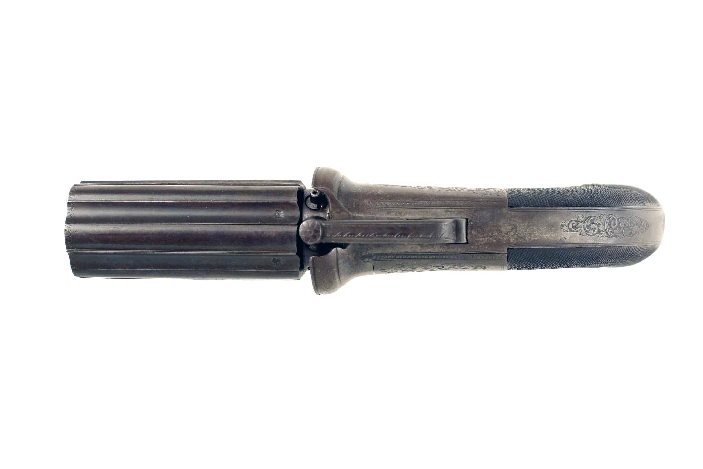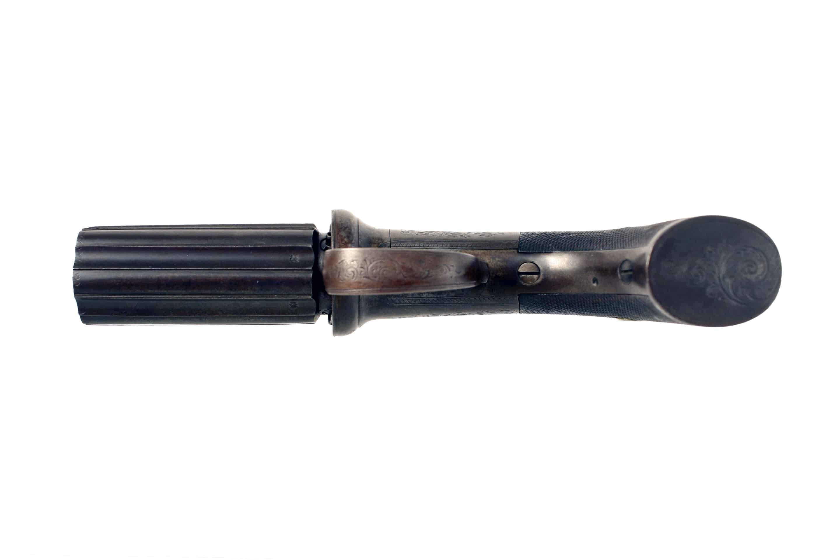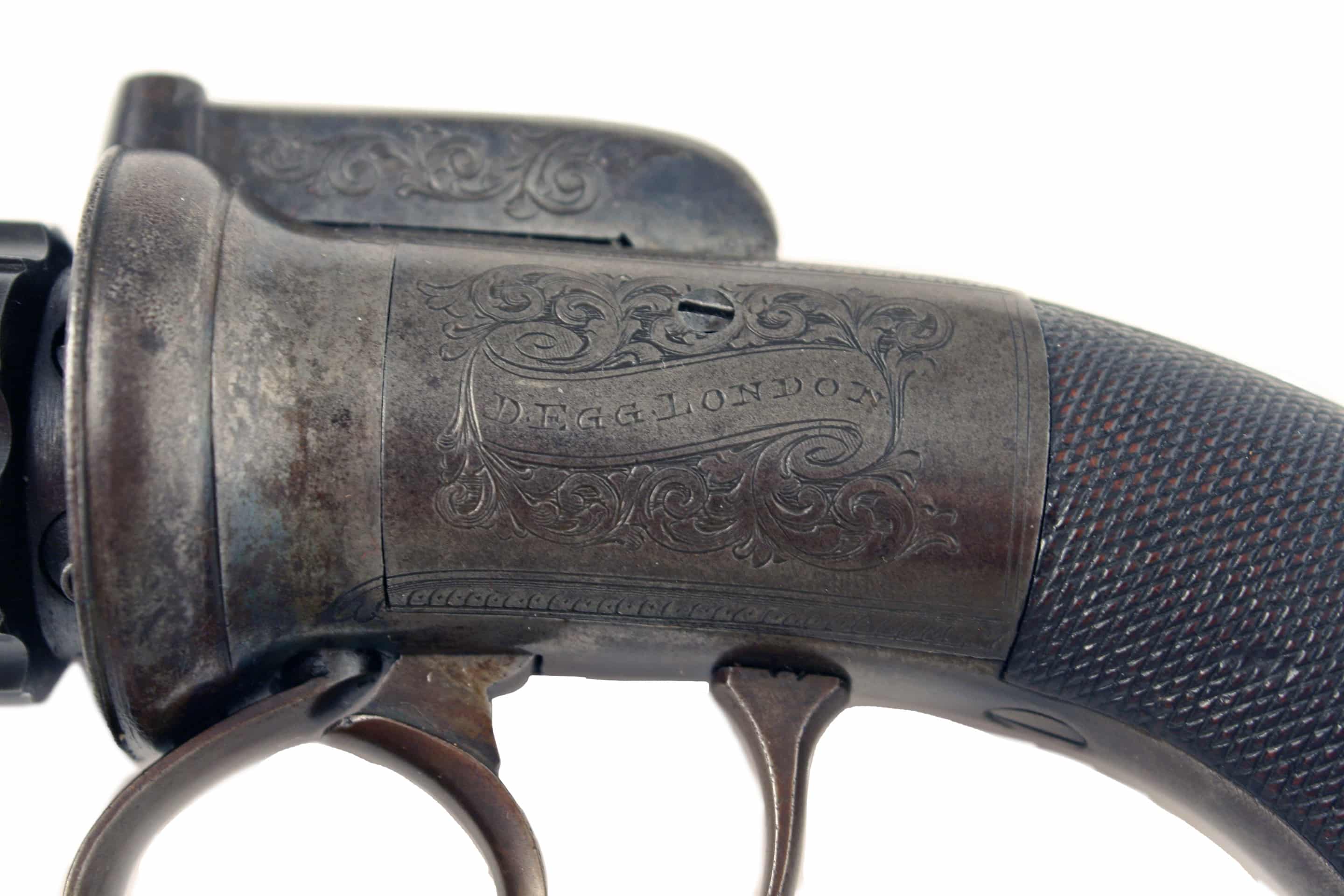 A Good120-Bore Pepperbox Revolver by D.Egg. With case-hardened fluted six-shot barrel block, decorated with a band of foliage at the muzzle and stamped with Birmingham proofs at the breech, rounded action decorated with scrolling foliage, signed ‘D.EGG’ on a scroll, scroll engraved trigger guard, slab walnut grips, in good condition.