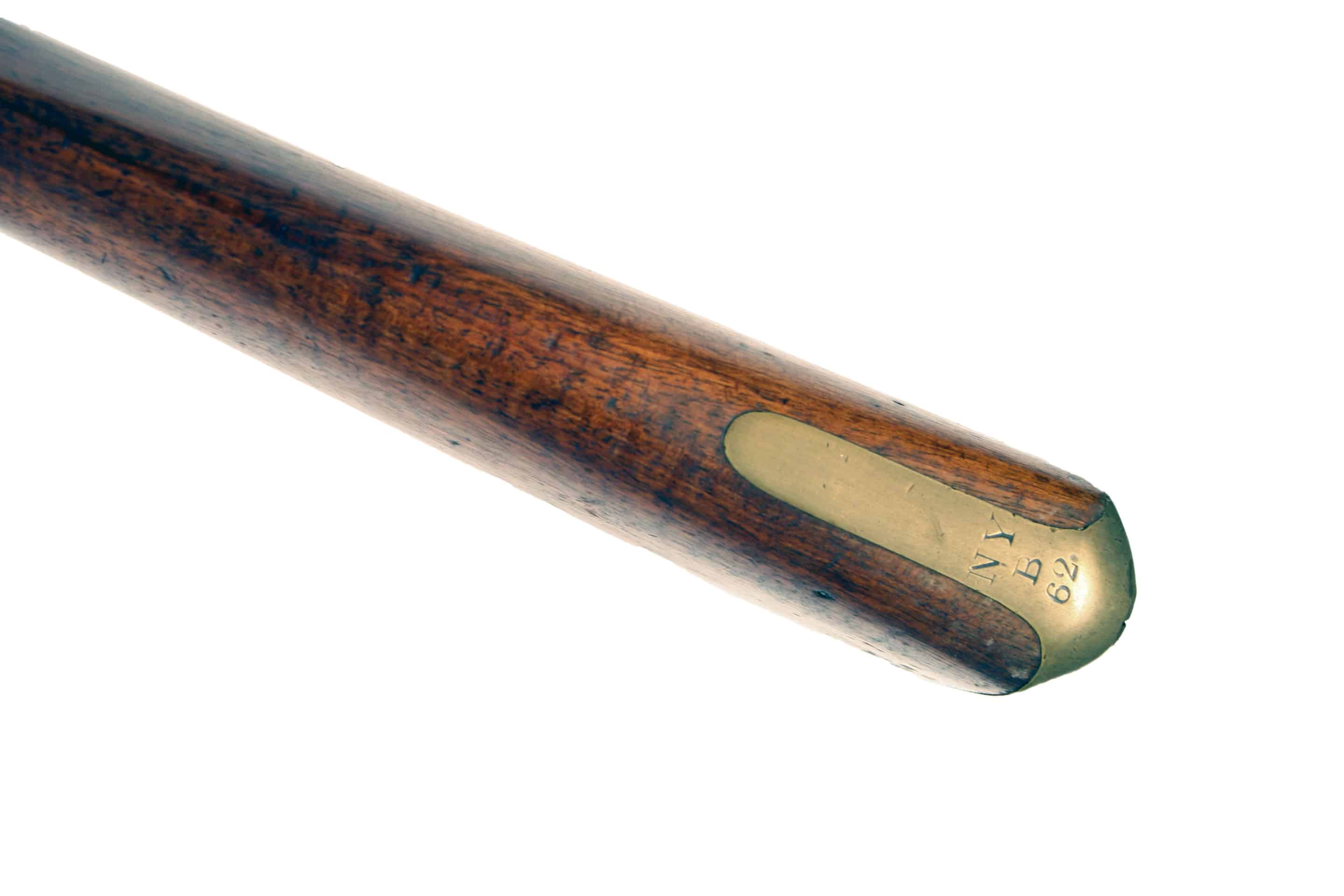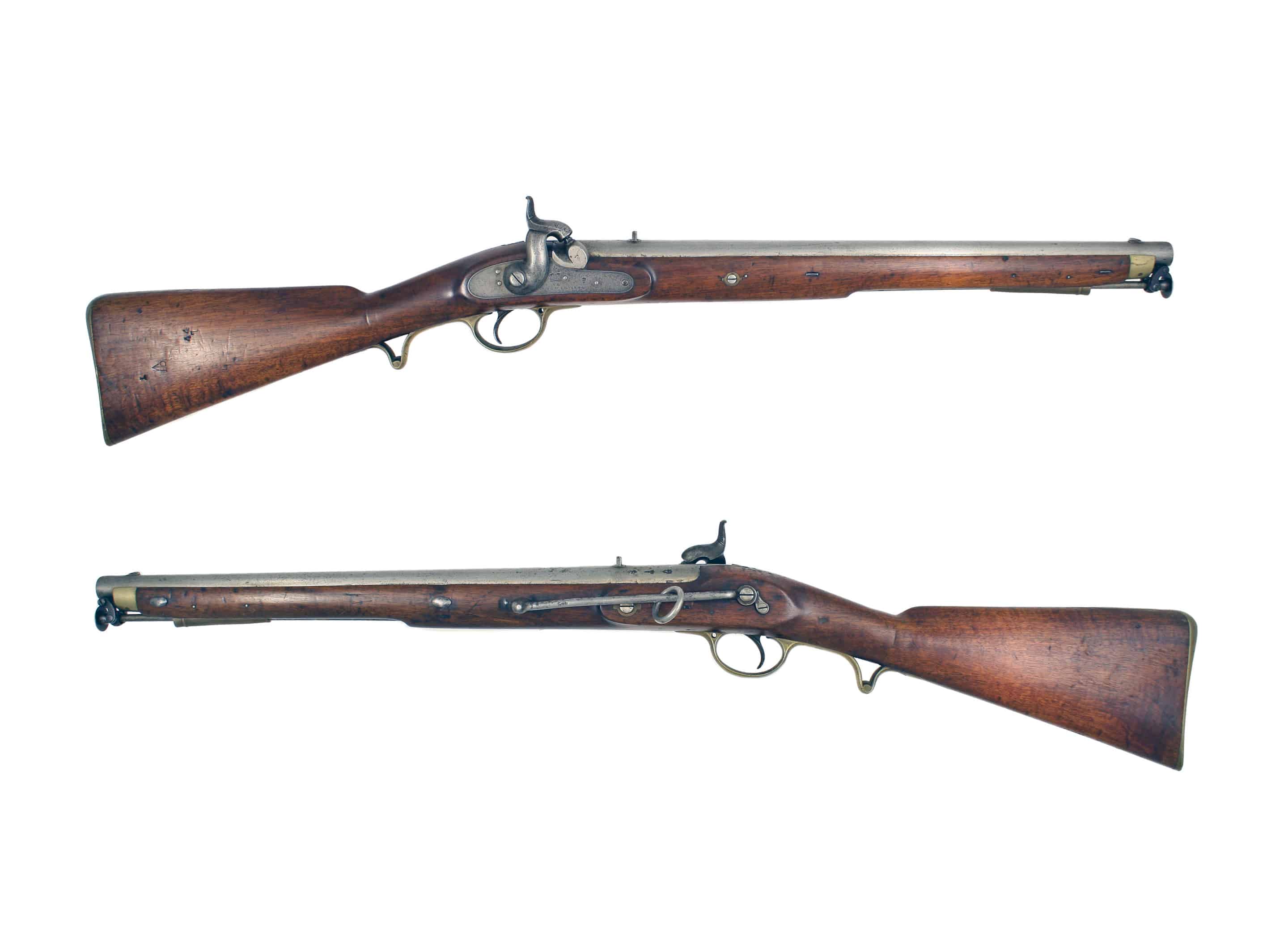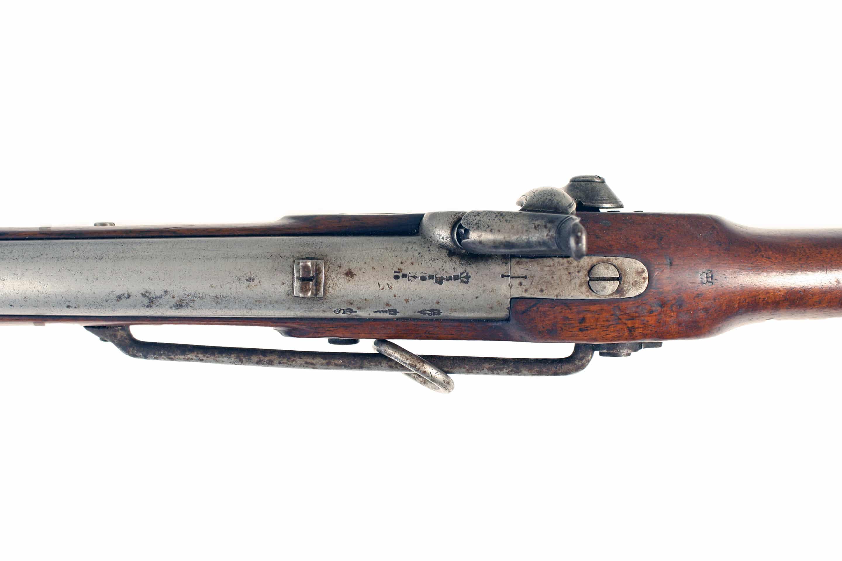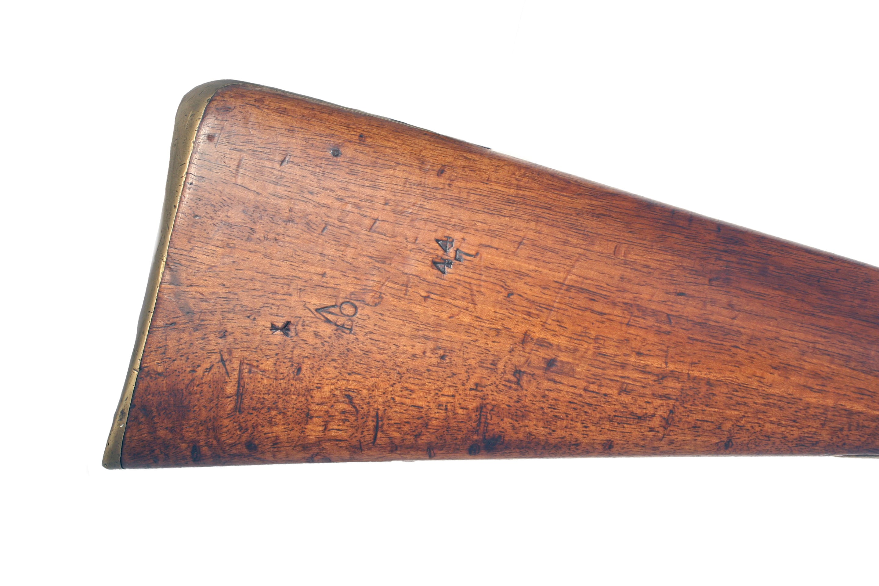 A Good British Military Percussion Carbine, Dated 1844. With round sighted barrel, dated flat lock with crowned ‘V.R.’ over ‘TOWER’ and dated 1844, full-stocked in walnut and stamped with various British Military inspection marks, regulation brass mounts including butt plate stamped ‘NY/B’ over ’62’ on the heel of the tang, saddle bar ring and stirrup ramrod, Ordnance view and proof marks.