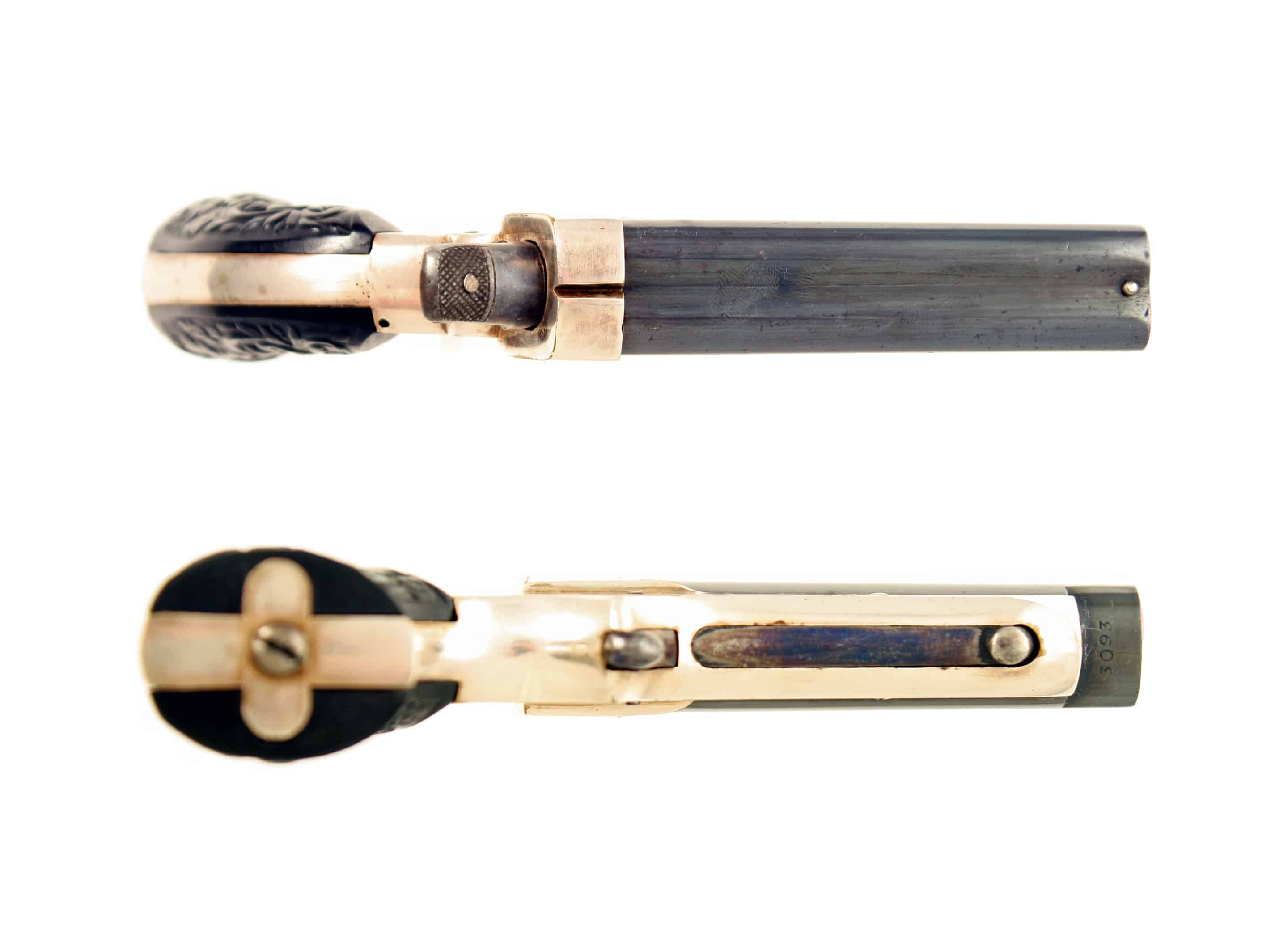 A Good Cased .32 Rim-Fire Tipping & Lawden Sharpes Patent Four Shot Derringer. With blued fluted sighted barrels, sliding forward for loading and with spring release beneath, silvered action and butt, the former stamped ‘TIPPING & LAWDEN SHARPS’ PATENT’ in a circle on one side, rotating hammer-nose, spurred trigger, rounded gutta-percha grips each pressed with foliage against a chequered ground, and much original finish: in original fitted case lined in blue baize, with original retailers label, ‘Edwin Wilson – Late Brown & Co.’ the exterior of the detached lid veneered in walnut, Birmingham proof marks.