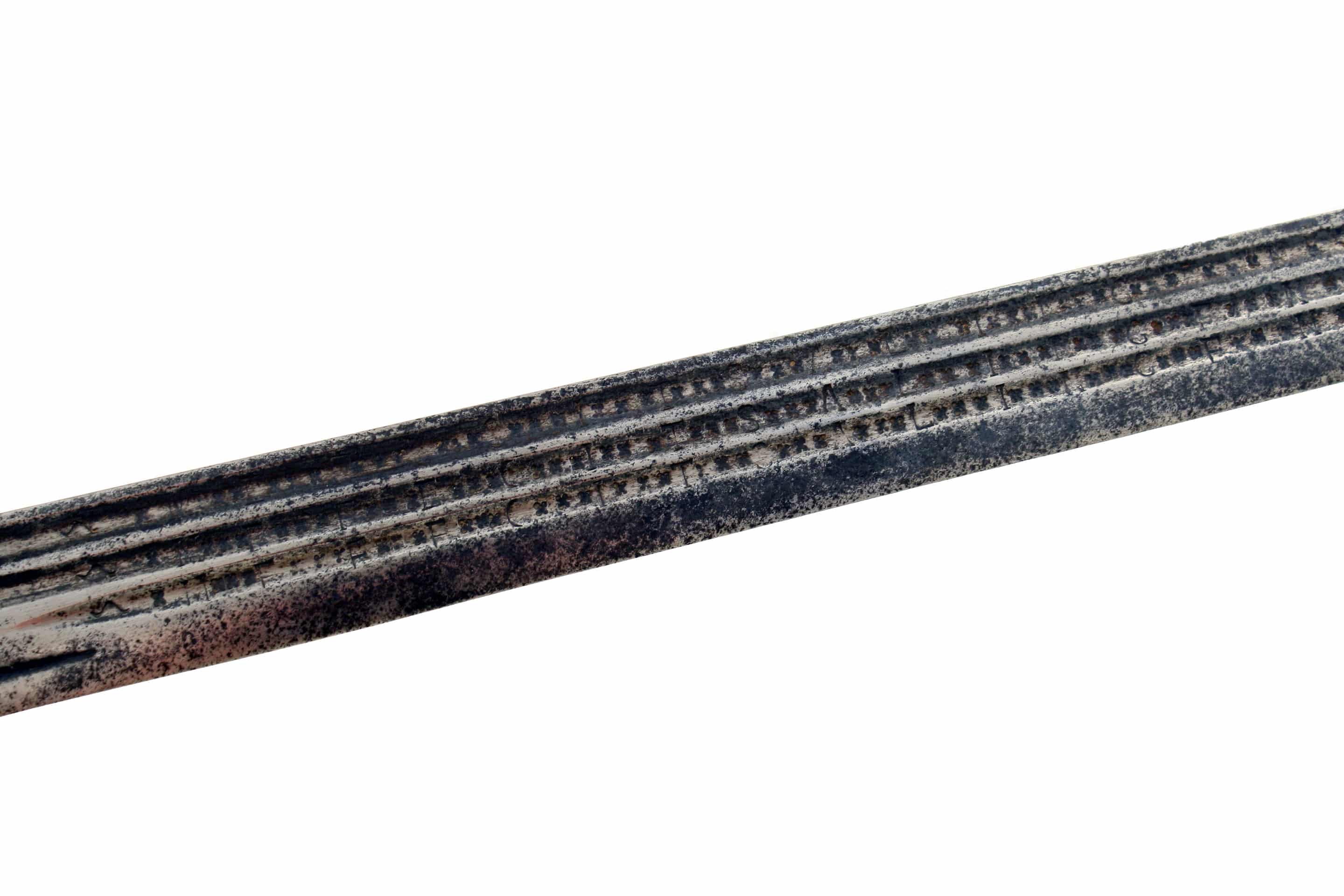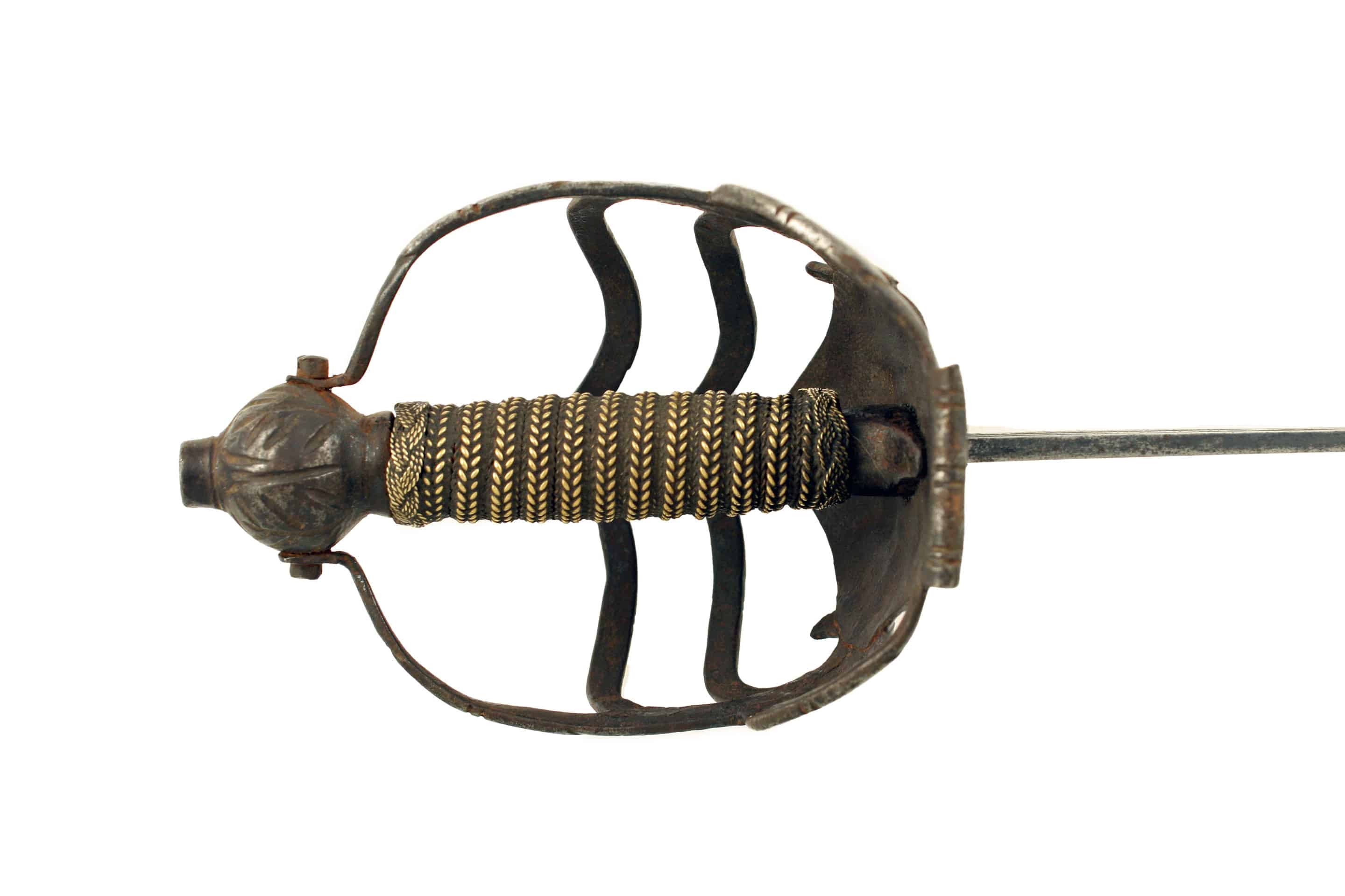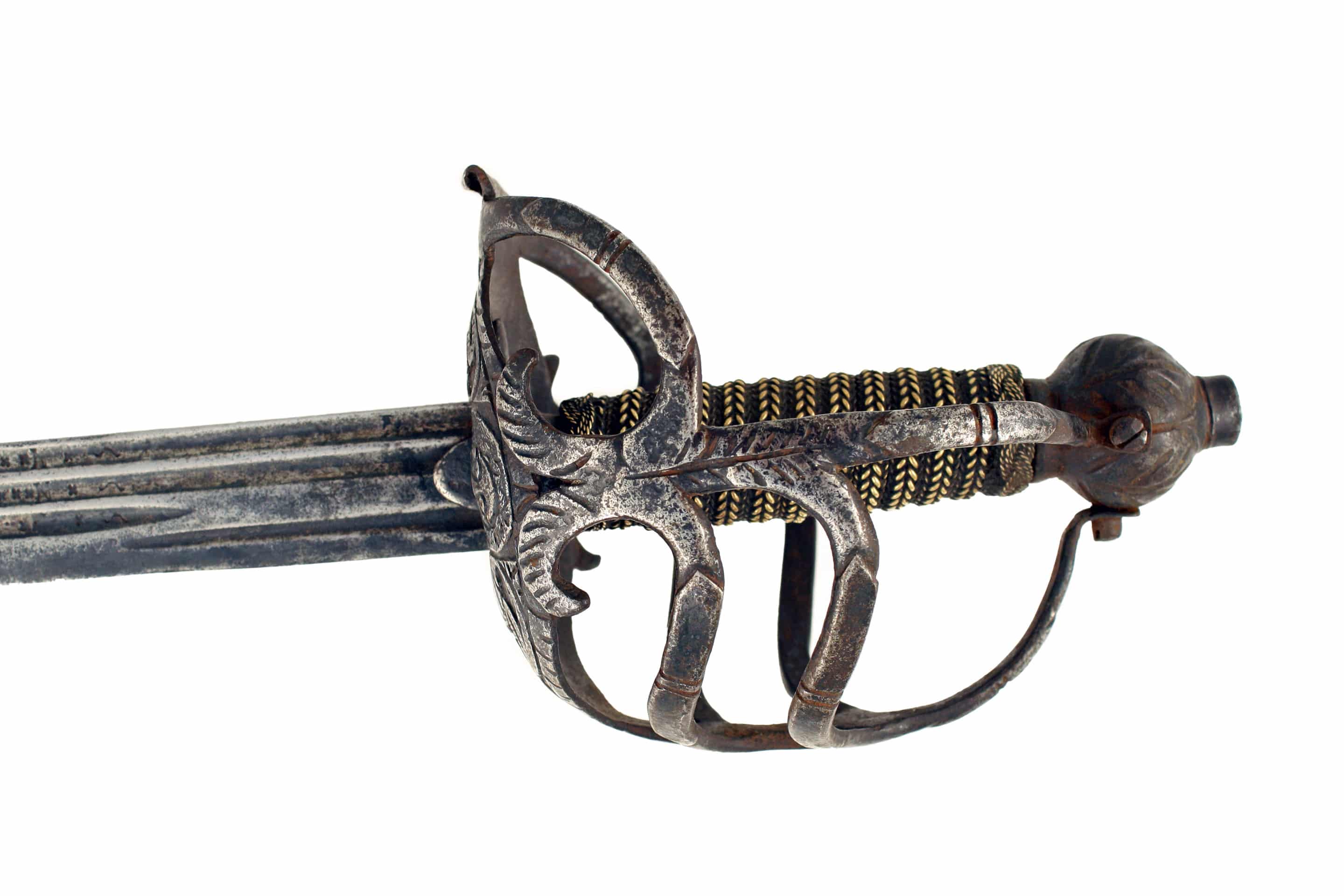 A Good English Civil War Mortuary Sword, Circa 1640. With tapering single edged blade, double edged towards the tip, cut with four fuller, three of which run the entire length of the blade, stamped within the fullers on both sides; ‘FECIT SALINGEN’ in each of the three fullers, hilt comprising solid guard chiselled with a male bust on each side between foliage, short scrolled wrist guard, knuckle guard connected by two diagonal bars and two bifurcated side-bars chiselled with foliage, the knuckle guard and side-bars screwed to the globular pommel, the latter decorated with foliage and with flattened button, grip bound with twisted brass wire between two Turk’s heads.