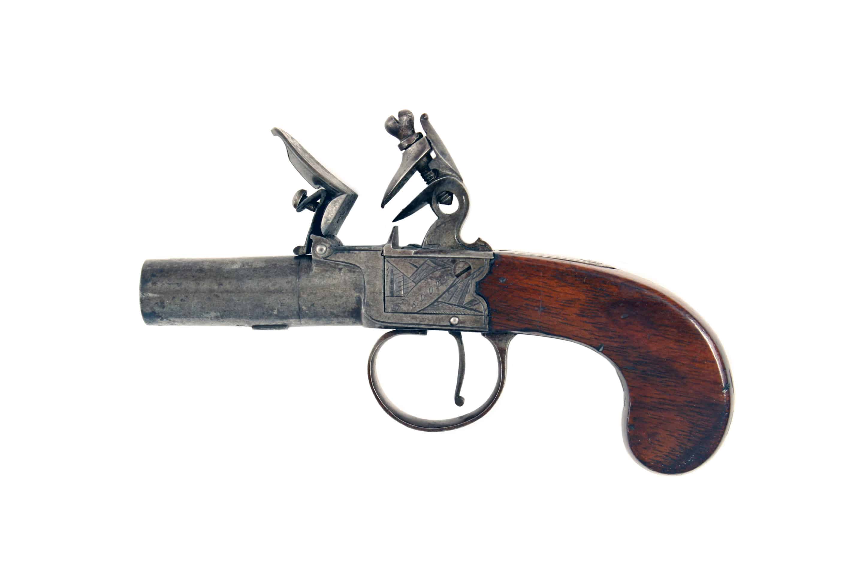A Good Flintlock Box-Lock Pocket Pistol by Scott. With round turn-off barrel, stamped beneath with Birmingham proofs, border engraved box-lock action, signed within an oval ‘SCOTT’ to the left, surrounded by stands of arms and ‘LONDON’ within an oval to the right, slab sided walnut butt. In good clean condition.