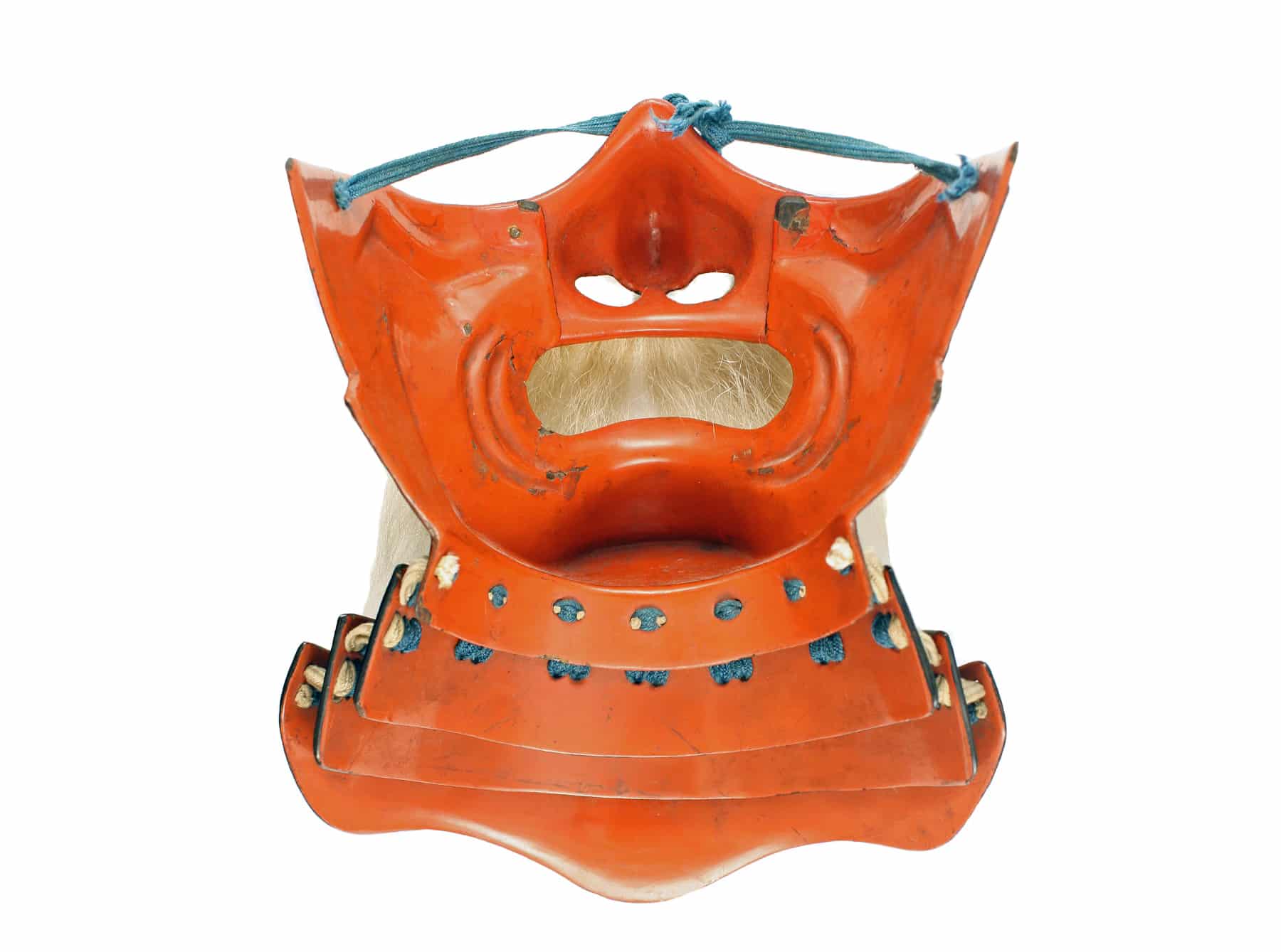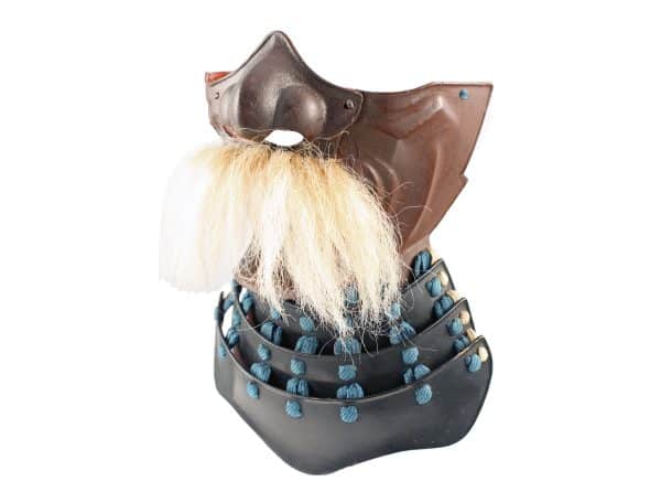 A Good Mempo, Mid Edo Period (circa 1750). An excellent example of a ressei men (furious power), with strong facial features including a well forged chin and kuchi (moustache) of white yak hair, three lame kuro urushi sugakake odoshi tare (three plate black lacquered throat guard) aced in blue silk. The interior lacquered red.