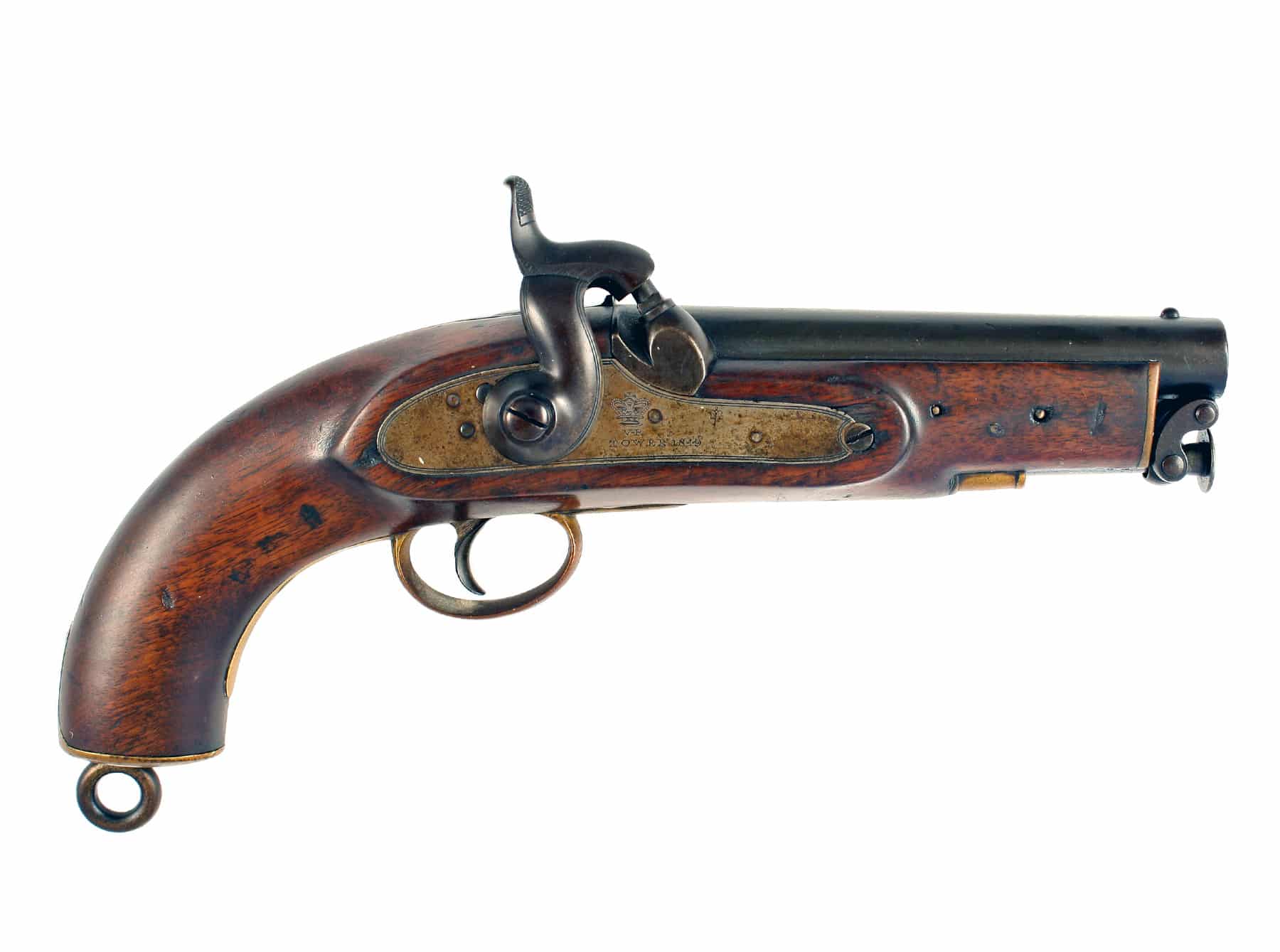 A Percussion Sea Service Pistol, Dated 1849. With round barrel struck with numerous Government viewing and proof marks, border engraved lock, stamped with crowned VR and TOWER 1849, full stocked in walnut, stamped with stockers marks beneath the belt hook, brass mounts comprising trigger guard, butt cap with lanyard ring, and captive ramrod pipe and fitted with captive ramrod. In good clean order.